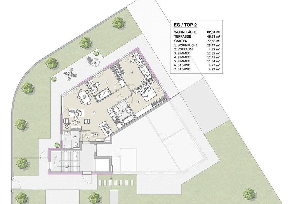 Die ca. 46,73 m² große Terrasse und der ca. 78 m² große Eigengarten bieten außergewöhnlich viel Platz im Freien – eine grüne Oase direkt vor der Tür. Hier lassen sich Natur und Privatsphäre perfekt verbinden.