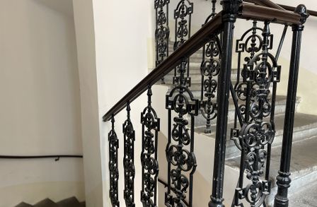 Originale Mosaikfliesen und kunstvolle Stiegenhausgeländer
