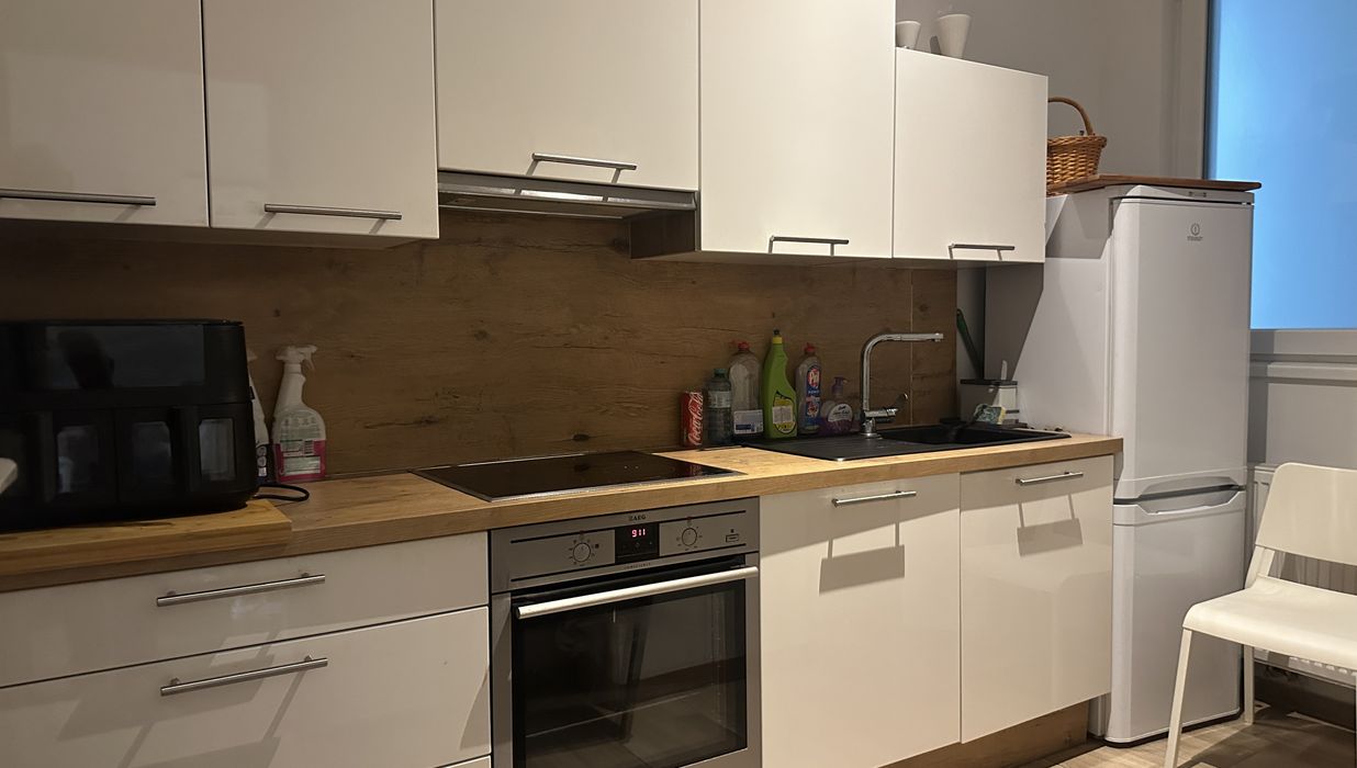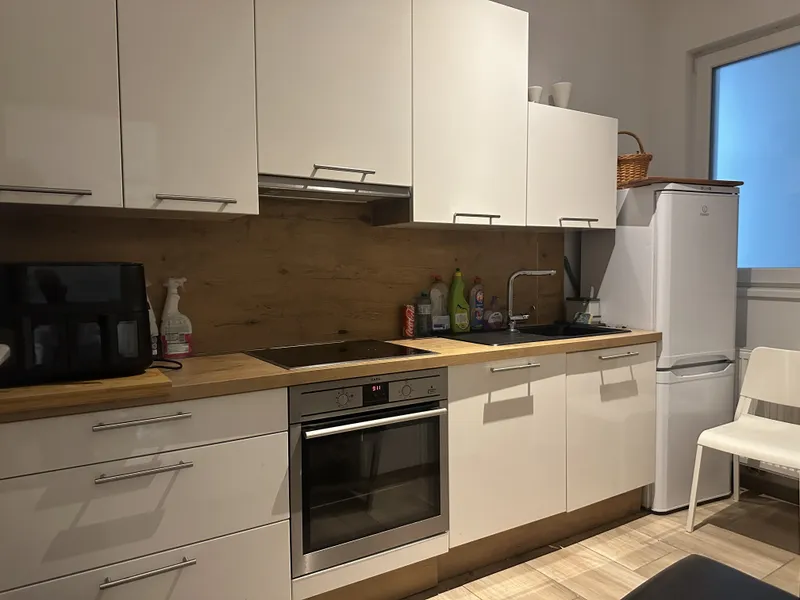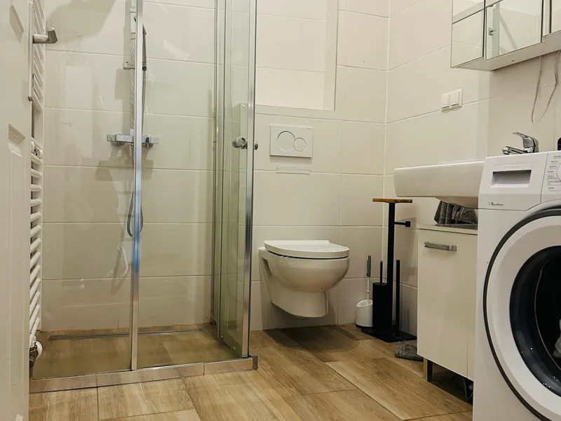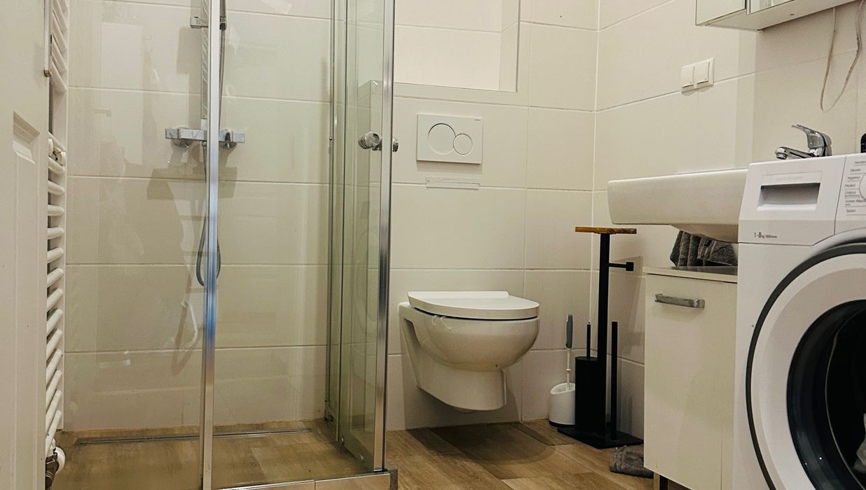 Die Einbauküche mit modernen, fast unbenutzten Geräten ist ein weiteres Highlight dieser Immobilie. Das Badezimmer ist mit einer komfortablen Dusche ausgestattet. Hier befinden sich auch der Waschmaschinenanschluss und das WC.