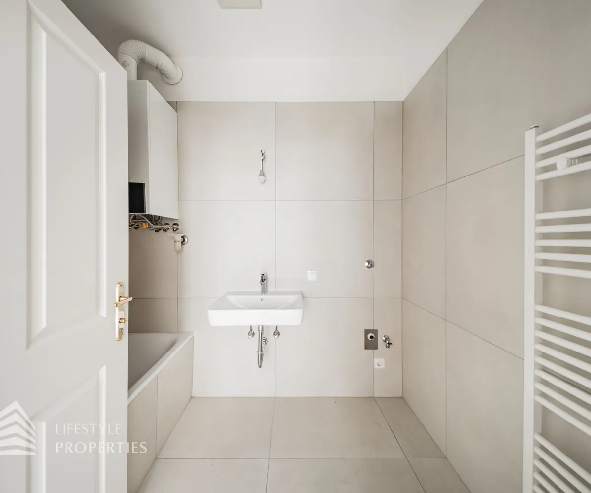 Sie betreten die Wohnung und befinden sich im Vorraum, geradeaus befindet sich das Wohnzimmer und eines der Schlafzimmer. Beim Vorraum rechts befindet sich die Küche und der Essbereich. Von hier gelangen Sie auch in die anderen zwei Zimmer. Das Bad ist mit einer Wanne, einem Waschbecken, einem Handtuchtrockner und einem Waschmaschinenanschluss ausgestattet. Die separate Toilette befindet sich im Vorraum.
