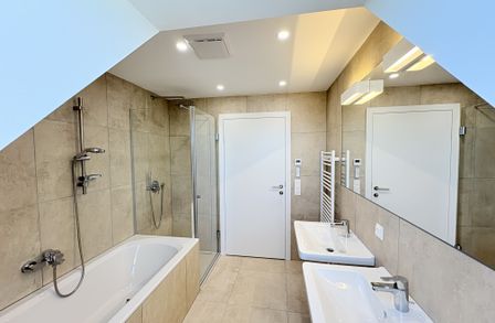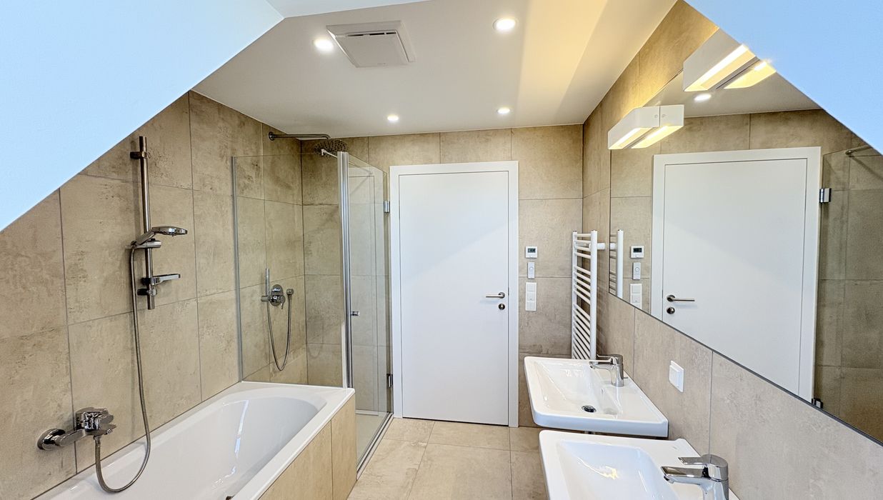 - Badezimmer mit Badewanne, zwei Handwaschbecken, Dusche und Handtuchheizkörper