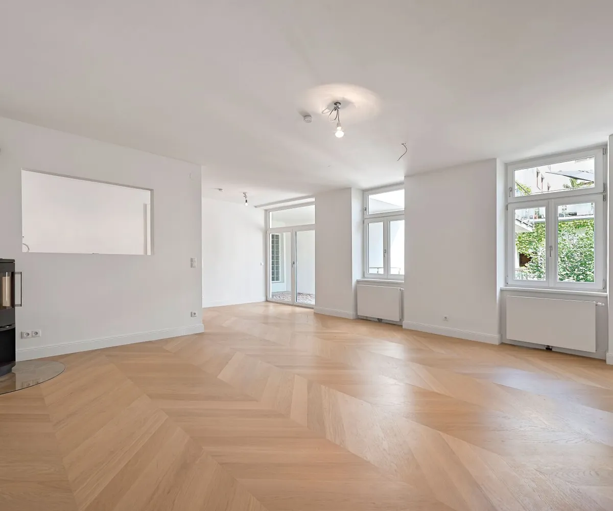 Die Wohnung wurde kürzlich einer umfassenden Generalsanierung unterzogen, wobei größter Wert auf eine gelungene Kombination aus Stil-Altbau-Elementen und Moderne auf höchstem Niveau gelegt wurde. So wurde im gesamten Wohnbereich ein hochwertiger Eichen-Fischgrät-Parkettboden verlegt und die Nassräume mit Feinsteinzug von schlichter Eleganz und stylisch anmutenden Armaturen versehen.