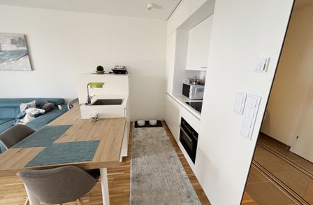 Die Wohnung liegt in der 8. Etage und gliedert sich in eine großzügige Wohnküche, ein Schlafzimmer, ein Badezimmer mit Badewanne und Waschmaschinenanschluss, ein separates WC, einen Abstellraum sowie einen Vorraum. Der ostseitige Balkon rundet das Wohnerlebnis perfekt ab.