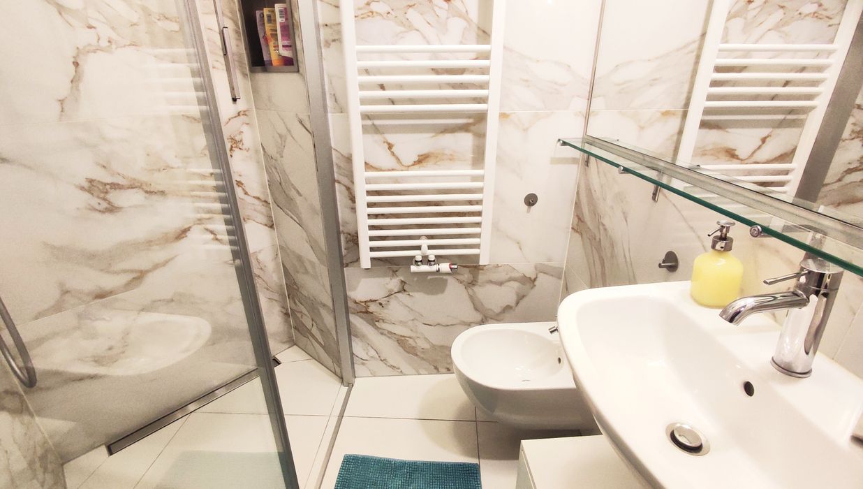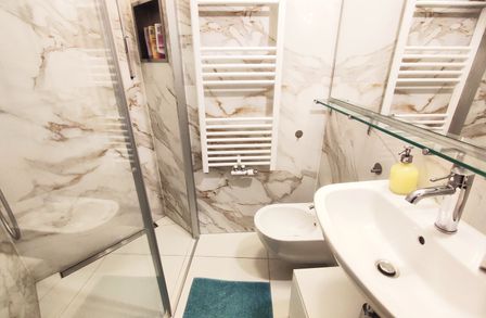 Über den zentralen Vorraum sind sämtliche Räume begehbar. Der große Wohnraum ist mit einer hochwertigen, offenen Küche ausgestattet, welche sich perfekt in den Raum einfügt. Im hofseitigen Schlafzimmer finden Sie den idealen Platz für entspannte Stunden. Das geschmackvolle Bad ist mit einer geräumigen Walk-in-Dusche und einem Bidet ausgestattet, die Toilette mit Handwaschbecken separat.