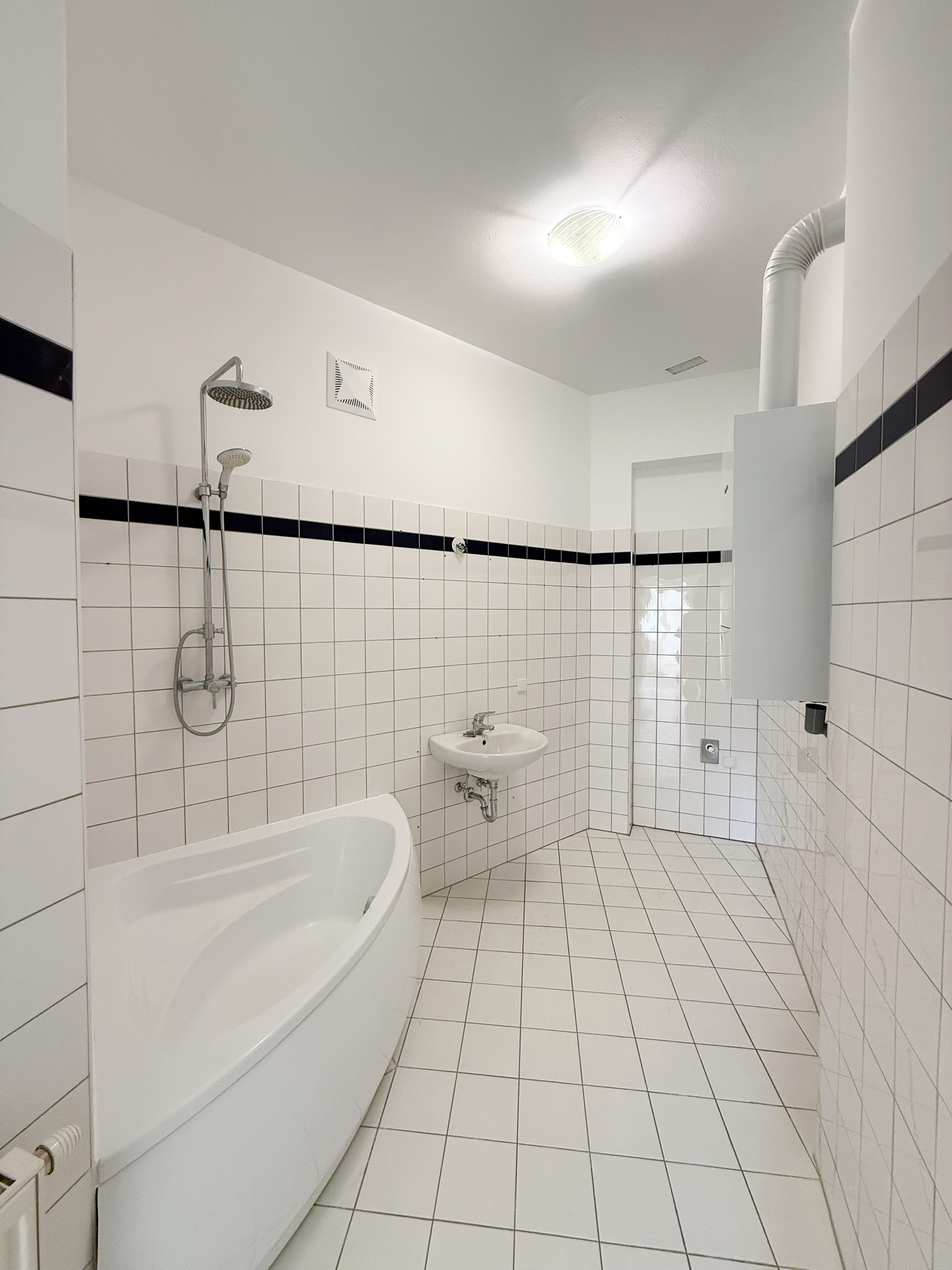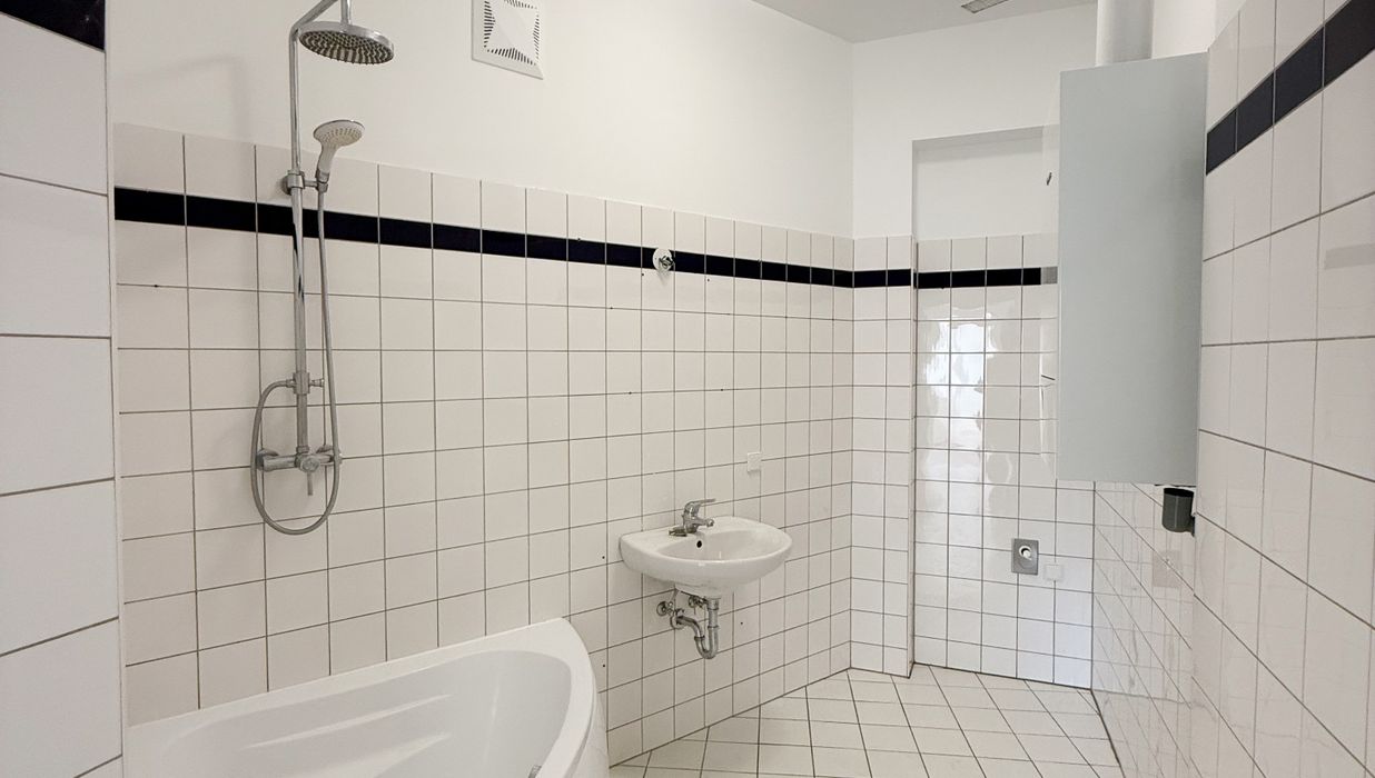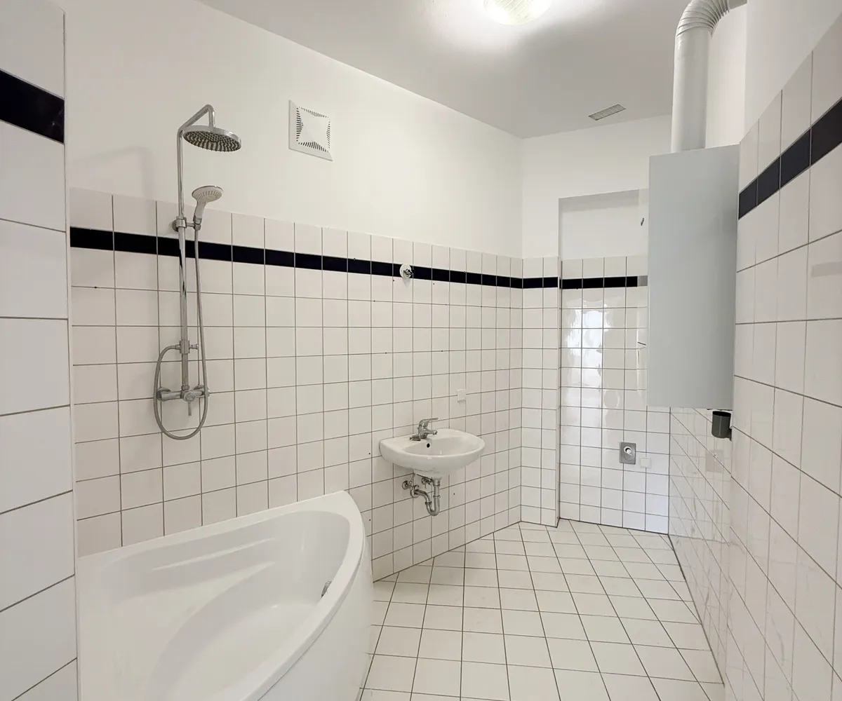 Badezimmer – mit Badewanne, Waschbecken und Waschmaschinenanschluss