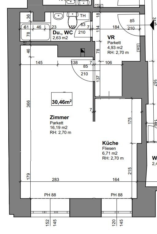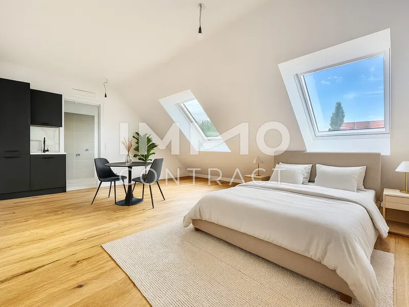 Die Wohnung selbst liegt im Erdgeschoss und ist straßenseitig ausgerichtet. Die Wohnung verfügt über eine Fläche von rund 30,46 m². Vom Vorraum ist das Badezimmer mit Toilette und Dusche, sowie der Wohnbereich zu erreichen. Das offene Raumkonzept bietet mit einer Fläche von 22,90 m² viel Raum für Küche, sowie Wohn- und Schlafbereich. Das ideale Layout für eine smarte 1-Zimmer Lösung.