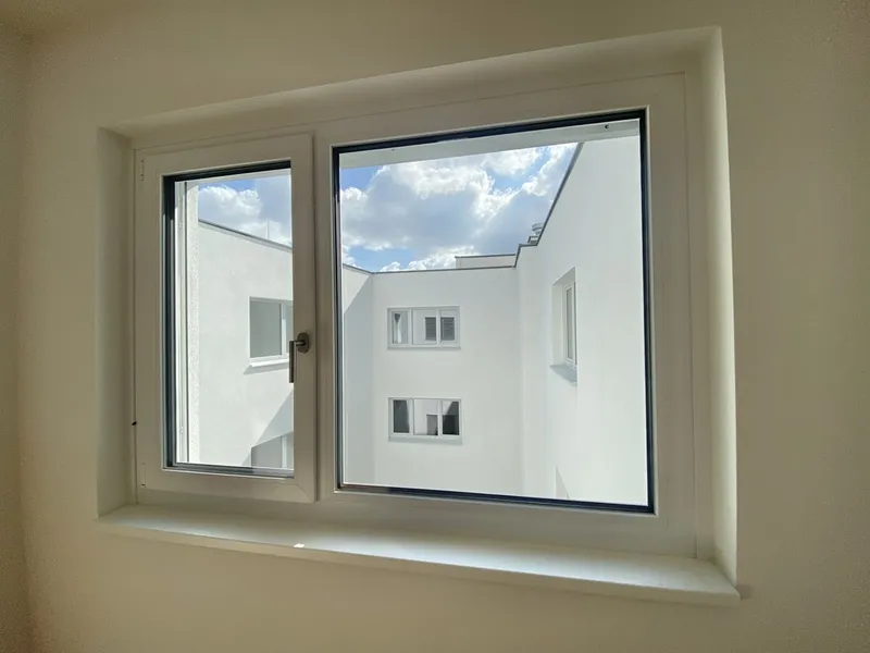 Moderne Fenster mit Doppelverglasung sorgen für angenehme Ruhe und die Trockenbauwände im Bereich der Küche erlauben Flexibilität im Grundriss.
