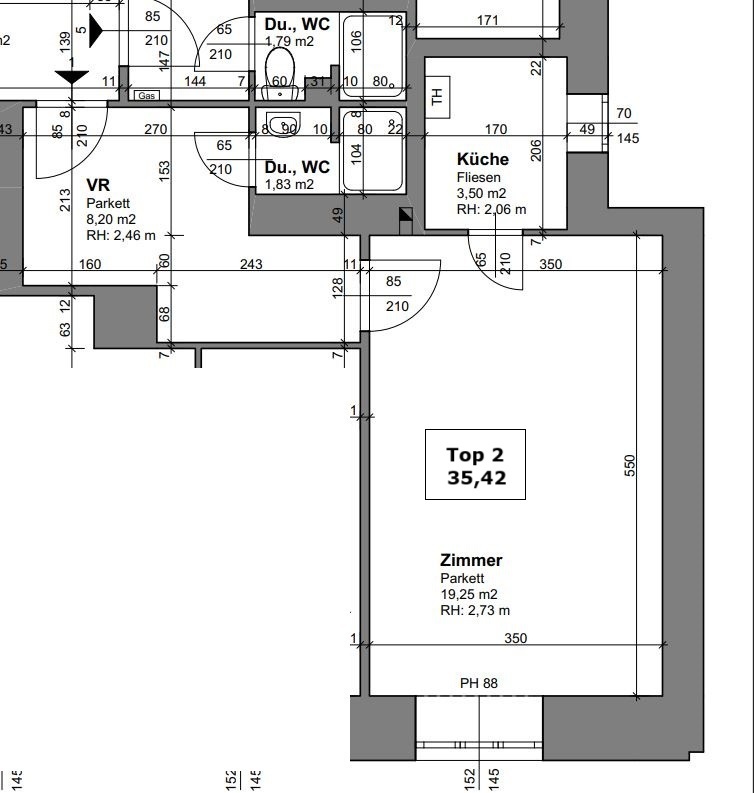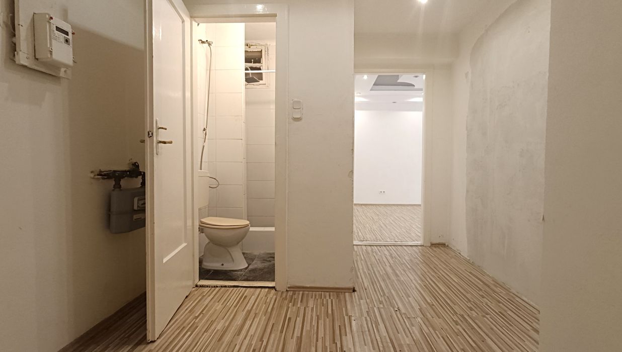 Die Wohnung selbst liegt im Erdgeschoss und ist straßenseitig ausgerichtet. Die Wohnung verfügt über eine Fläche von rund 35,42 m² Wohnfläche. Der Vorraum bietet mit einer Fläche von rund 8,20 ausreichend Platz für Garderobe und Schrankverbau. Das Badezimmer bedarf einer kompakten Lösung aus Dusche und Toilette auf einer Fläche von rund 1,83 m².