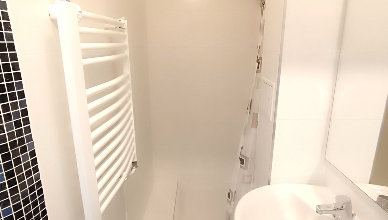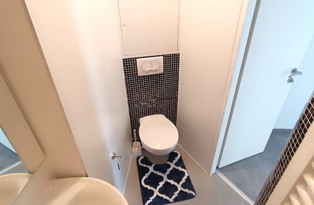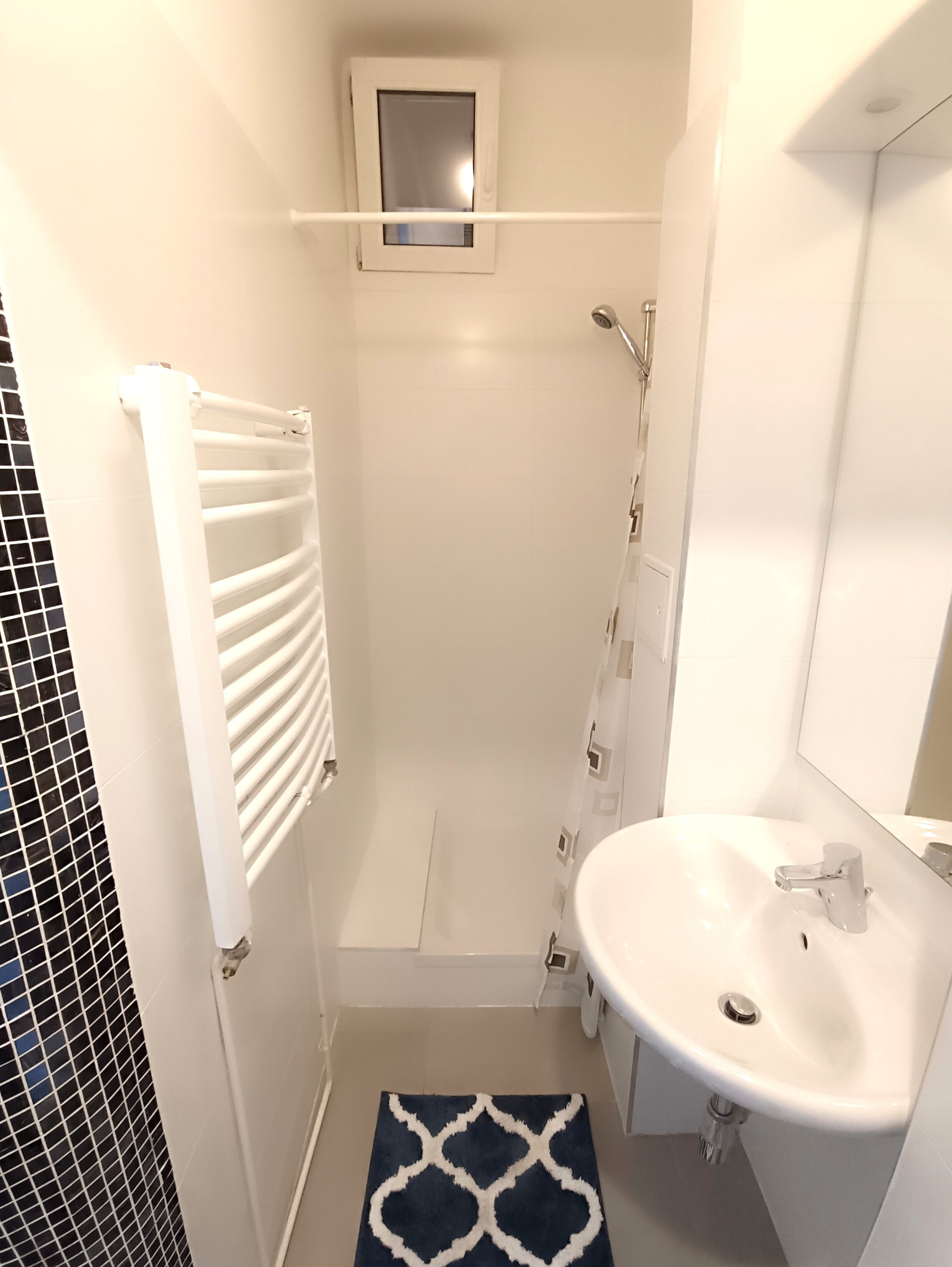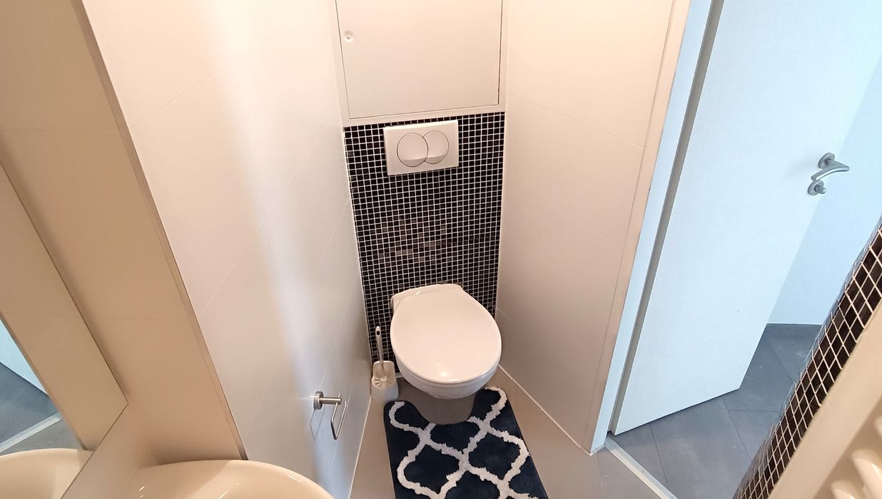 Das Badezimmer ist mit einer Kombination aus grauen Bodenfliesen, weißen Wandfliesen, sowie Mosaikfliesen in Dunkelblau nicht nur optisch ansprechend, sondern bietet mit Dusche, Handtuch-Heizkörper, Waschbecken, sowie Toilette eine effektive Nutzung der 2,69 m² Fläche. Klein aber fein ist auch hier die Devise und einem entspannten Start in den Tag steht nichts im Weg.