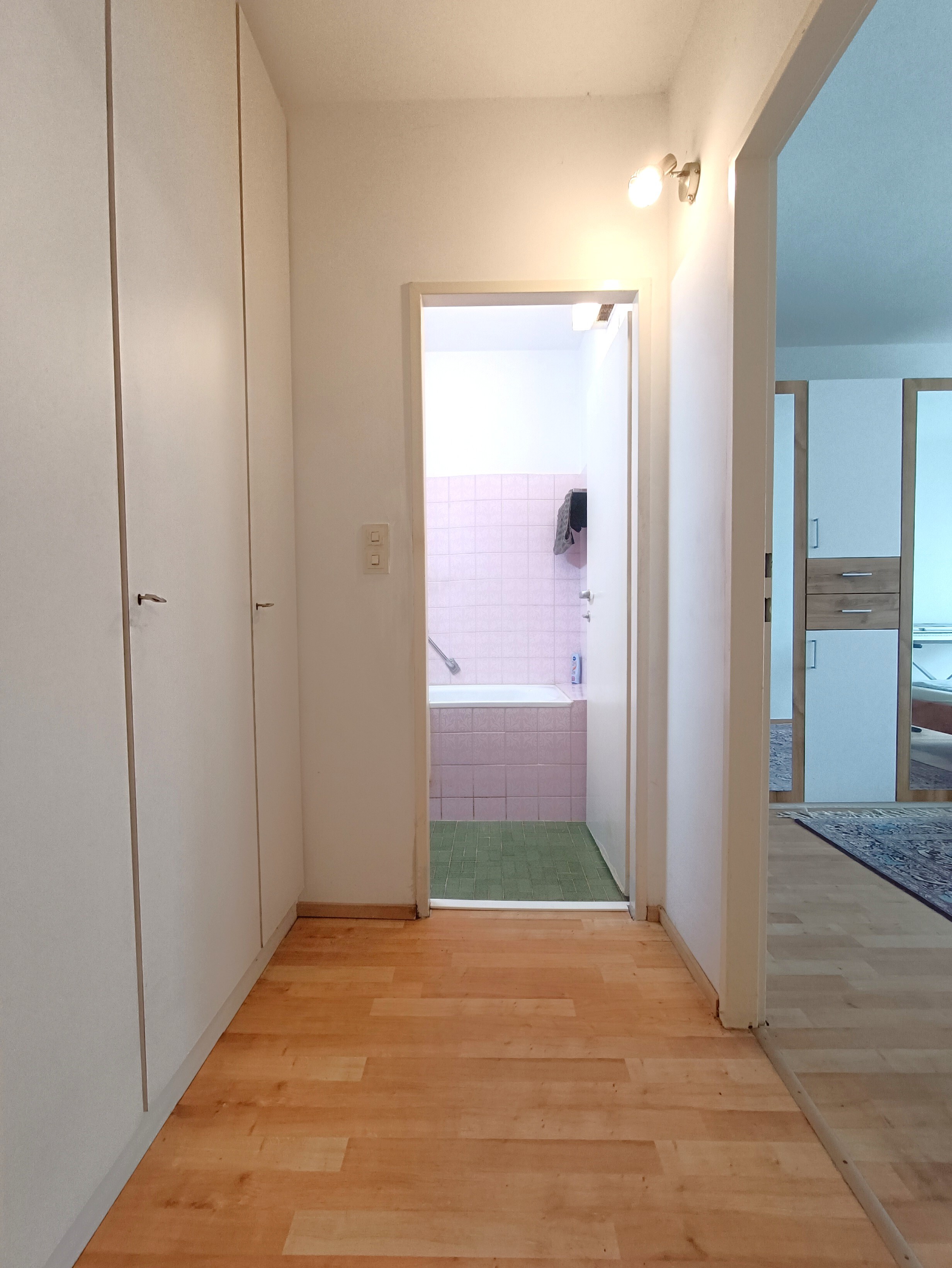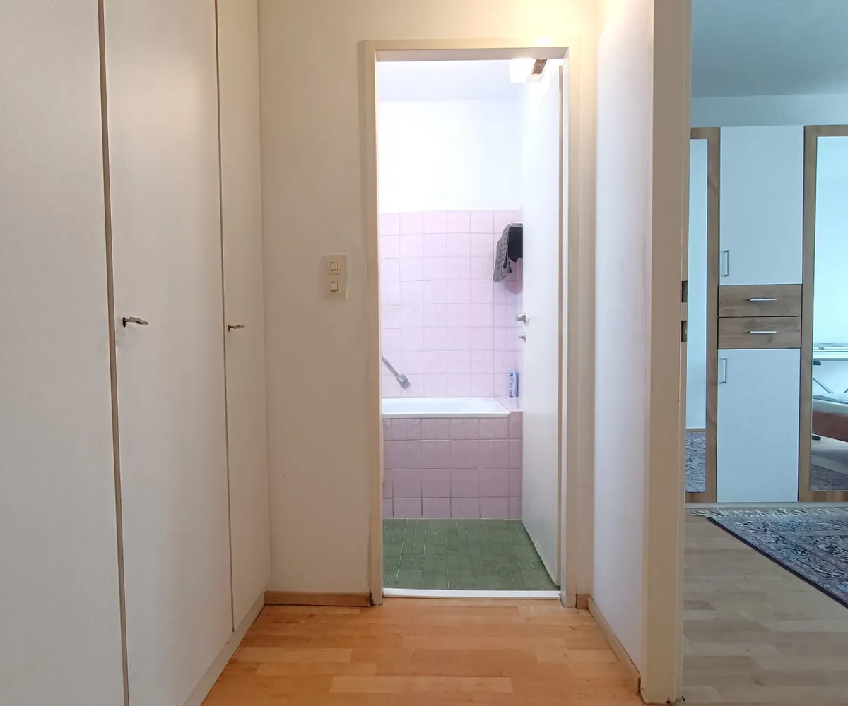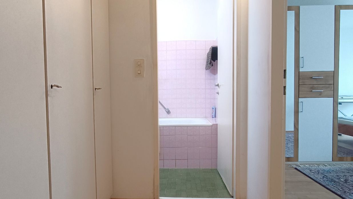 Das Schlafzimmer erreichen Sie vom Wohnzimmer aus und im Gangbereich erwartet Sie zusätzlicher Platz für einen Einbauschrank. Das Badezimmer kann Ihr kleiner, aber ganz privater Rückzugsort werden und verfügt im aktuellen Zustand über eine Badewanne. Die Toilette ist separat und vom Vorraum aus zu betreten. Ebenso im Vorraum ein zusätzlicher Abstellraum, welcher das Raumangebot erweitert.