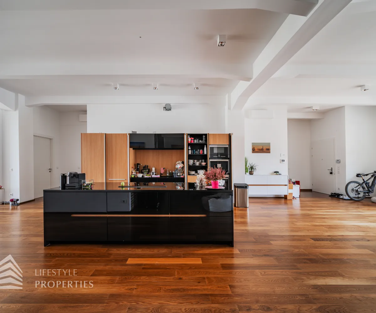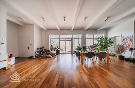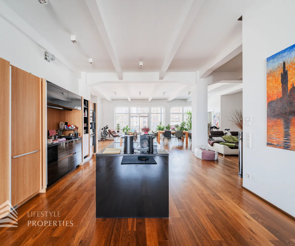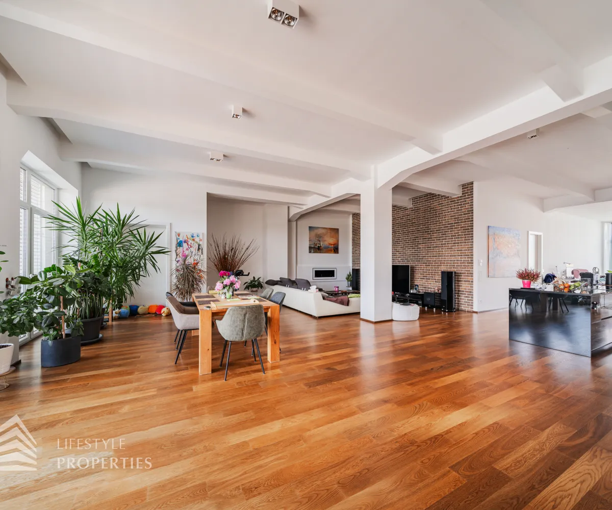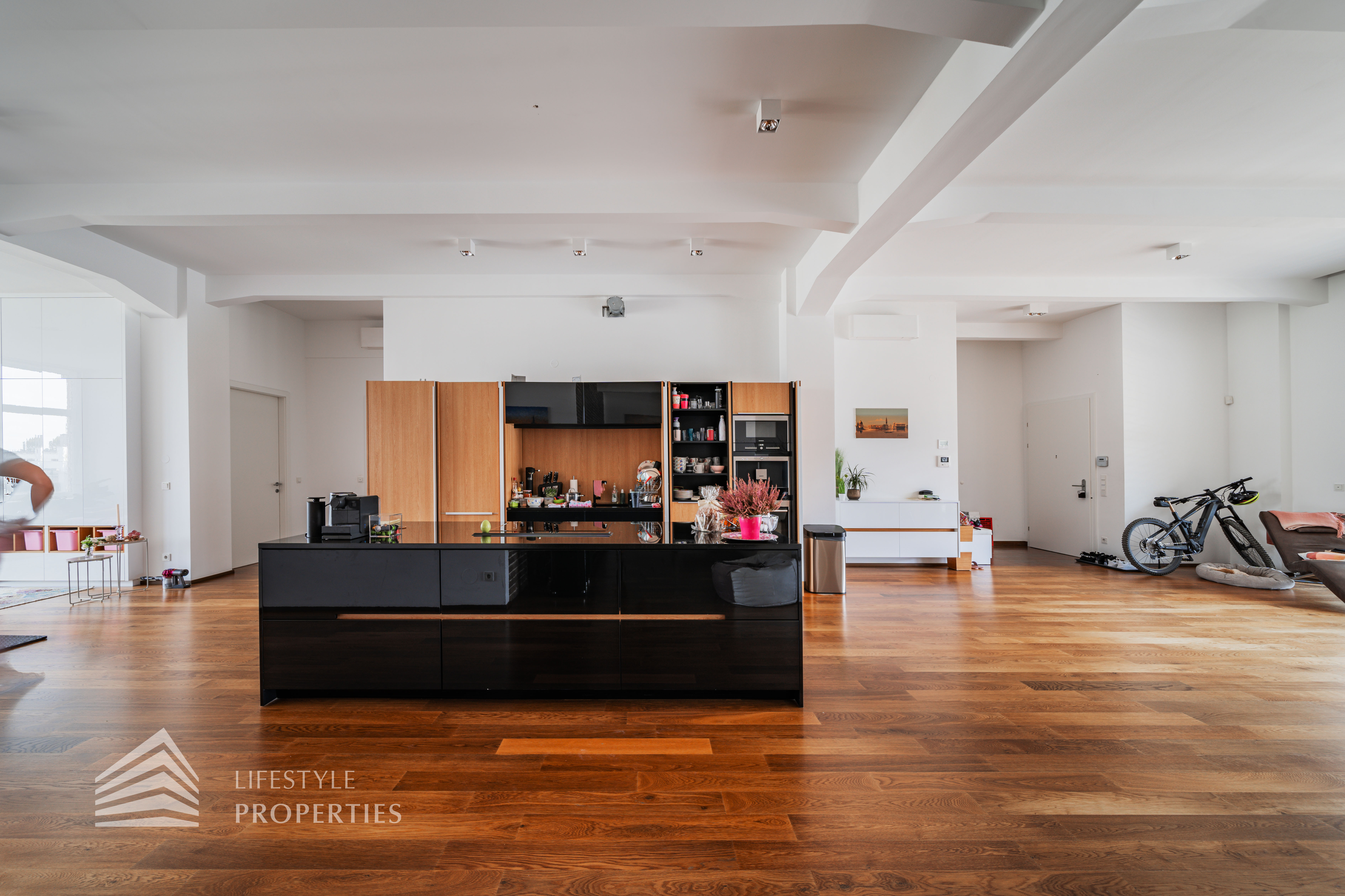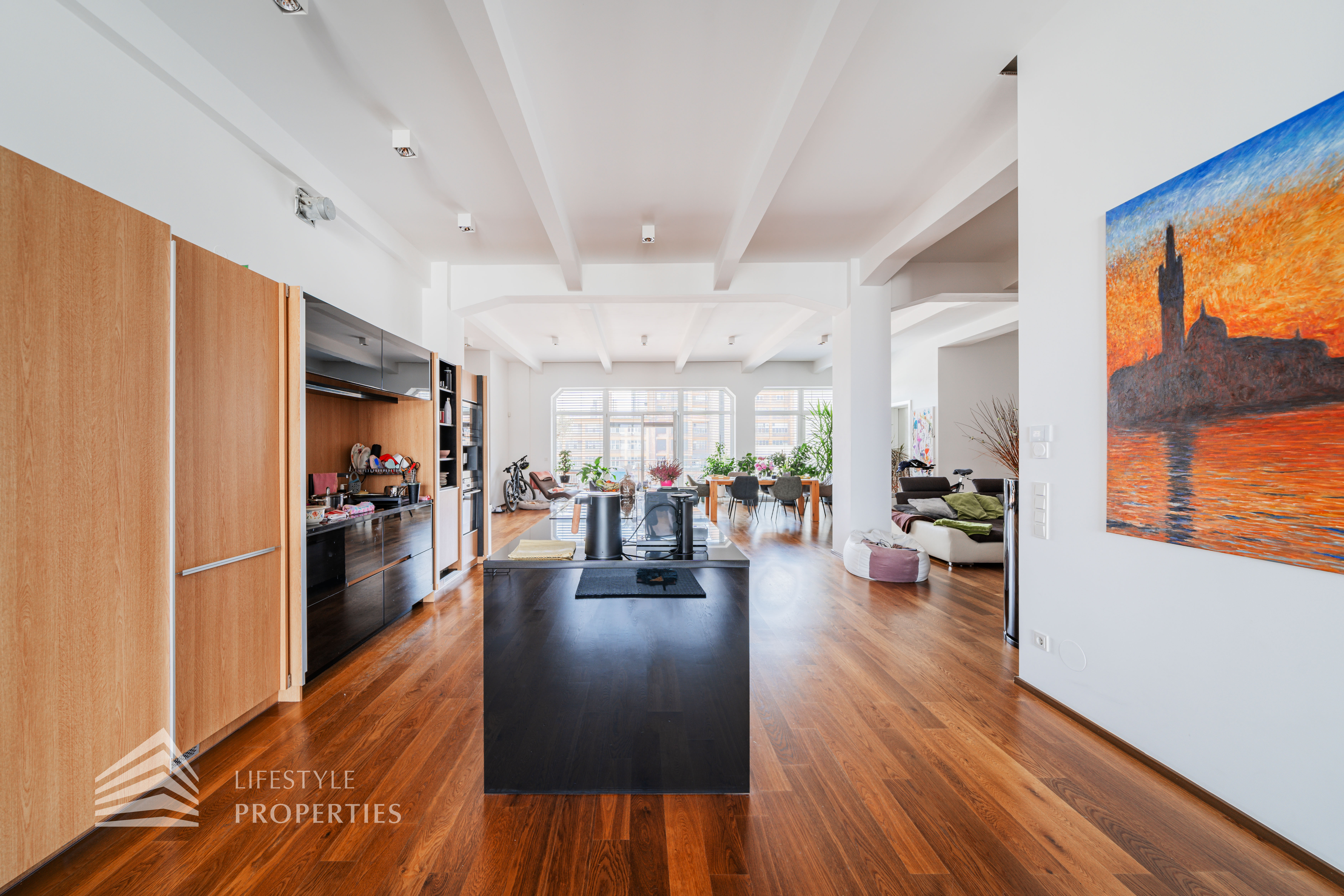 Die Wohnung befindet sich im 4. Liftstock eines im Jahr 1900 erbauten, gepflegten Gebäudes und bietet eine Wohnfläche von ca. 237 m². Sie teilt sich auf in einen Vorraum, eine Garderobe, einen großen Wohn-/Essbereich, zwei weitere Zimmer, zwei Bäder, ein Gäste-WC, einen begehbaren Kleiderschrank sowie einen Abstellraum. Die Haupträume der Immobilie sind mit hochwertigem Parkett ausgekleidet, die Nassräume sind gefliest. Das Highlight des Lofts sind zweifellos die offene Gestaltung der Räume, die Raumhöhe von bis zu ca. 4,2 m sowie der ca. 23 m² große Balkon. Zusätzlich sind dem Objekt ein Tiefgaragenstellplatz sowie ein ca. 6 m² großes Kellerabteil zugeordnet. Der Stellplatz ist im Kaufpreis bereits inbegriffen.