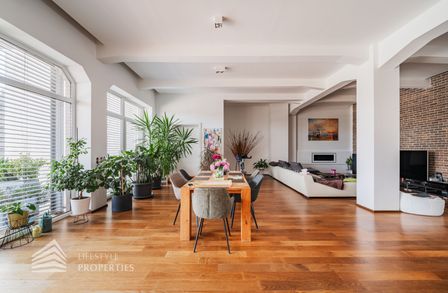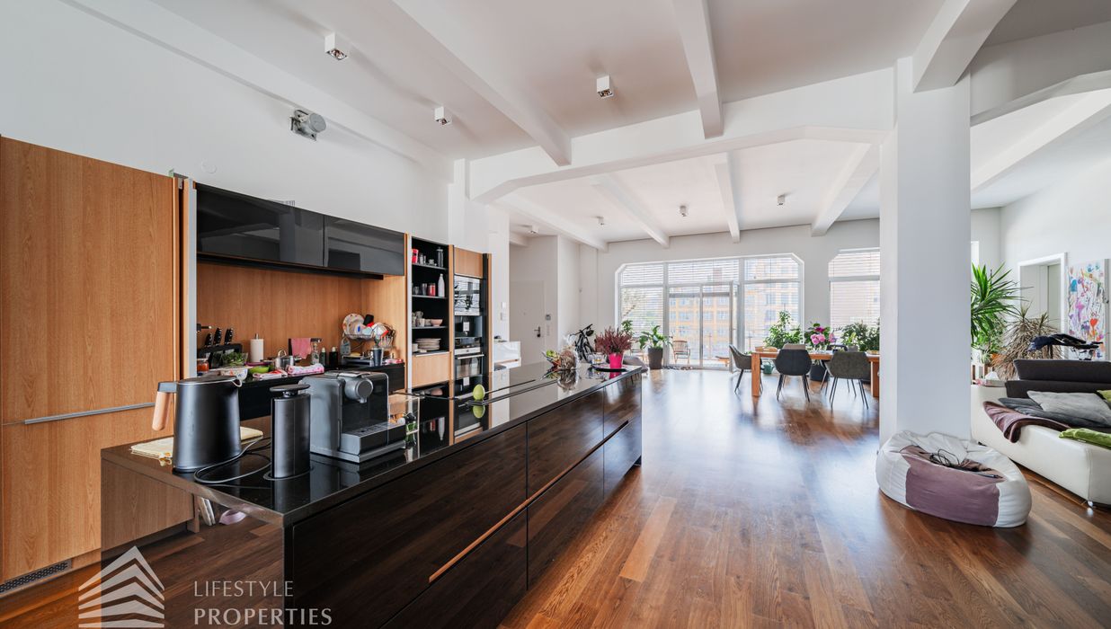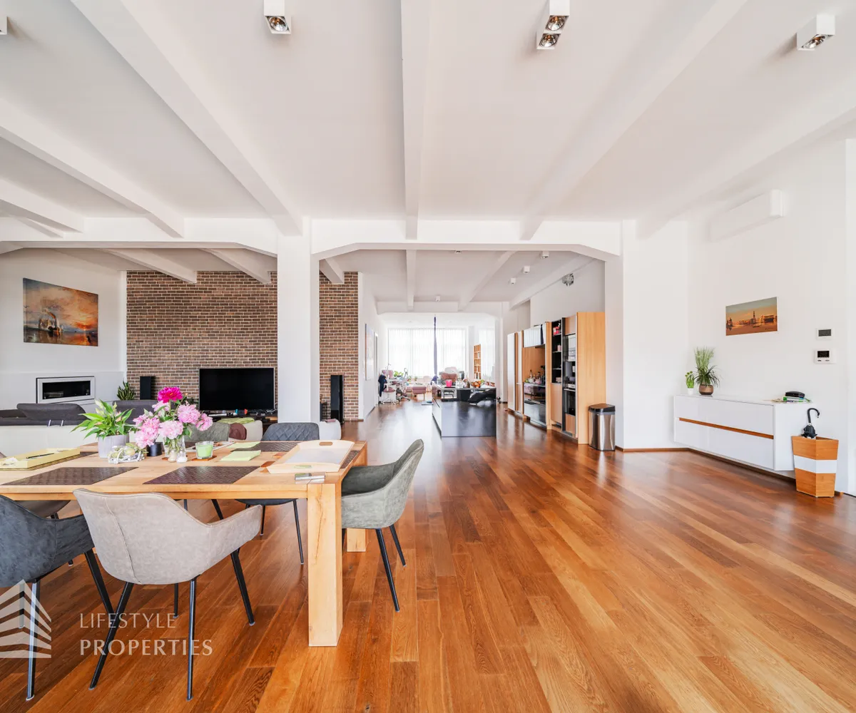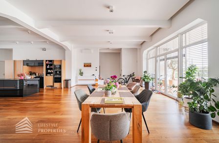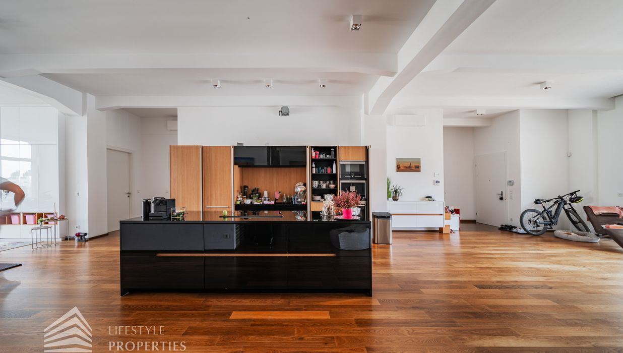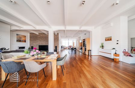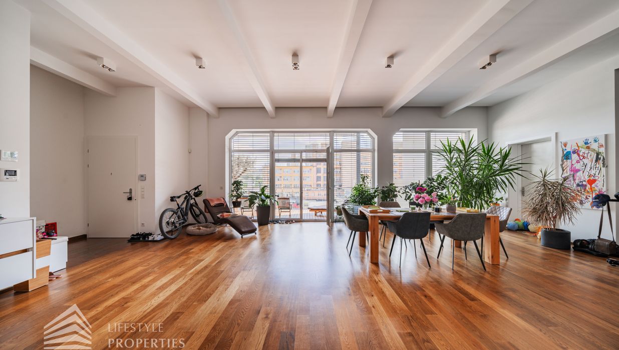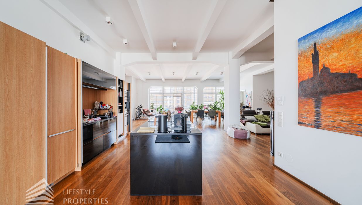 Die Wohnung befindet sich im 4. Liftstock eines im Jahr 1900 erbauten, gepflegten Gebäudes und bietet eine Wohnfläche von ca. 237 m². Sie teilt sich auf in einen Vorraum, eine Garderobe, einen großen Wohn-/Essbereich, zwei weitere Zimmer, zwei Bäder, ein Gäste-WC, einen begehbaren Kleiderschrank sowie einen Abstellraum. Die Haupträume der Immobilie sind mit hochwertigem Parkett ausgekleidet, die Nassräume sind gefliest. Das Highlight des Lofts sind zweifellos die offene Gestaltung der Räume, die Raumhöhe von bis zu ca. 4,2 m sowie der ca. 23 m² große Balkon. Zusätzlich sind dem Objekt ein Tiefgaragenstellplatz sowie ein ca. 6 m² großes Kellerabteil zugeordnet. Der Stellplatz ist im Kaufpreis bereits inbegriffen.