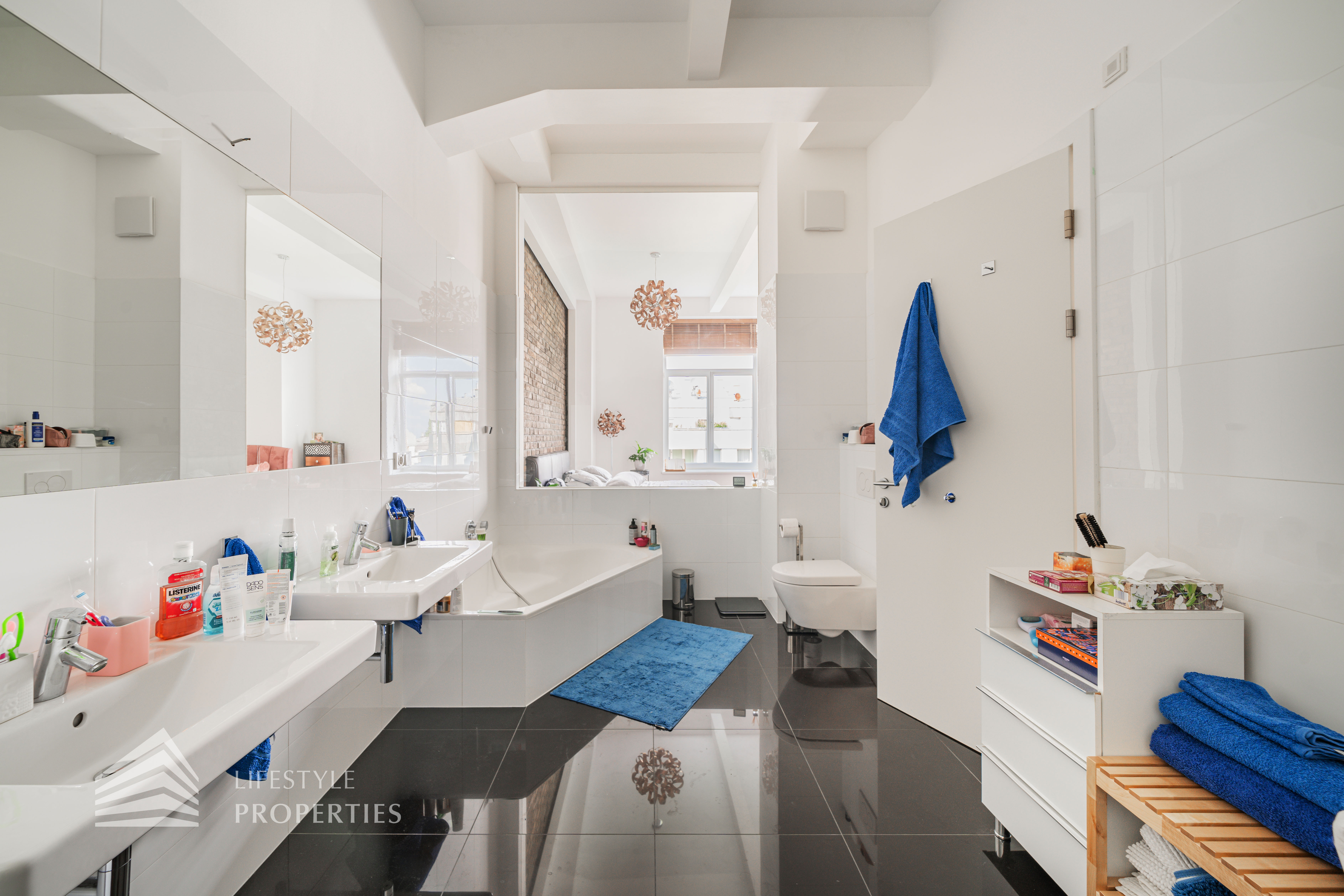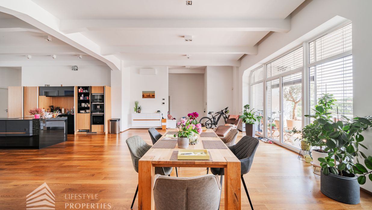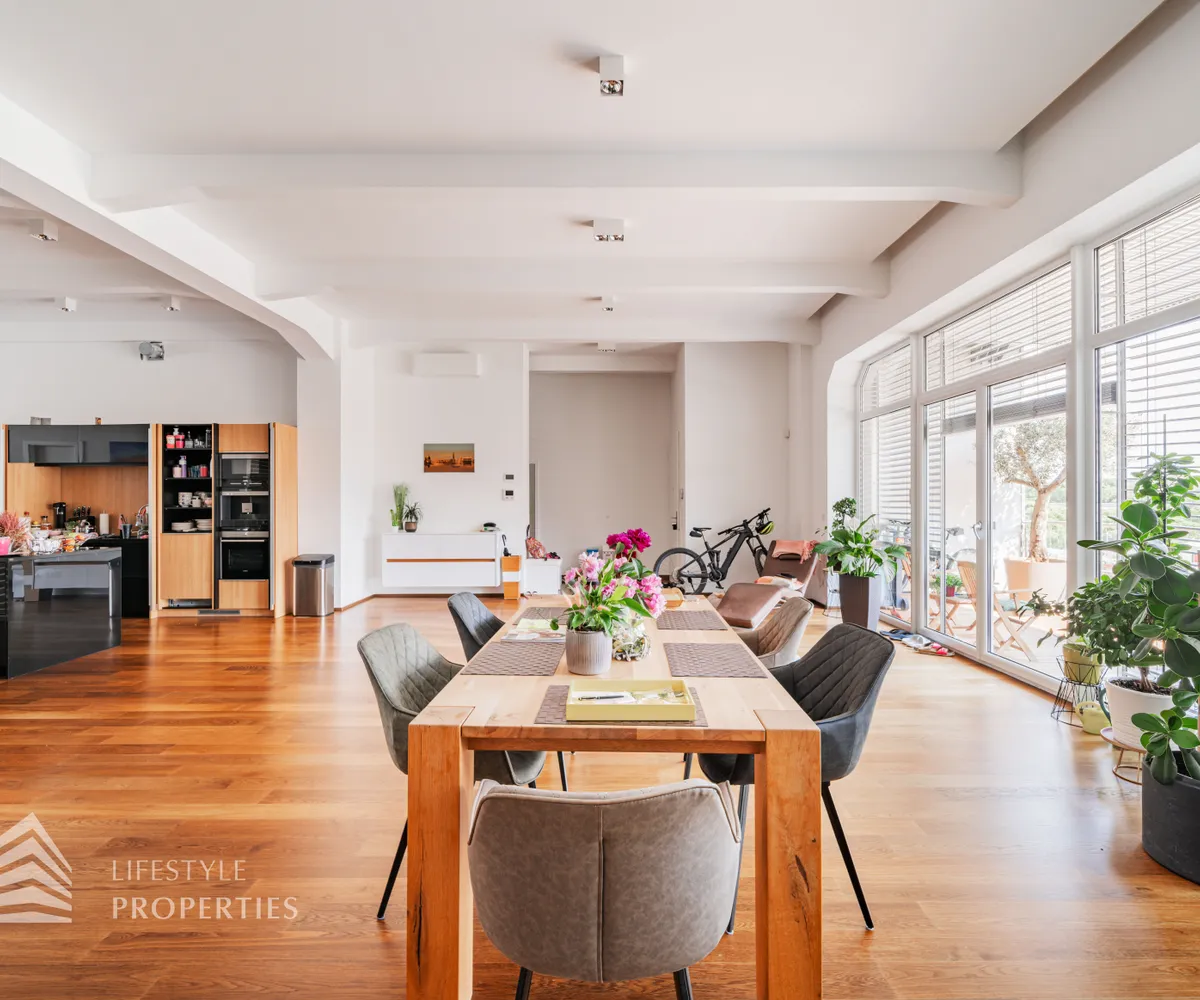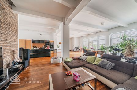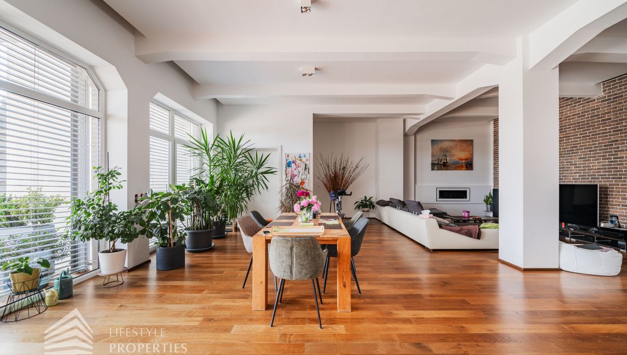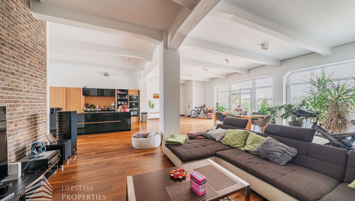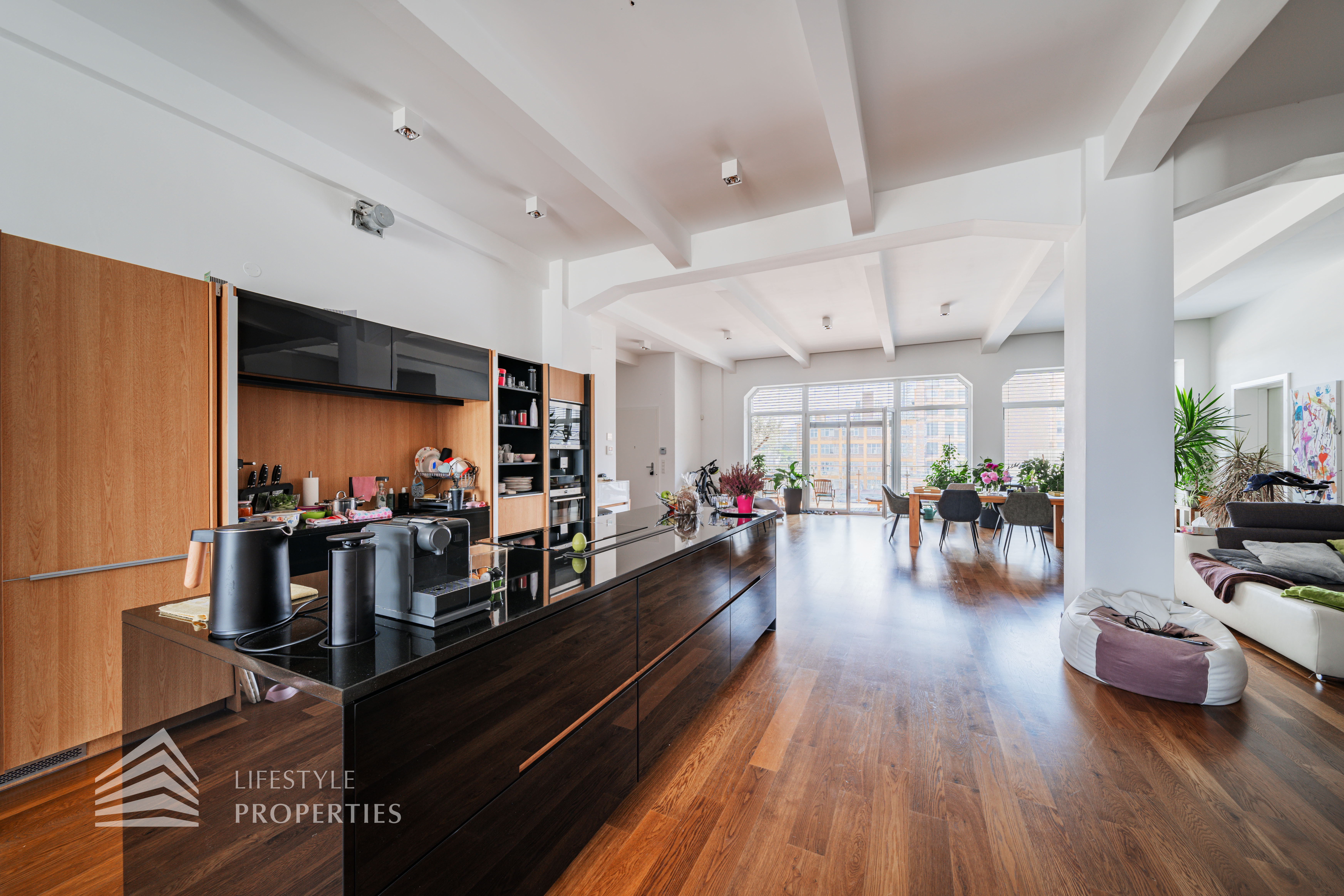 Die Wohnung befindet sich im 4. Liftstock eines im Jahr 1900 erbauten, gepflegten Gebäudes und bietet eine Wohnfläche von ca. 237 m². Sie teilt sich auf in einen Vorraum, eine Garderobe, einen großen Wohn-/Essbereich, zwei weitere Zimmer, zwei Bäder, ein Gäste-WC, einen begehbaren Kleiderschrank sowie einen Abstellraum. Die Haupträume der Immobilie sind mit hochwertigem Parkett ausgekleidet, die Nassräume sind gefliest. Das Highlight des Lofts sind zweifellos die offene Gestaltung der Räume, die Raumhöhe von bis zu ca. 4,2 m sowie der ca. 23 m² große Balkon. Zusätzlich sind dem Objekt ein Tiefgaragenstellplatz sowie ein ca. 6 m² großes Kellerabteil zugeordnet. Der Stellplatz ist im Kaufpreis bereits inbegriffen.
