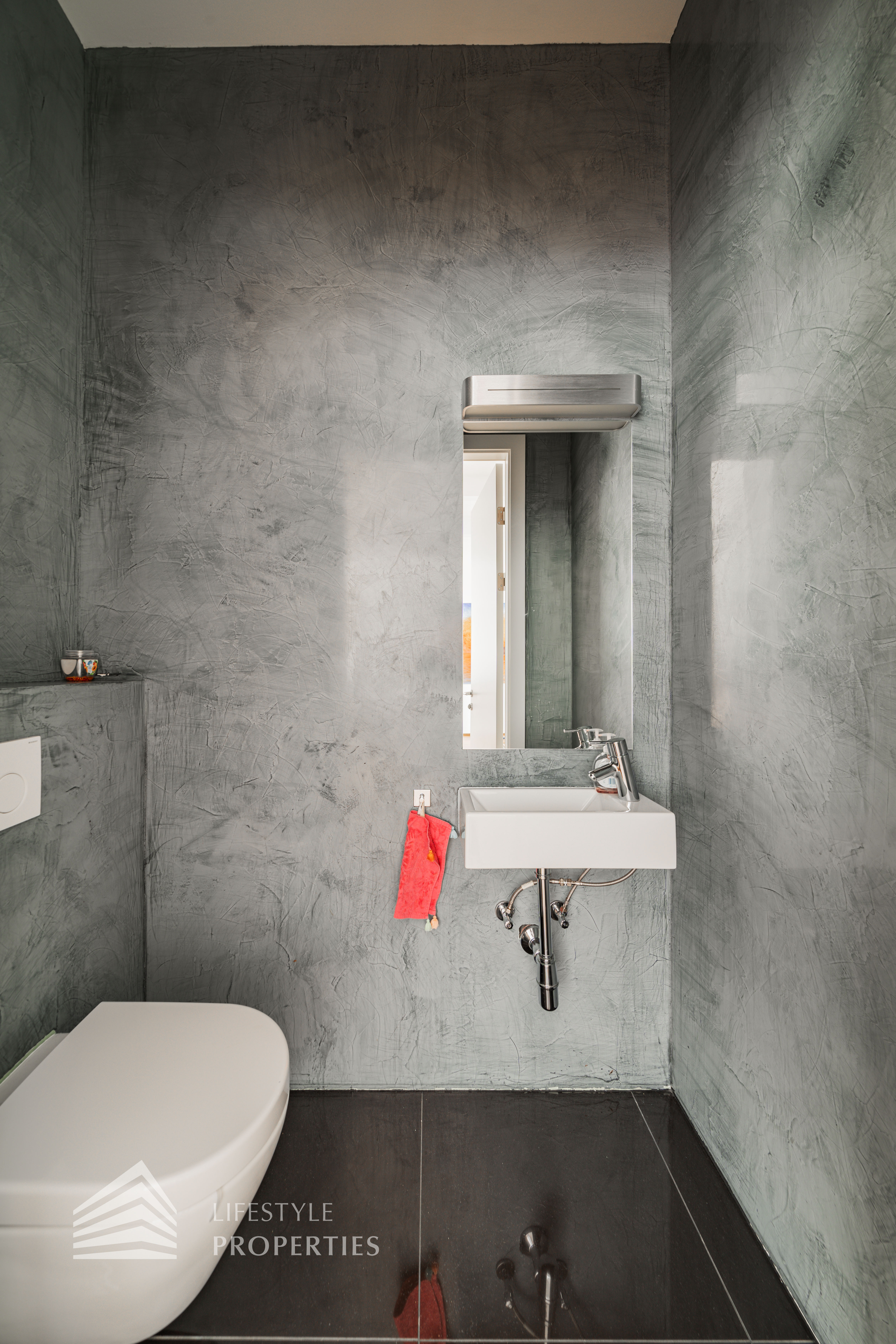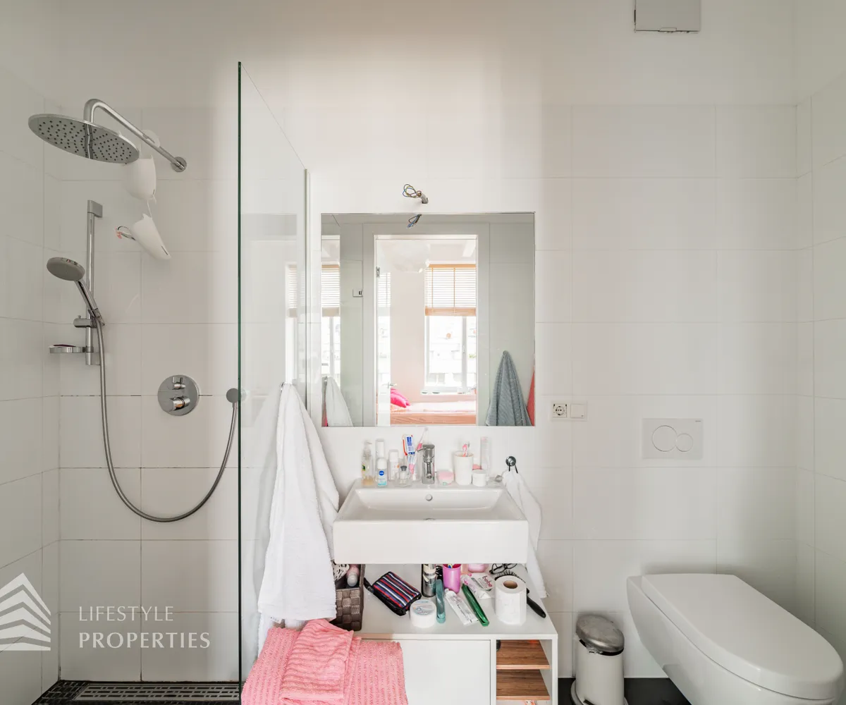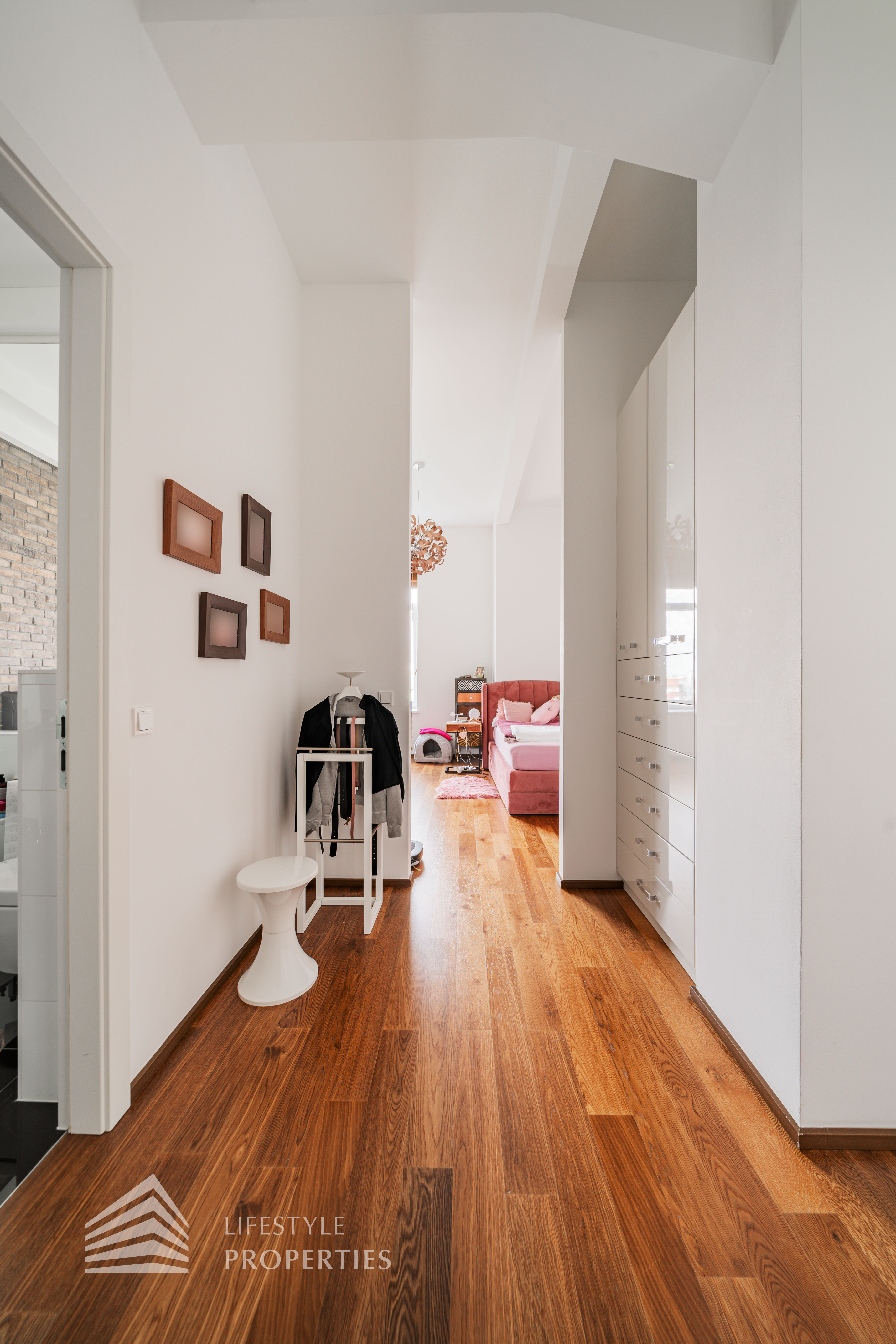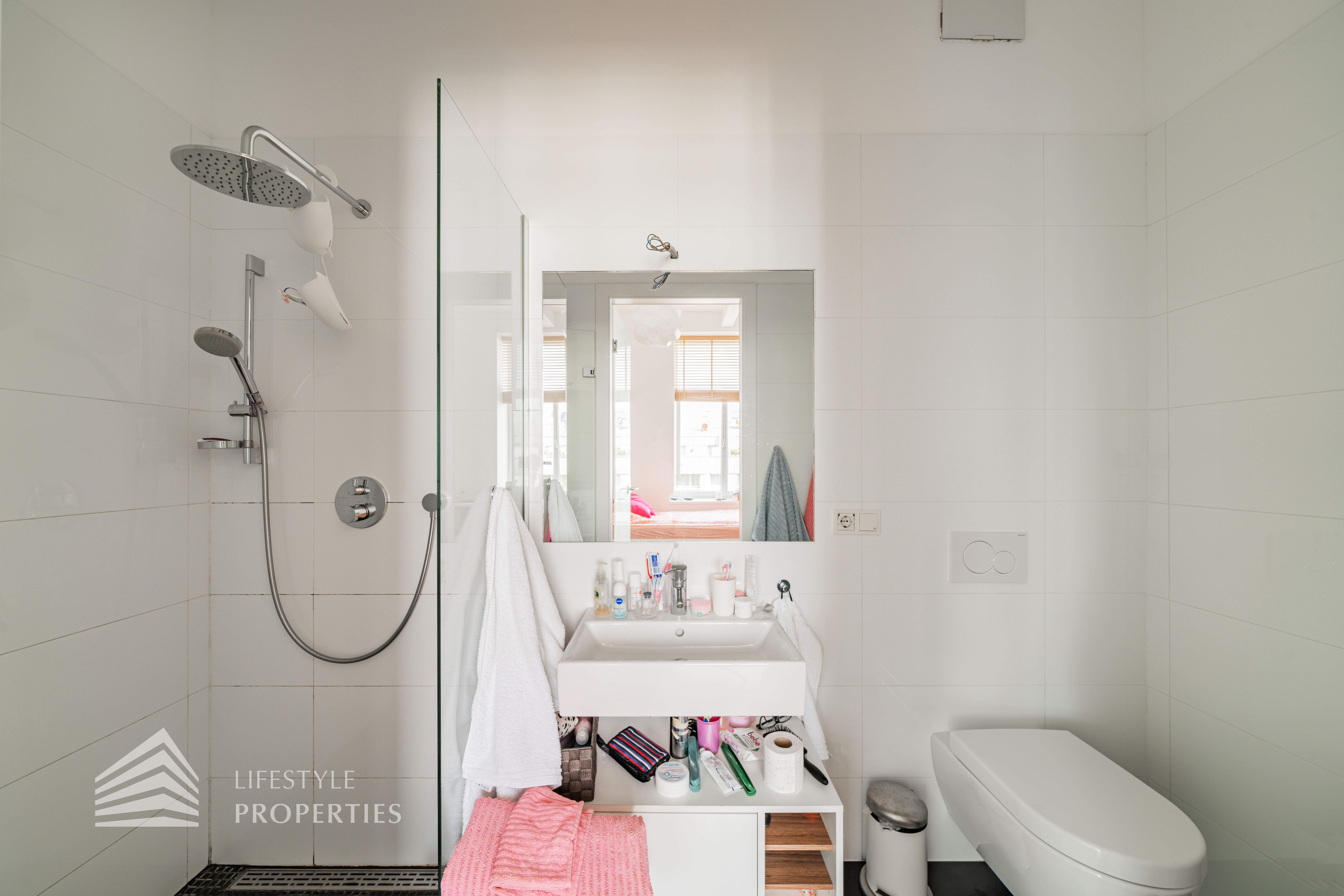 Bei Betreten der Wohnung gelangen Sie in einen kleinen Vorraum mit zusätzlicher Garderobe. Linkerhand erreichen Sie direkt den ca. 144 m² großen Wohn-/Essbereich, welcher durch die offene Raumgestaltung sowie die vielen Fensterfronten eine besonders einladende Atmosphäre schafft. Der Raum lässt sich ideal in einen Wohn- sowie einen Koch- und Essbereich unterteilen. Im Wohnbereich finden Sie einen Ethanol Kamin vor, welcher für besondere Gemütlichkeit sorgt. Die moderne Maßküche mit Kücheninsel und Granitstein ist mit hochwertigen Geräten der Marke Siemens sowie mit einem Induktionsherd ausgestattet. Vom Wohn-/Essbereich gelangen Sie auf den ca. 23 m² großen Balkon, welcher zum Verweilen an der frischen Luft einlädt. Außerdem führt Sie der Raum zu den beiden weiteren Zimmern. Den ca. 18 m² großen Master Bedroom erreichen Sie über einen ca. 7 m² großen, begehbaren Kleiderschrank. Nebenan, ebenfalls über den begehbaren Kleiderschrank betretbar, treffen Sie auf ein großzügiges Badezimmer mit zwei Waschbecken, einer Doppeldusche, einer Badewanne sowie einem separaten WC. Dieses bietet über eine Glaswand einen direkten Blick in den Schlafbereich. Das dritte, ca. 20 m² große Zimmer verfügt über ein Bad en Suite mit Waschbecken, Dusche und WC. Ein großes Fenster versorgt den Raum mit viel Tageslicht. Zusätzlich verfügt die Immobilie über einen ca. 10 m² großen Abstellraum sowie ein Gäste-WC mit Waschbecken, welche beide vom Wohn-/Essbereich aus betreten werden können.