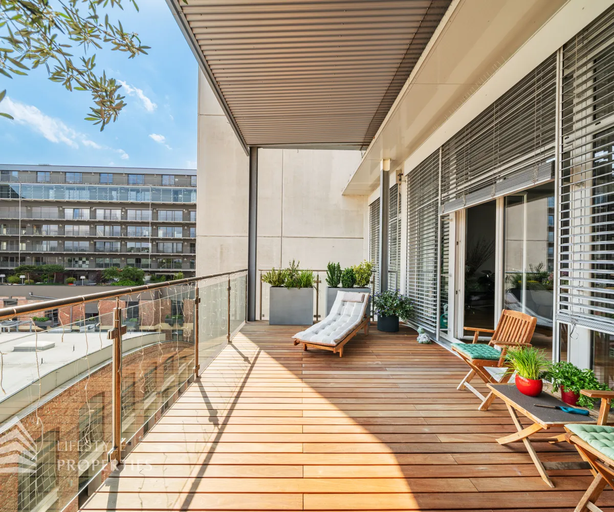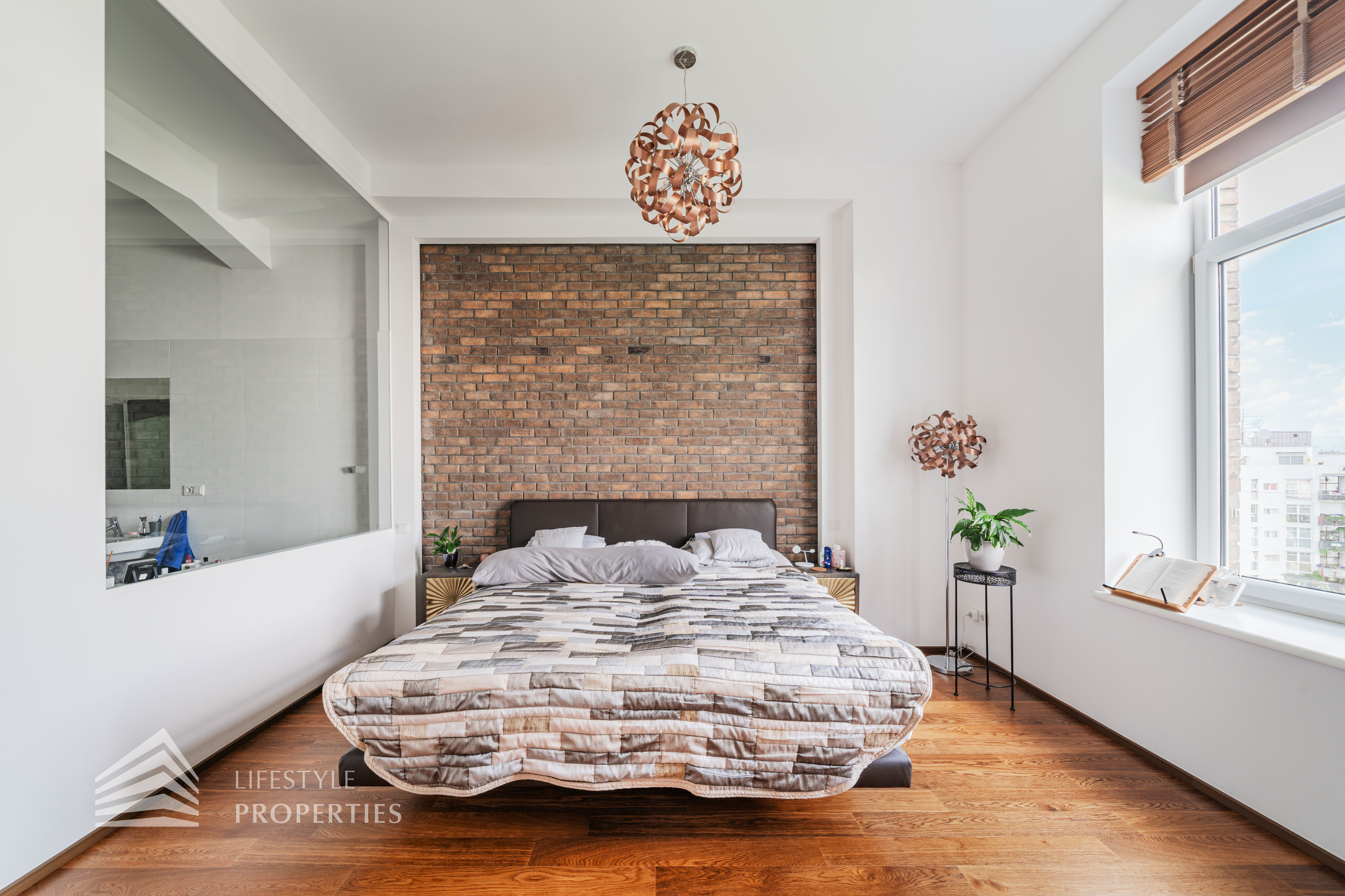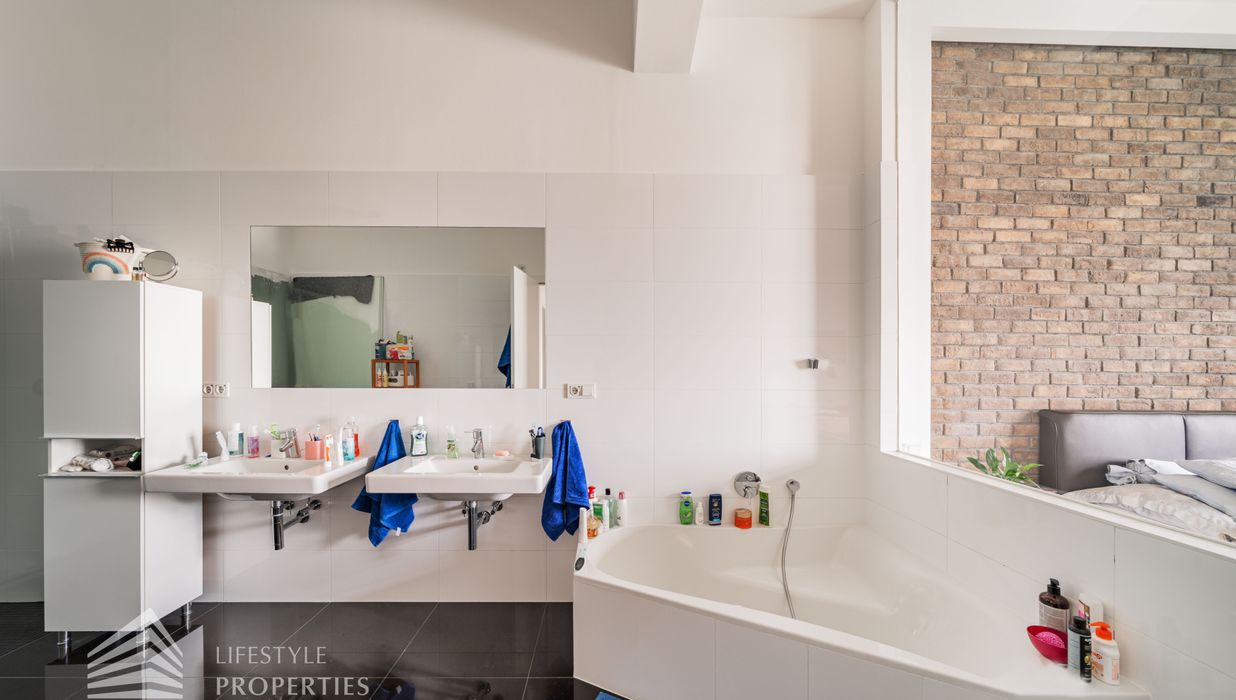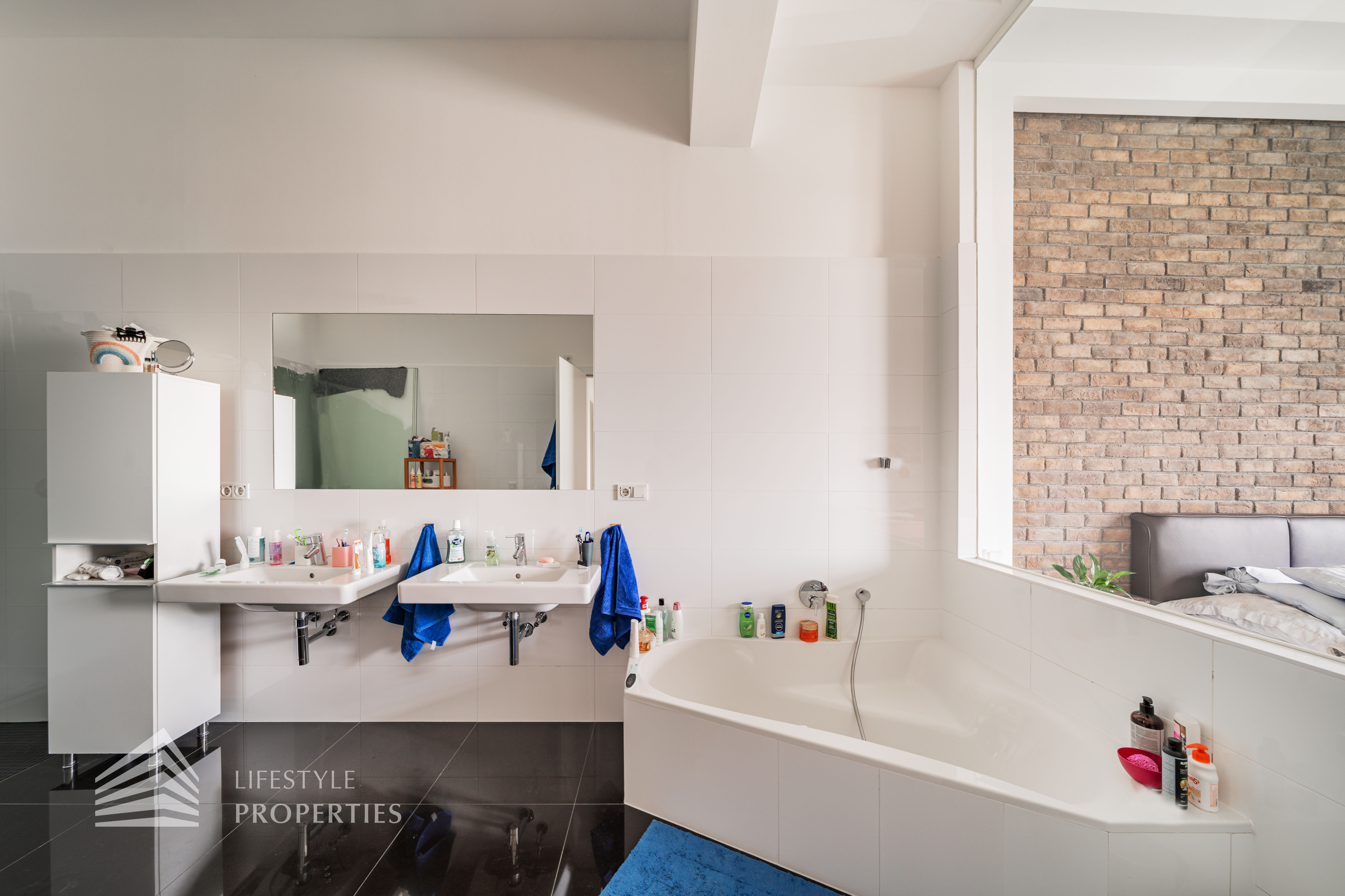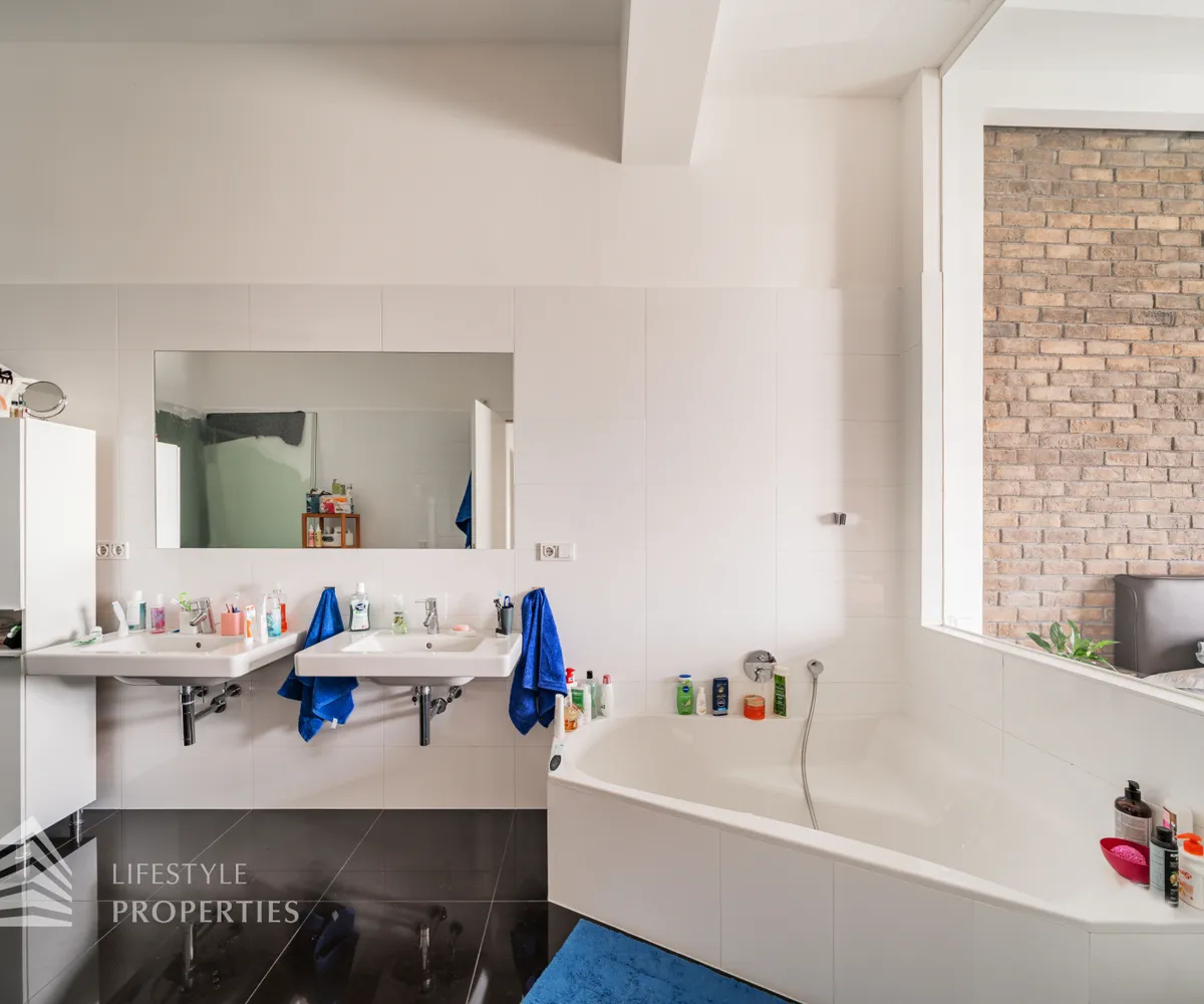 Bei Betreten der Wohnung gelangen Sie in einen kleinen Vorraum mit zusätzlicher Garderobe. Linkerhand erreichen Sie direkt den ca. 144 m² großen Wohn-/Essbereich, welcher durch die offene Raumgestaltung sowie die vielen Fensterfronten eine besonders einladende Atmosphäre schafft. Der Raum lässt sich ideal in einen Wohn- sowie einen Koch- und Essbereich unterteilen. Im Wohnbereich finden Sie einen Ethanol Kamin vor, welcher für besondere Gemütlichkeit sorgt. Die moderne Maßküche mit Kücheninsel und Granitstein ist mit hochwertigen Geräten der Marke Siemens sowie mit einem Induktionsherd ausgestattet. Vom Wohn-/Essbereich gelangen Sie auf den ca. 23 m² großen Balkon, welcher zum Verweilen an der frischen Luft einlädt. Außerdem führt Sie der Raum zu den beiden weiteren Zimmern. Den ca. 18 m² großen Master Bedroom erreichen Sie über einen ca. 7 m² großen, begehbaren Kleiderschrank. Nebenan, ebenfalls über den begehbaren Kleiderschrank betretbar, treffen Sie auf ein großzügiges Badezimmer mit zwei Waschbecken, einer Doppeldusche, einer Badewanne sowie einem separaten WC. Dieses bietet über eine Glaswand einen direkten Blick in den Schlafbereich. Das dritte, ca. 20 m² große Zimmer verfügt über ein Bad en Suite mit Waschbecken, Dusche und WC. Ein großes Fenster versorgt den Raum mit viel Tageslicht. Zusätzlich verfügt die Immobilie über einen ca. 10 m² großen Abstellraum sowie ein Gäste-WC mit Waschbecken, welche beide vom Wohn-/Essbereich aus betreten werden können.