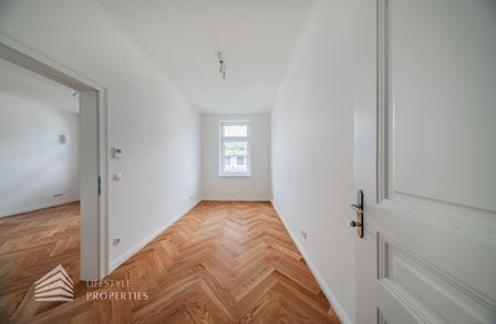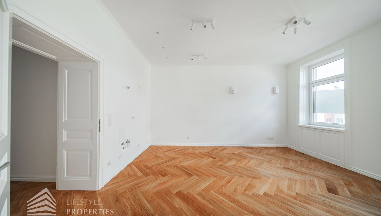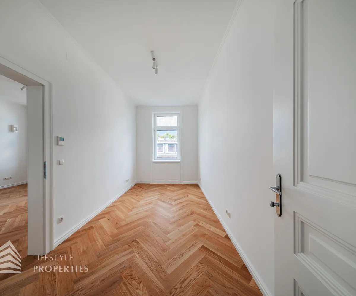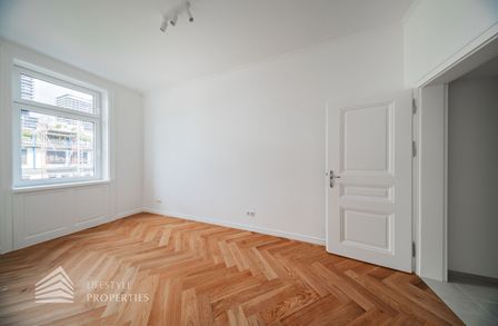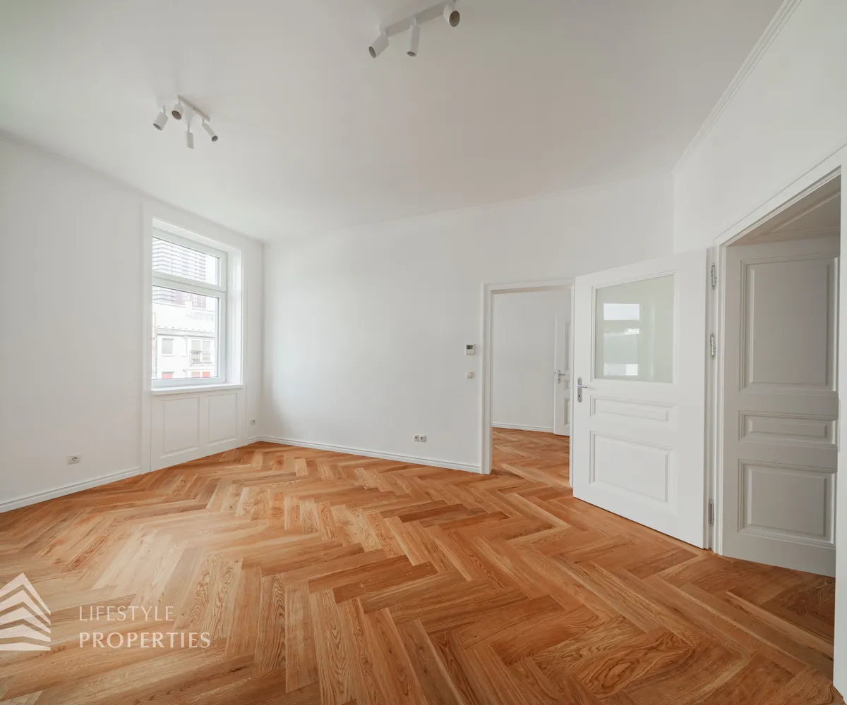 Die Wohnung befindet sich im 4. Stock eines traditionellen Altbaus aus dem Jahre 1900 und bietet eine Wohnfläche von ca. 47 m². Sie teilt sich in ein Schlafzimmer, eine Wohnküche, ein Badezimmer, einen Abstellraum und eine Toilette auf. Die Wohnräume sind mit elegantem Parkett ausgekleidet und die Nassräume mit modernen Fliesen verlegt. Die Wohnung wird mittels Fußbodenheizung beheizt.