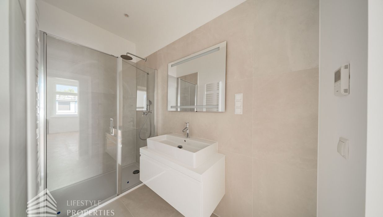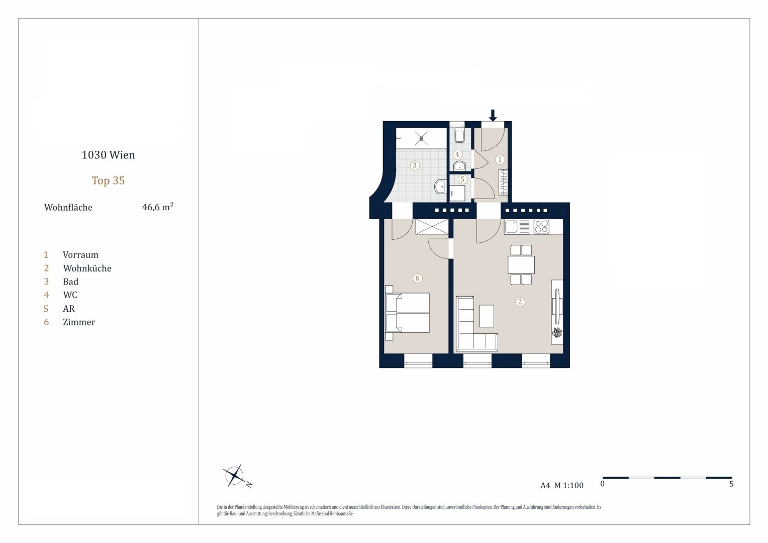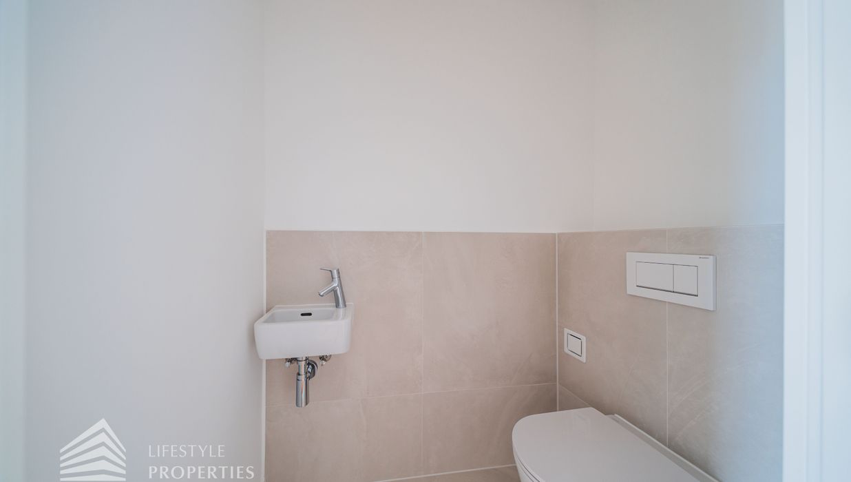 Sie betreten die Wohnung und gelangen in den Vorraum, gerade durch gelangen Sie in die Wohnküche. Von hier gelangen Sie in das Schlafzimmer mit en-suite Bad. Das Badezimmer ist mit einer Dusche, einem Waschbecken und einem Handtuchtrockner ausgestattet. Die separate Toilette und der Abstellraum mit Waschmaschinenanschluss sind vom Vorraum zu erreichen.