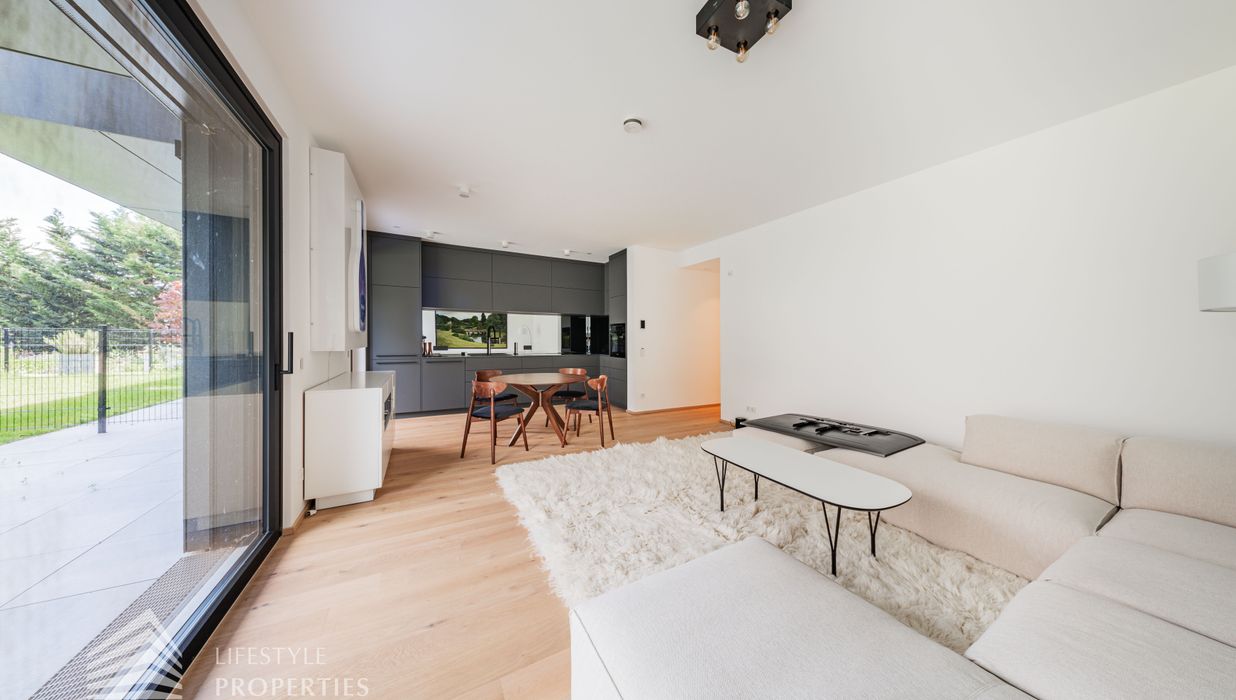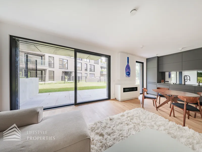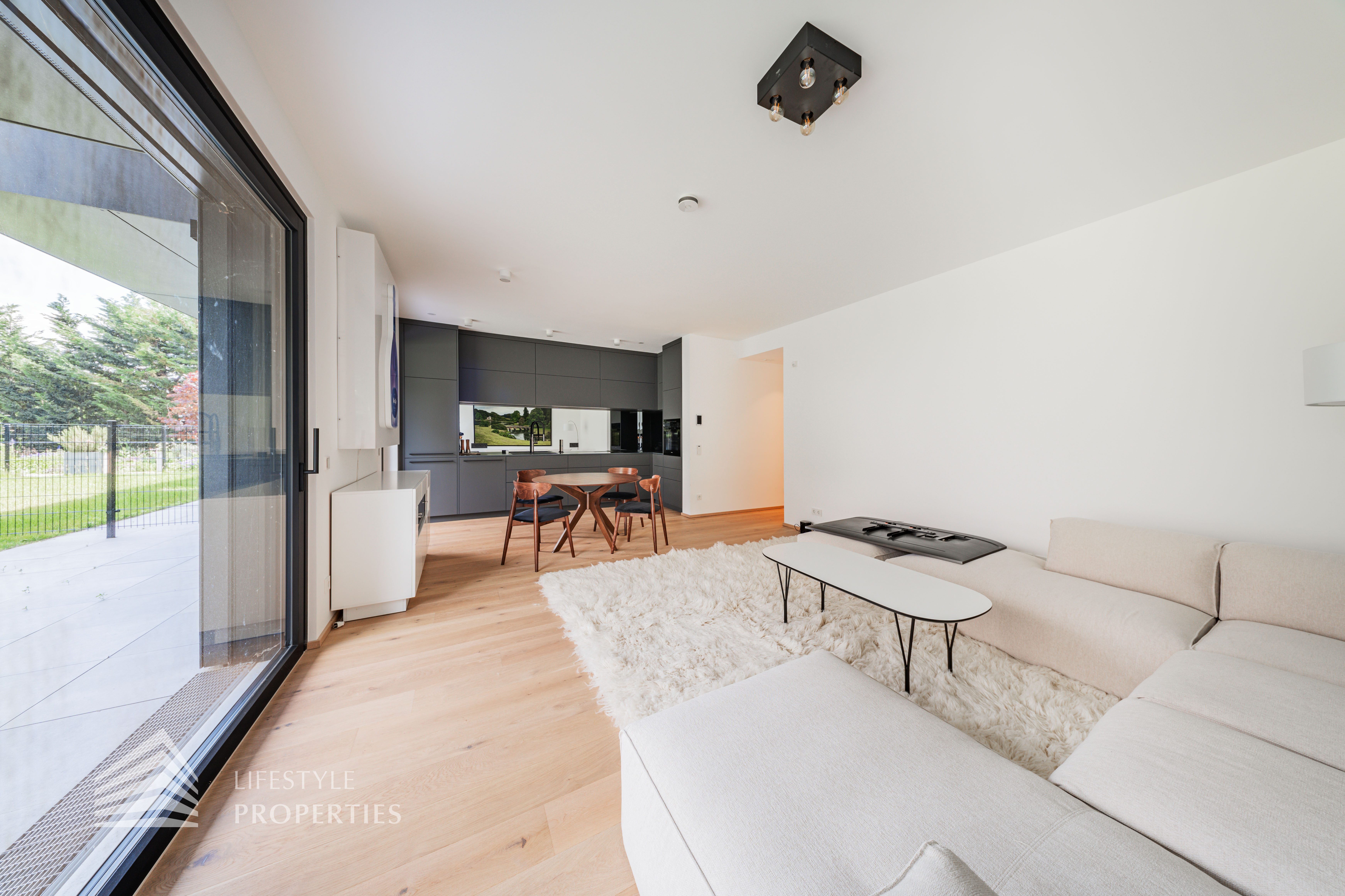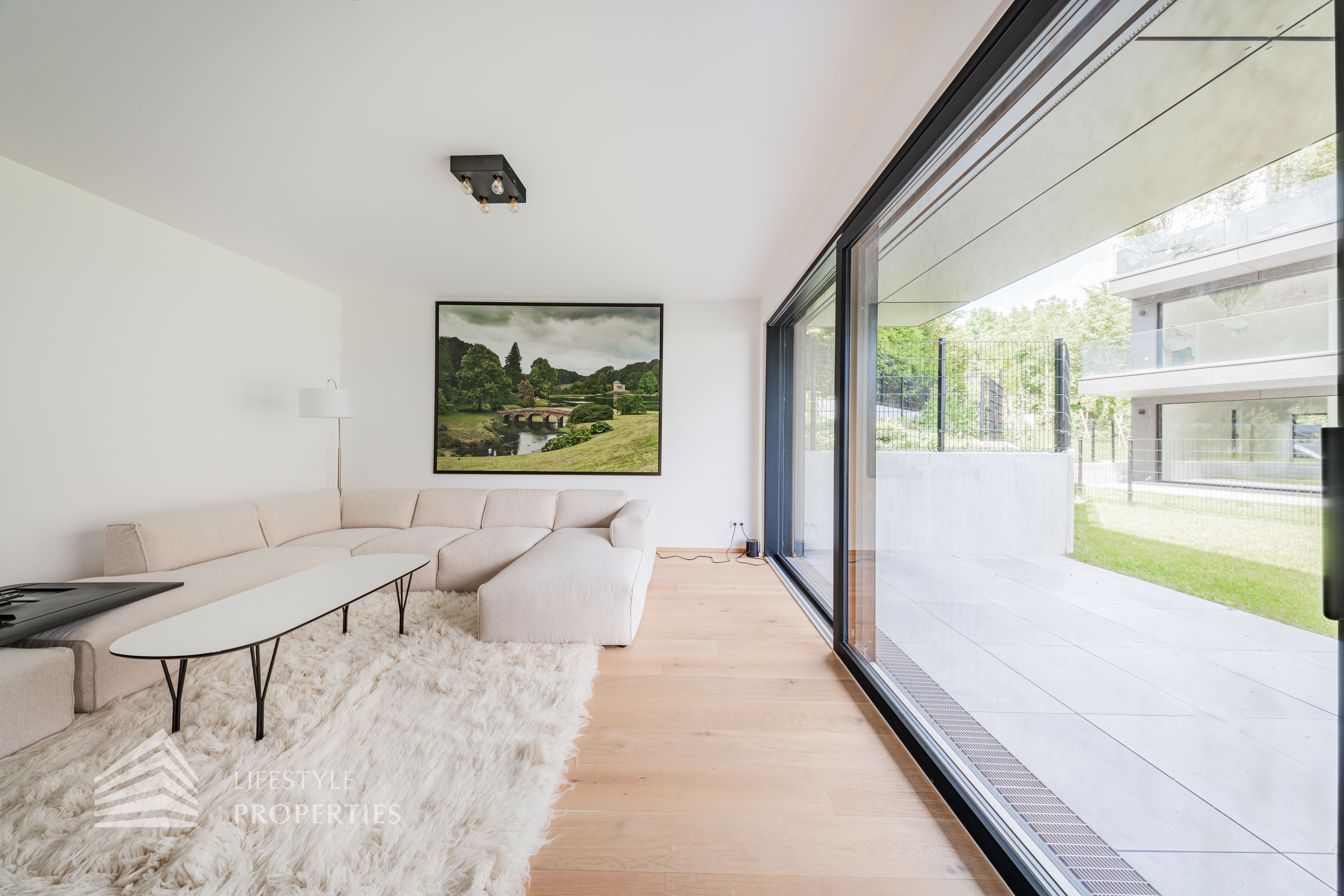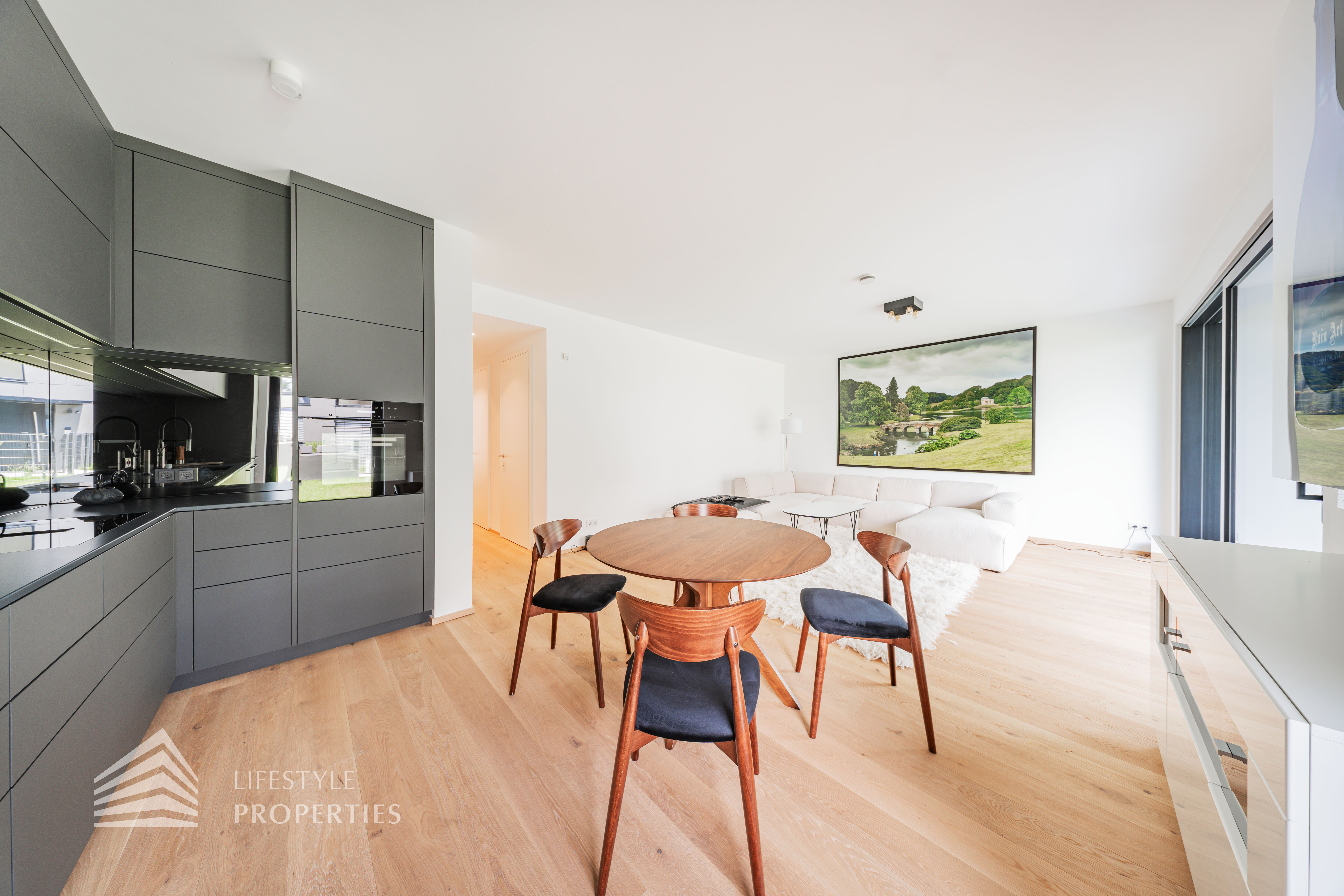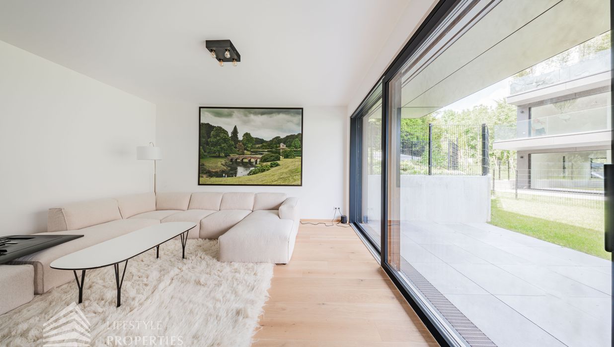 Die Immobilie liegt im Erdgeschoss eines neu erbauten Wohnhauses und erstreckt sich über eine Wohnfläche von ca. 107 m 2 . Sie teilt sich auf in einen offenen Wohnbereich, drei Zimmer, ein Bad mit Dusche, ein Bad mit Wanne, zwei separate WCs und einen Abstellraum. Außerdem sind zwei große Terrassen mit traumhaftem Blick und ein knapp 204 m 2 großer Garten Teil des Eigentums. Die Haupträume der Wohnung sind mit hochwertigem Eichenparkett ausgestattet und die Nassräume mit Grantitoker-Fliesen ausgekleidet. Die Immobilie verfügt über eine Fußbodenheizung, sowie 3-fach verglaste Holz-Alu-Fenster und -Türen, mit außenliegendem Sonnenschutz. Die Eingangstüren und die Terrassentüren sind einbruchsgesichert. Ebenso besteht die Option einer Alarmanlage. Zusätzlich sind Inneneinrichtung/ Möbel inkludiert.