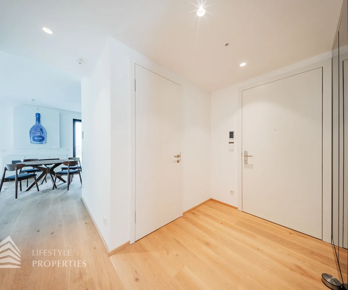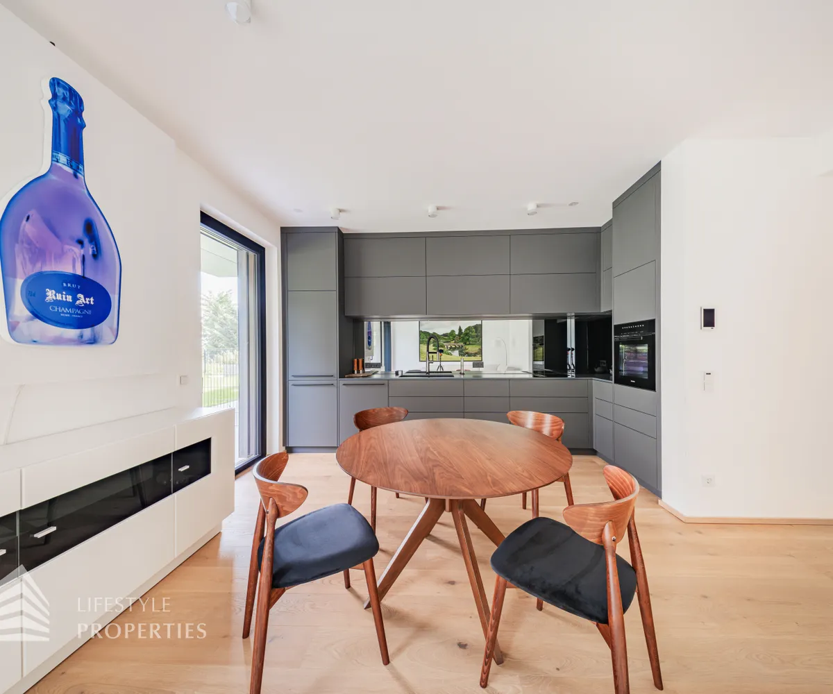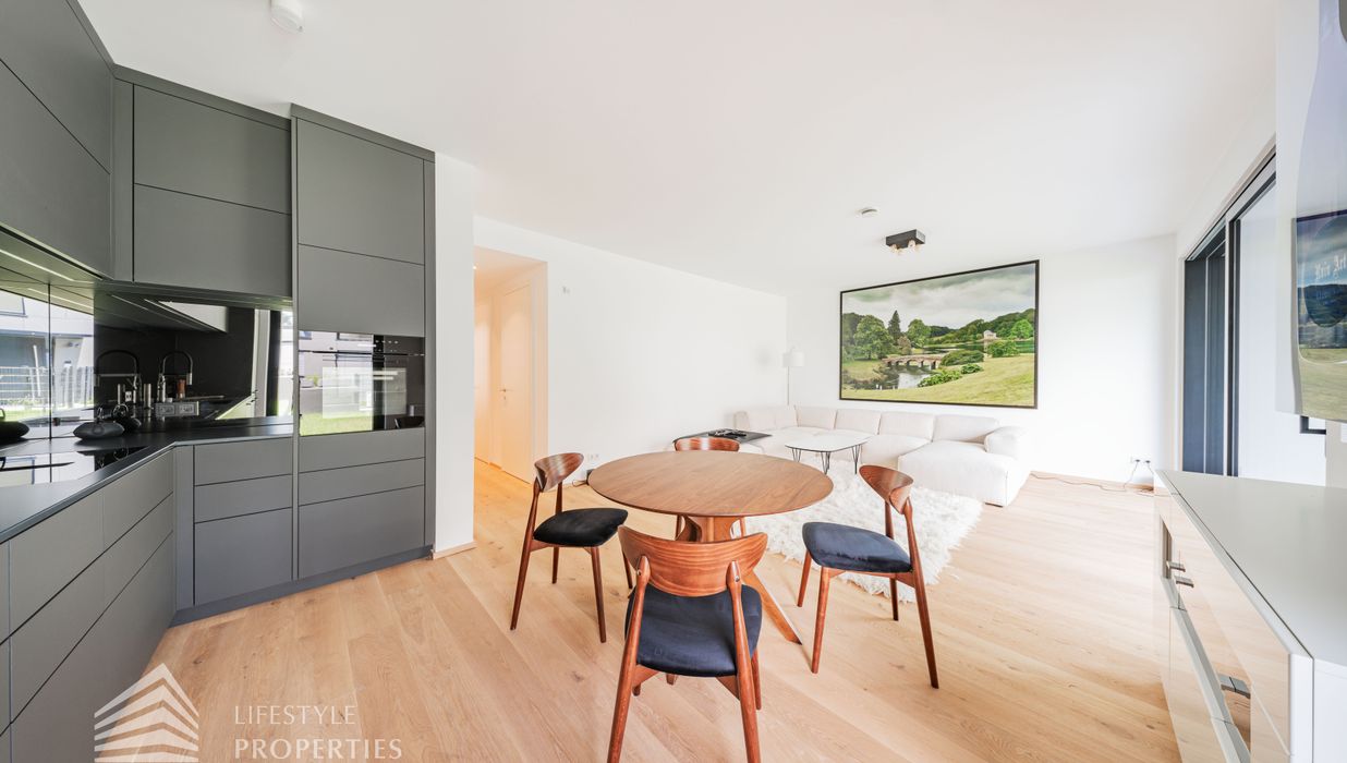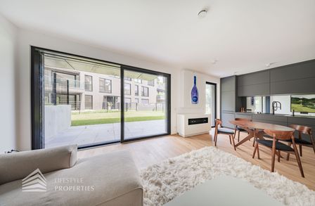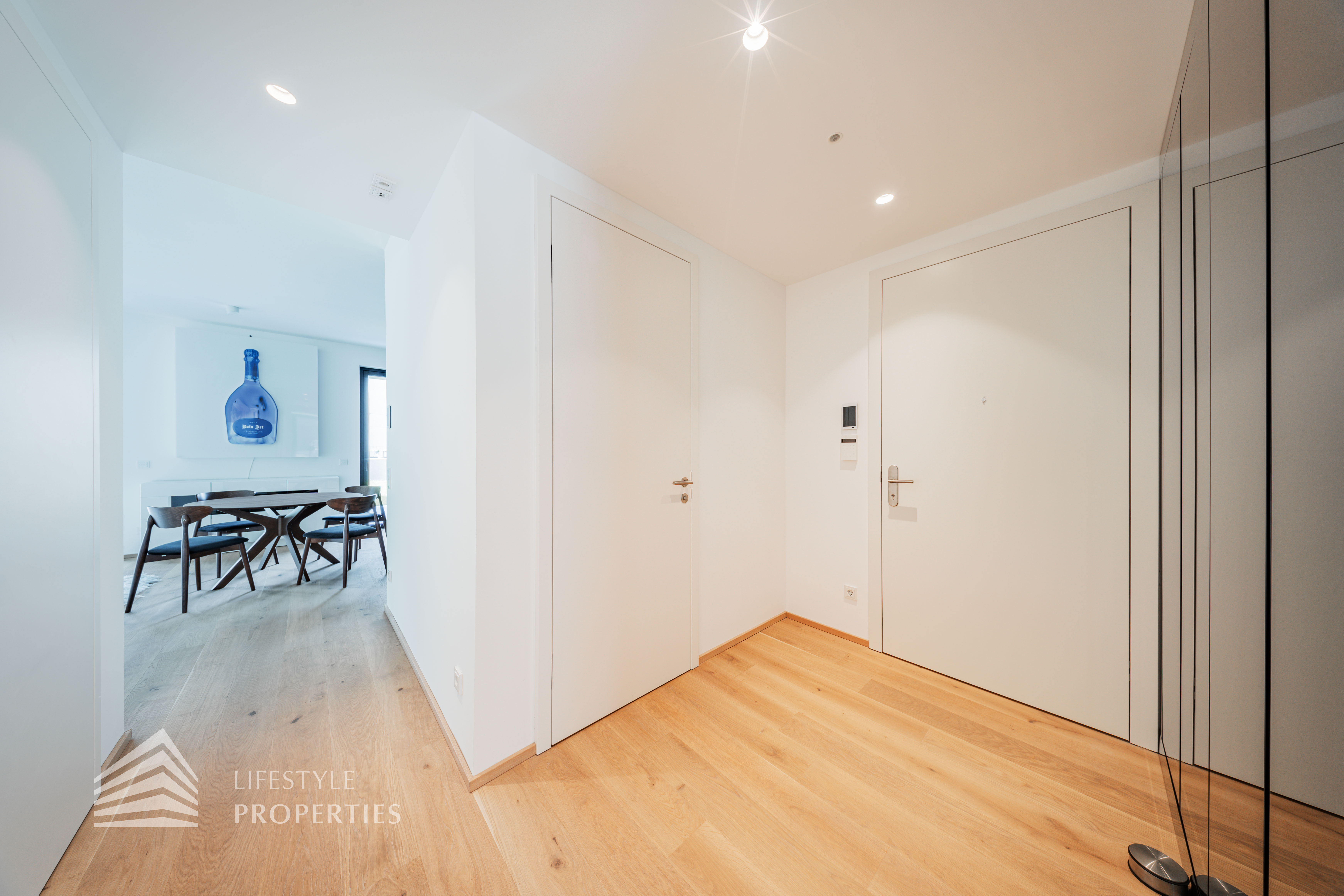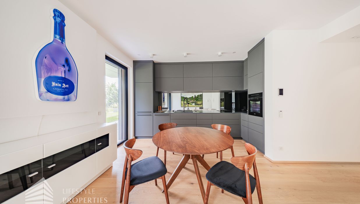 Die Immobilie liegt im Erdgeschoss eines neu erbauten Wohnhauses und erstreckt sich über eine Wohnfläche von ca. 107 m 2 . Sie teilt sich auf in einen offenen Wohnbereich, drei Zimmer, ein Bad mit Dusche, ein Bad mit Wanne, zwei separate WCs und einen Abstellraum. Außerdem sind zwei große Terrassen mit traumhaftem Blick und ein knapp 204 m 2 großer Garten Teil des Eigentums. Die Haupträume der Wohnung sind mit hochwertigem Eichenparkett ausgestattet und die Nassräume mit Grantitoker-Fliesen ausgekleidet. Die Immobilie verfügt über eine Fußbodenheizung, sowie 3-fach verglaste Holz-Alu-Fenster und -Türen, mit außenliegendem Sonnenschutz. Die Eingangstüren und die Terrassentüren sind einbruchsgesichert. Ebenso besteht die Option einer Alarmanlage. Zusätzlich sind Inneneinrichtung/ Möbel inkludiert.