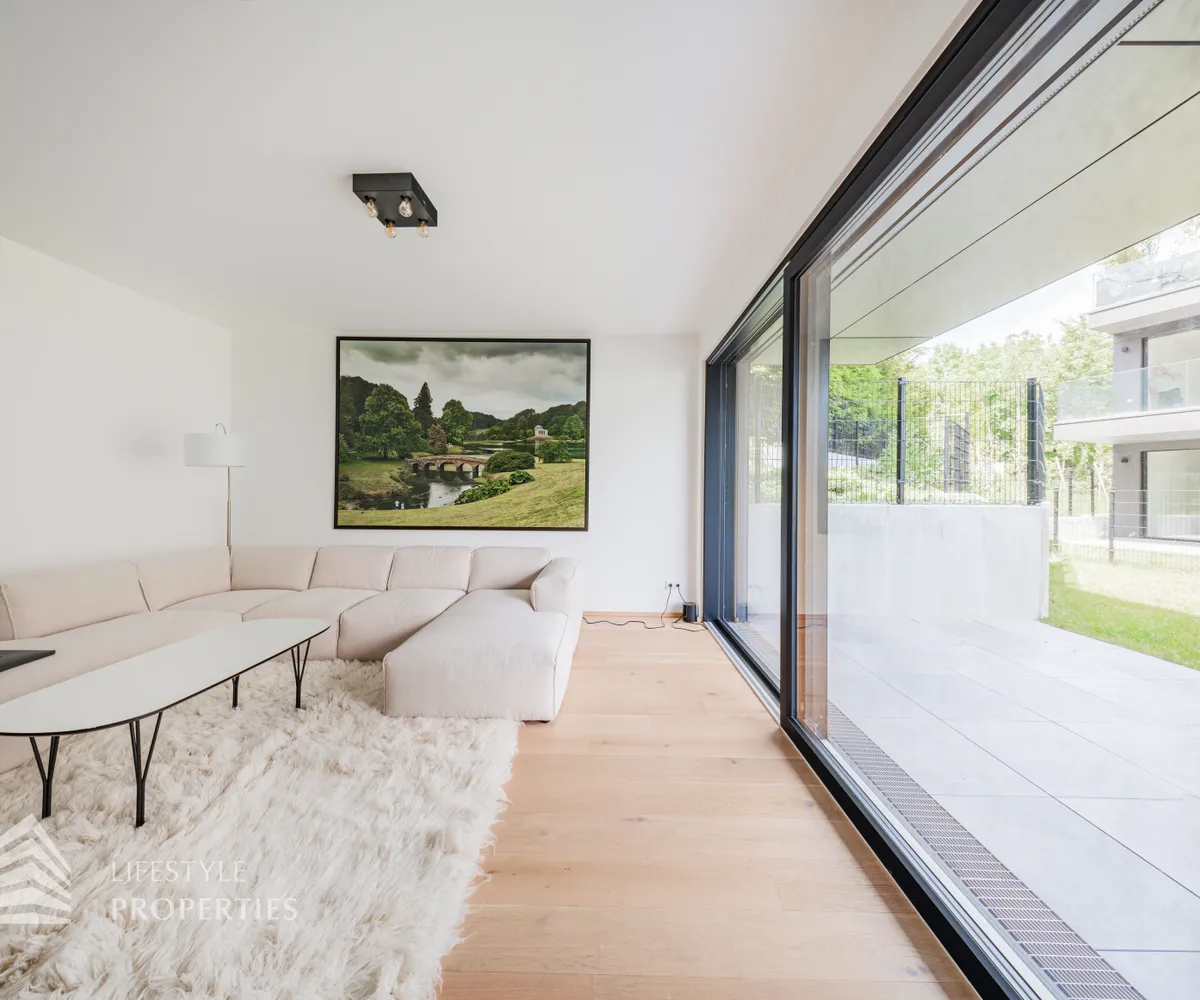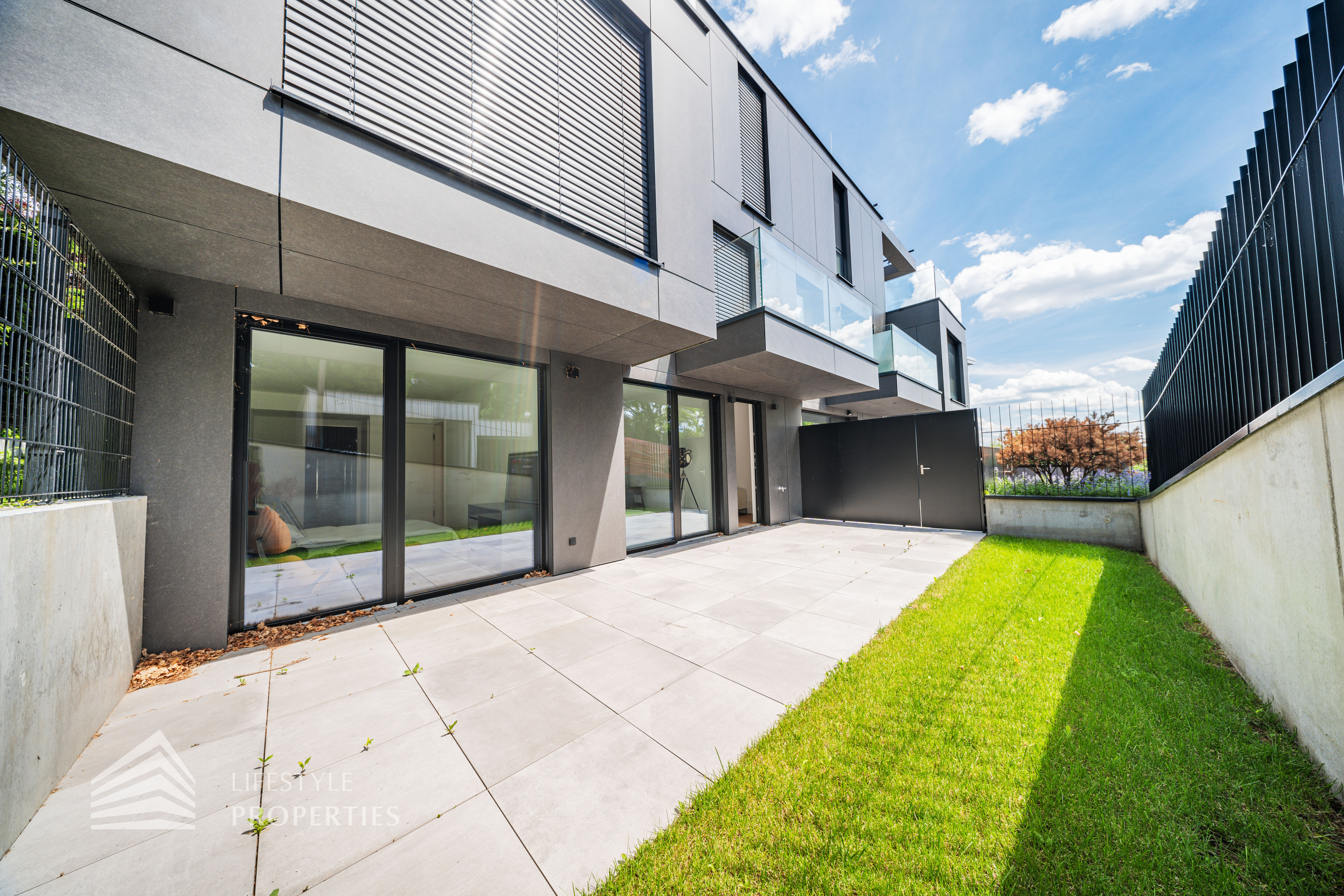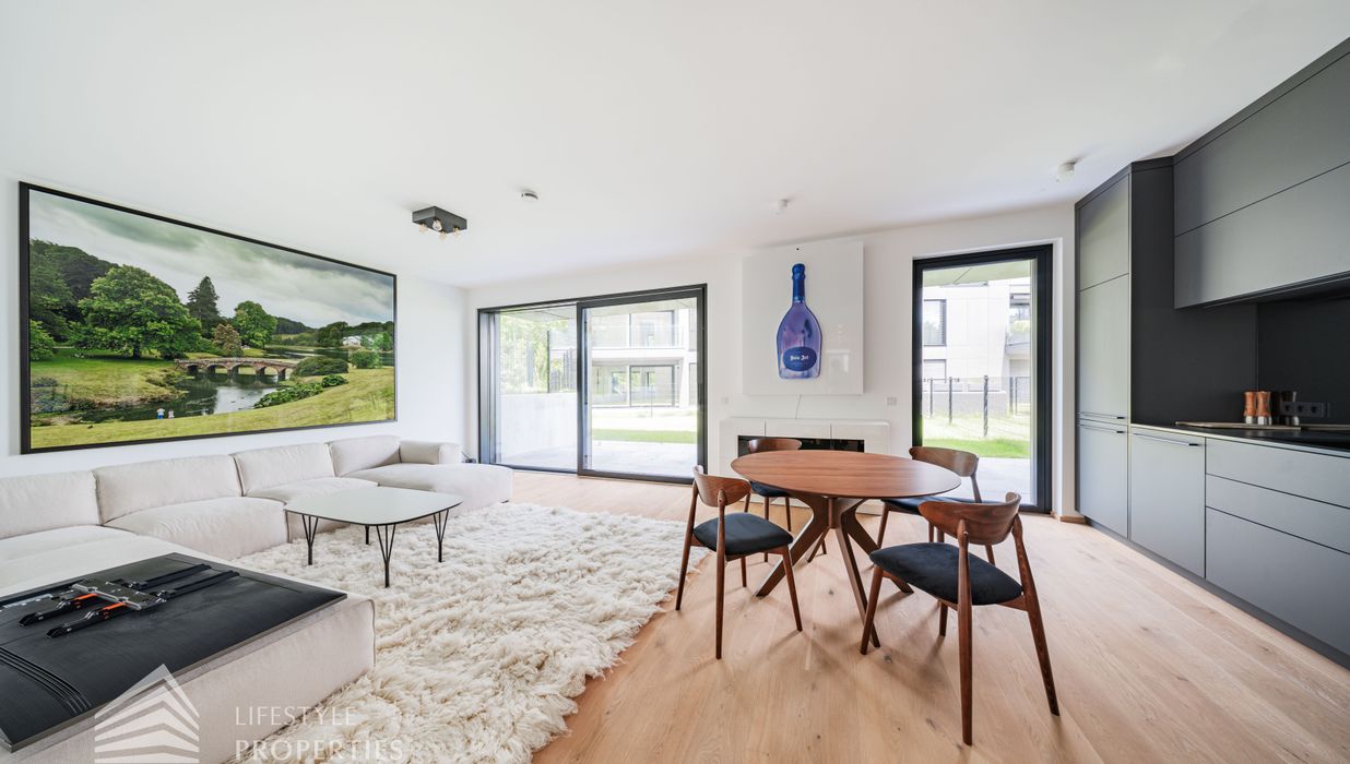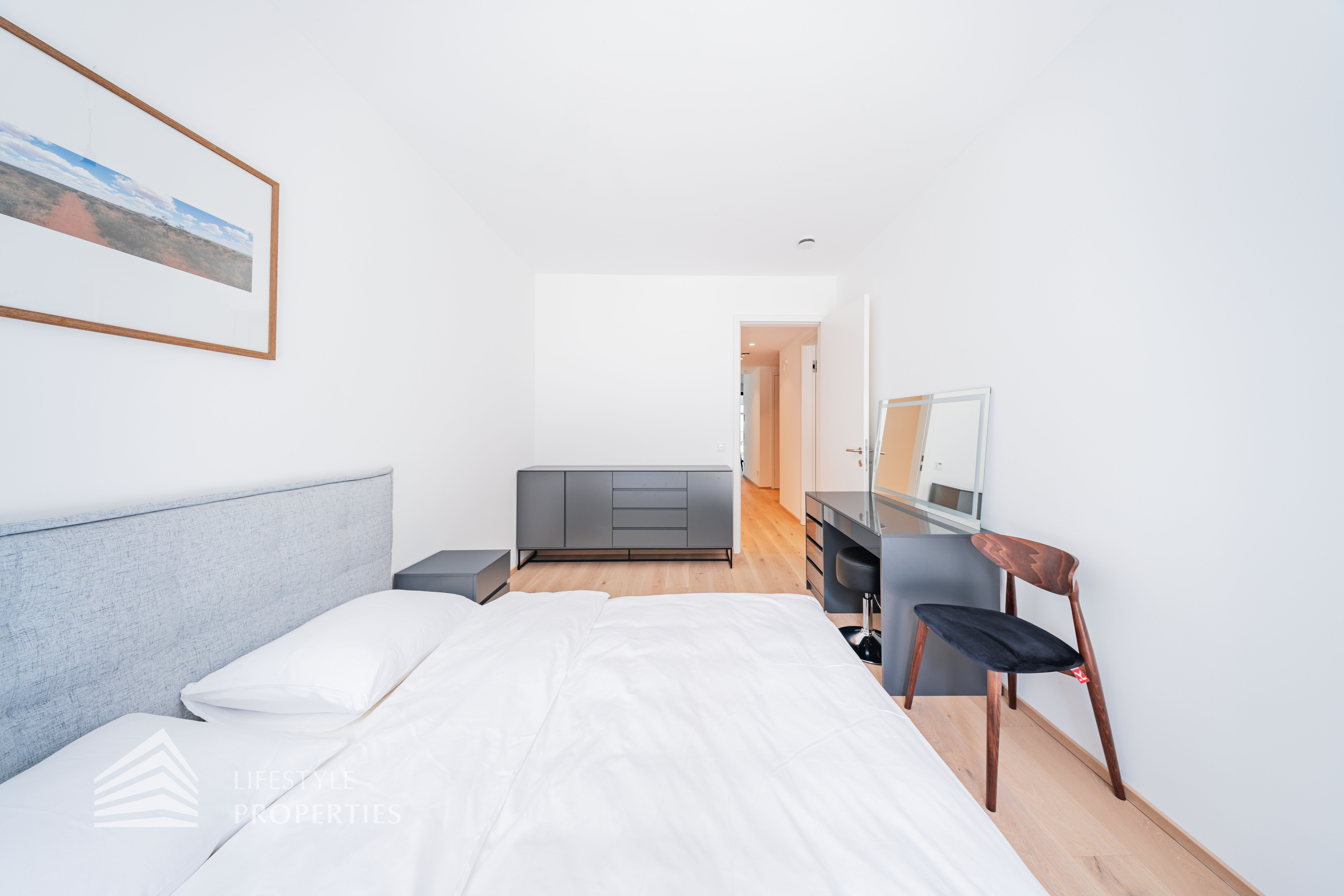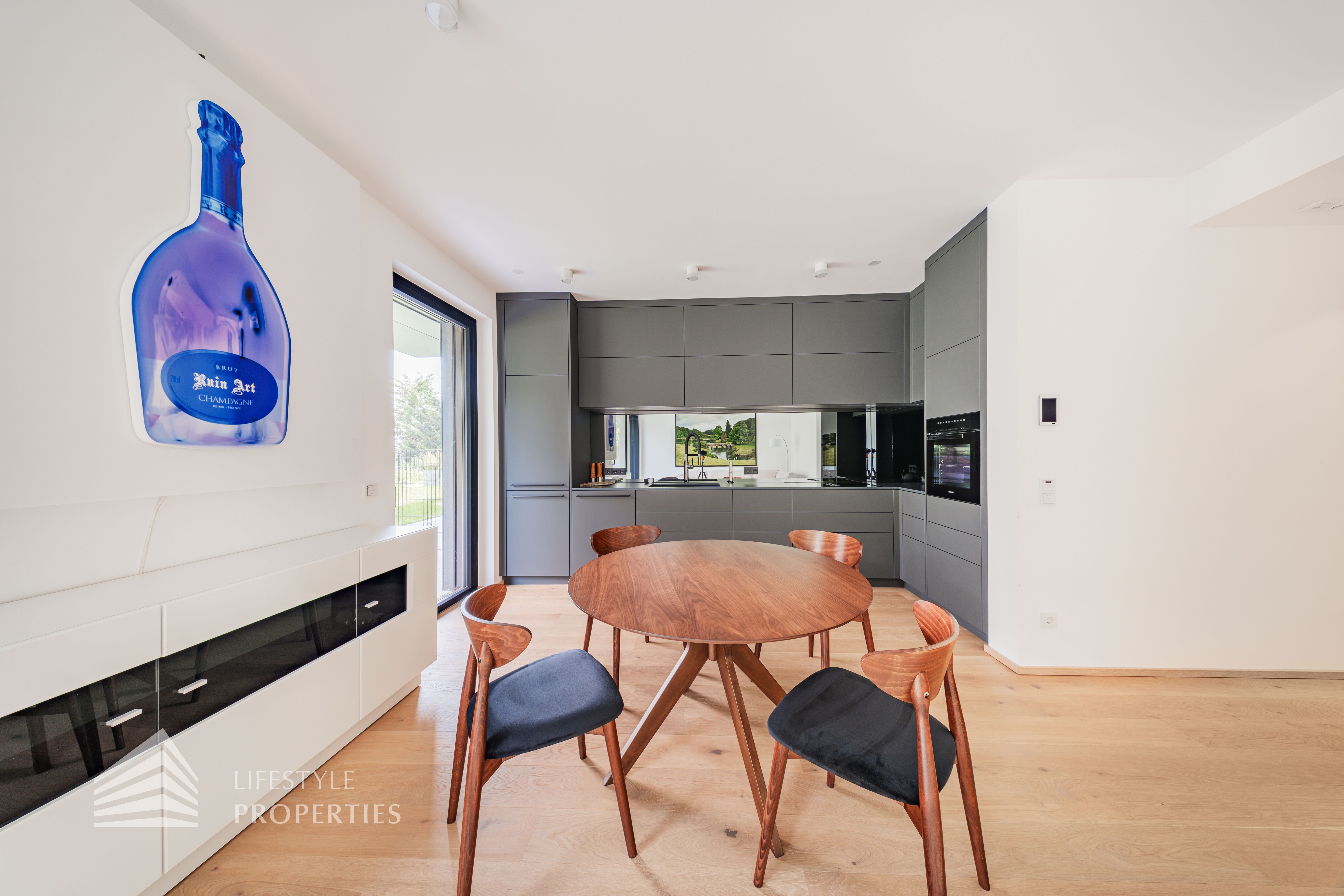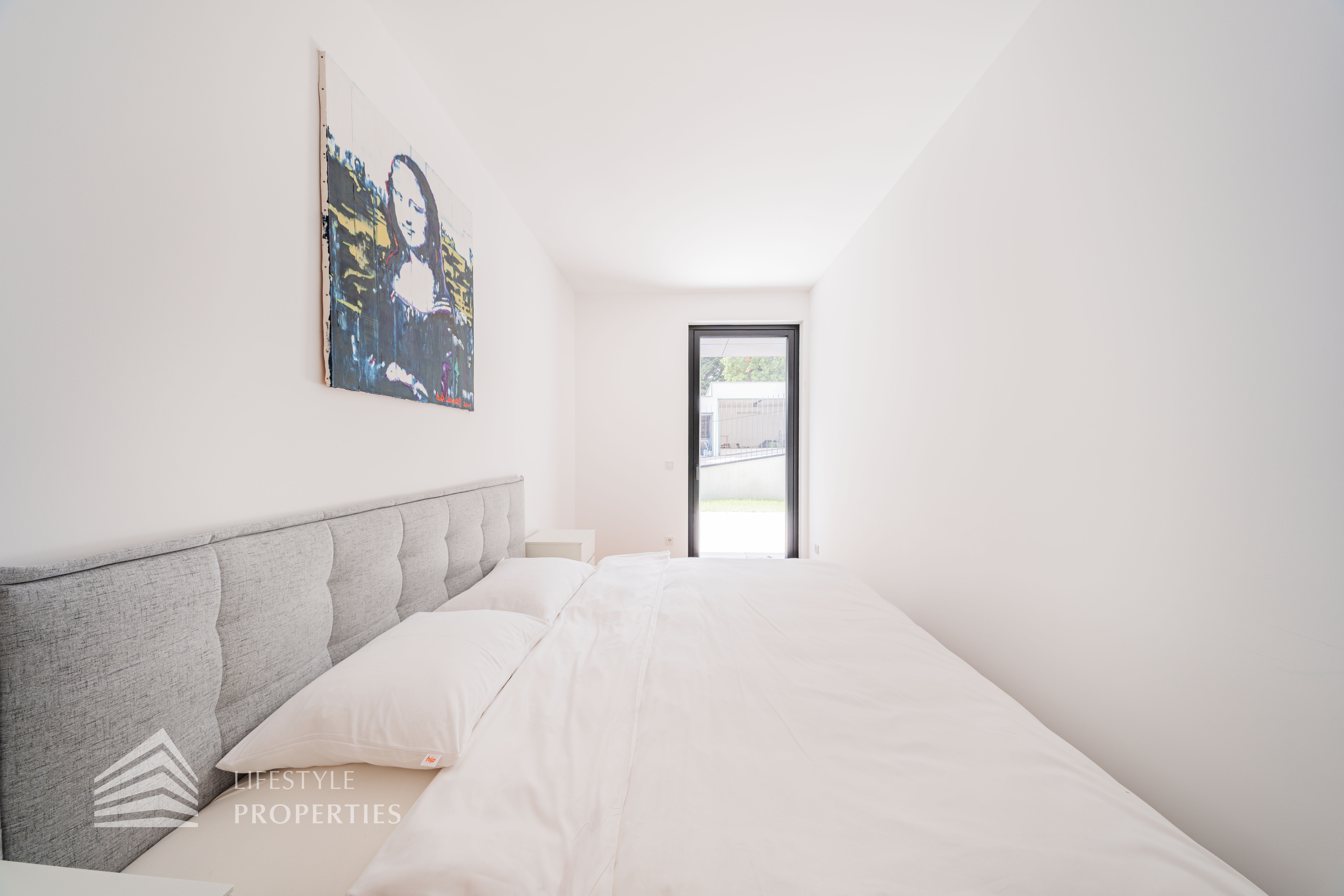 Die Immobilie liegt im Erdgeschoss eines neu erbauten Wohnhauses und erstreckt sich über eine Wohnfläche von ca. 107 m 2 . Sie teilt sich auf in einen offenen Wohnbereich, drei Zimmer, ein Bad mit Dusche, ein Bad mit Wanne, zwei separate WCs und einen Abstellraum. Außerdem sind zwei große Terrassen mit traumhaftem Blick und ein knapp 204 m 2 großer Garten Teil des Eigentums. Die Haupträume der Wohnung sind mit hochwertigem Eichenparkett ausgestattet und die Nassräume mit Grantitoker-Fliesen ausgekleidet. Die Immobilie verfügt über eine Fußbodenheizung, sowie 3-fach verglaste Holz-Alu-Fenster und -Türen, mit außenliegendem Sonnenschutz. Die Eingangstüren und die Terrassentüren sind einbruchsgesichert. Ebenso besteht die Option einer Alarmanlage. Zusätzlich sind Inneneinrichtung/ Möbel inkludiert.