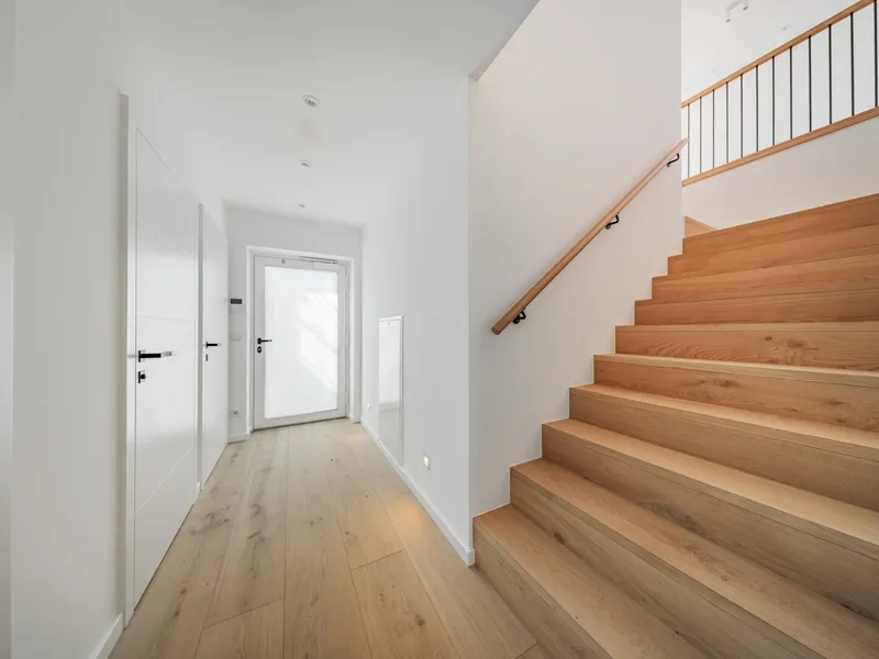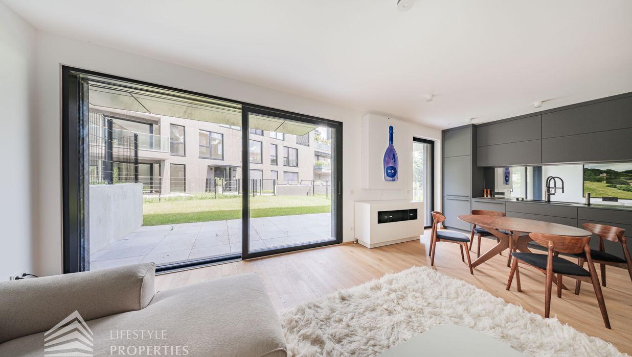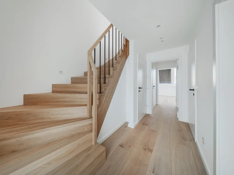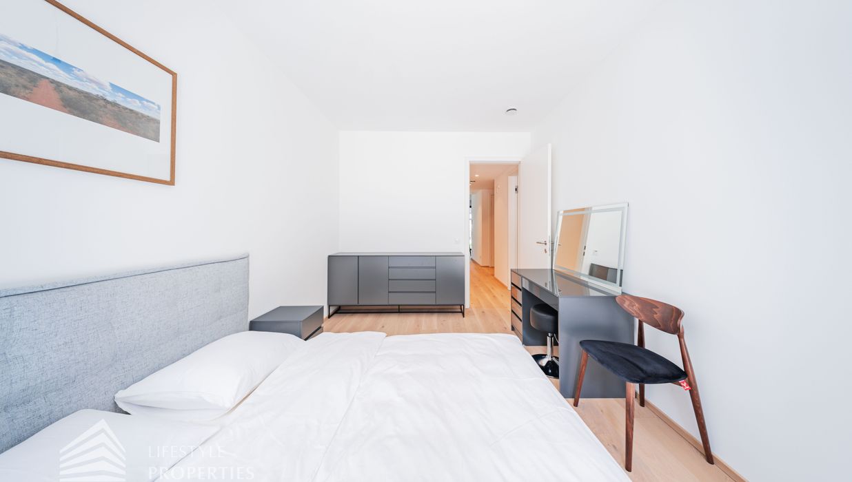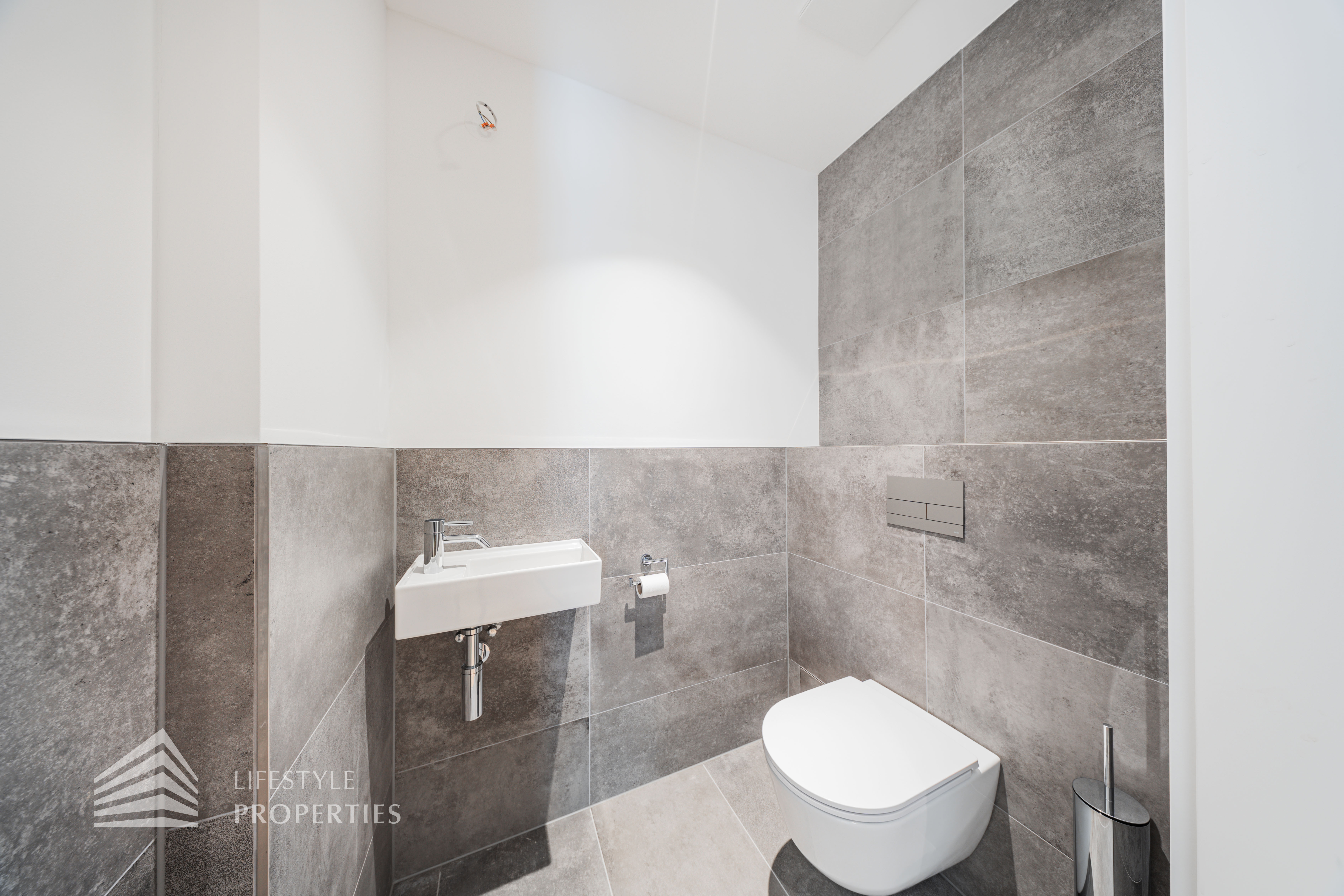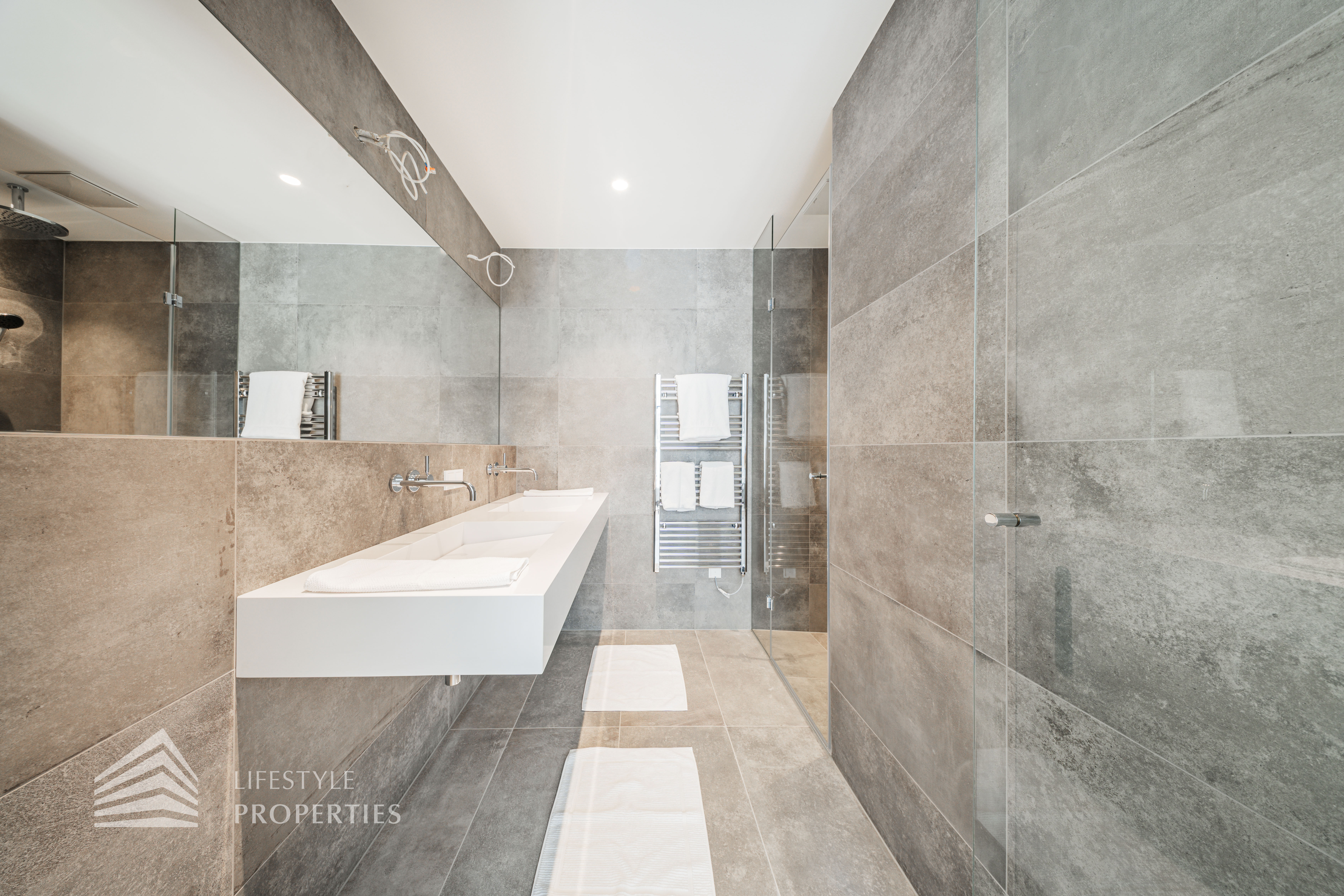 Die Immobilie liegt im Erdgeschoss eines neu erbauten Wohnhauses und erstreckt sich über eine Wohnfläche von ca. 107 m 2 . Sie teilt sich auf in einen offenen Wohnbereich, drei Zimmer, ein Bad mit Dusche, ein Bad mit Wanne, zwei separate WCs und einen Abstellraum. Außerdem sind zwei große Terrassen mit traumhaftem Blick und ein knapp 204 m 2 großer Garten Teil des Eigentums. Die Haupträume der Wohnung sind mit hochwertigem Eichenparkett ausgestattet und die Nassräume mit Grantitoker-Fliesen ausgekleidet. Die Immobilie verfügt über eine Fußbodenheizung, sowie 3-fach verglaste Holz-Alu-Fenster und -Türen, mit außenliegendem Sonnenschutz. Die Eingangstüren und die Terrassentüren sind einbruchsgesichert. Ebenso besteht die Option einer Alarmanlage. Zusätzlich sind Inneneinrichtung/ Möbel inkludiert.