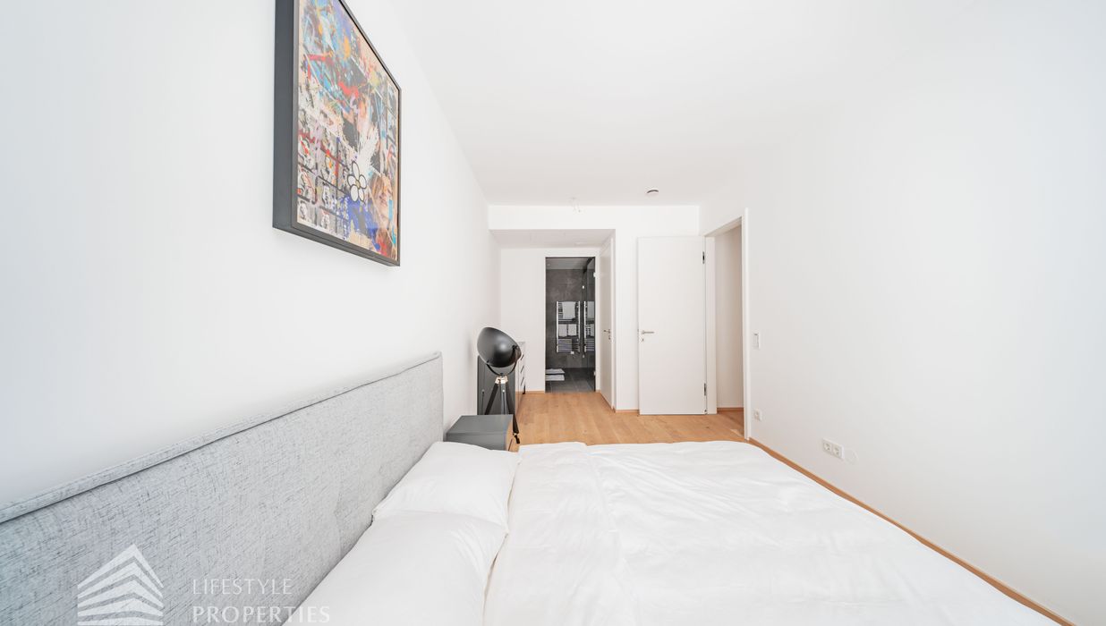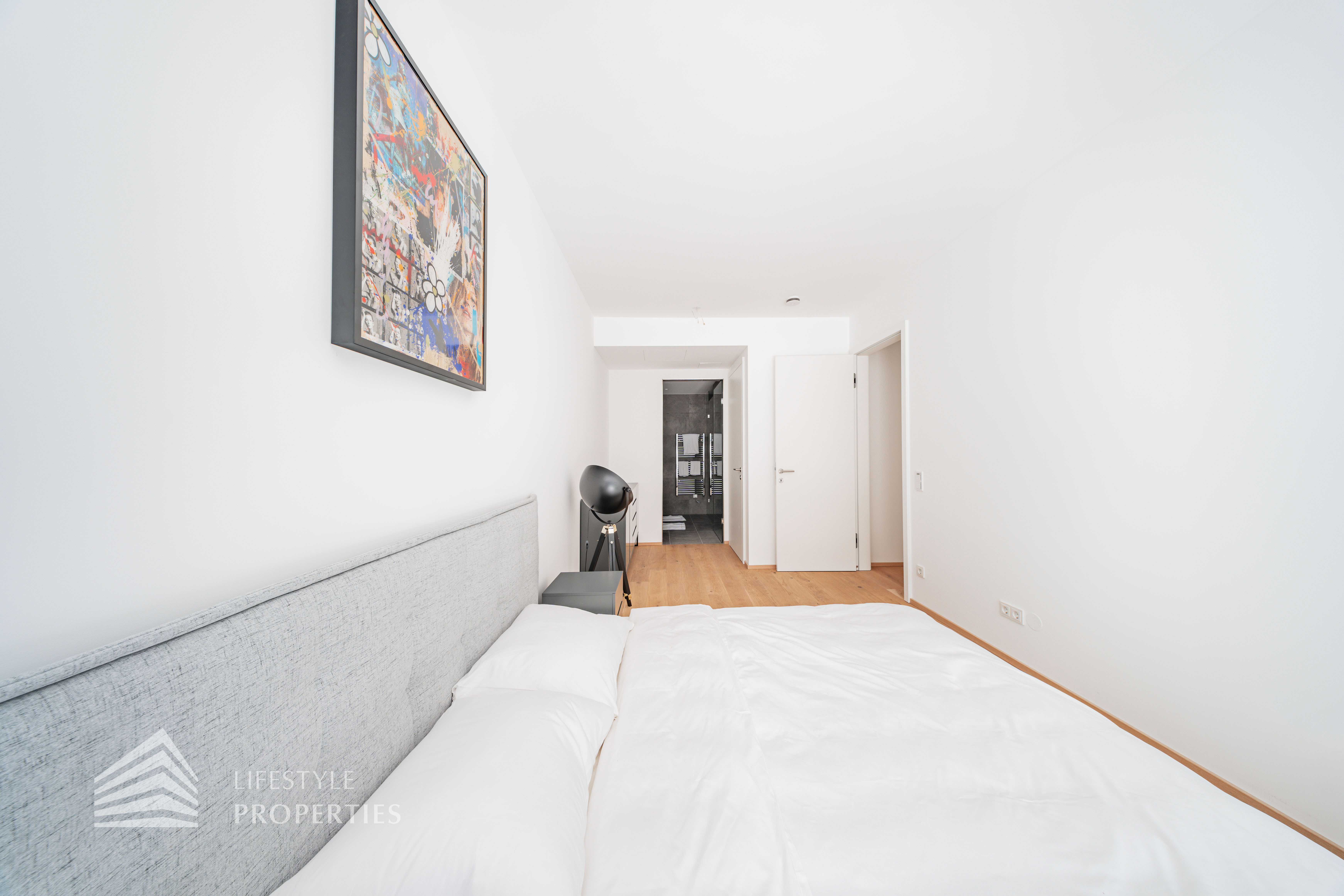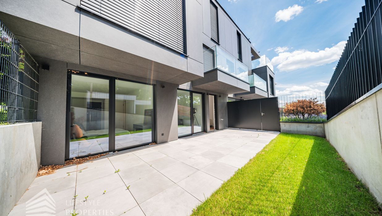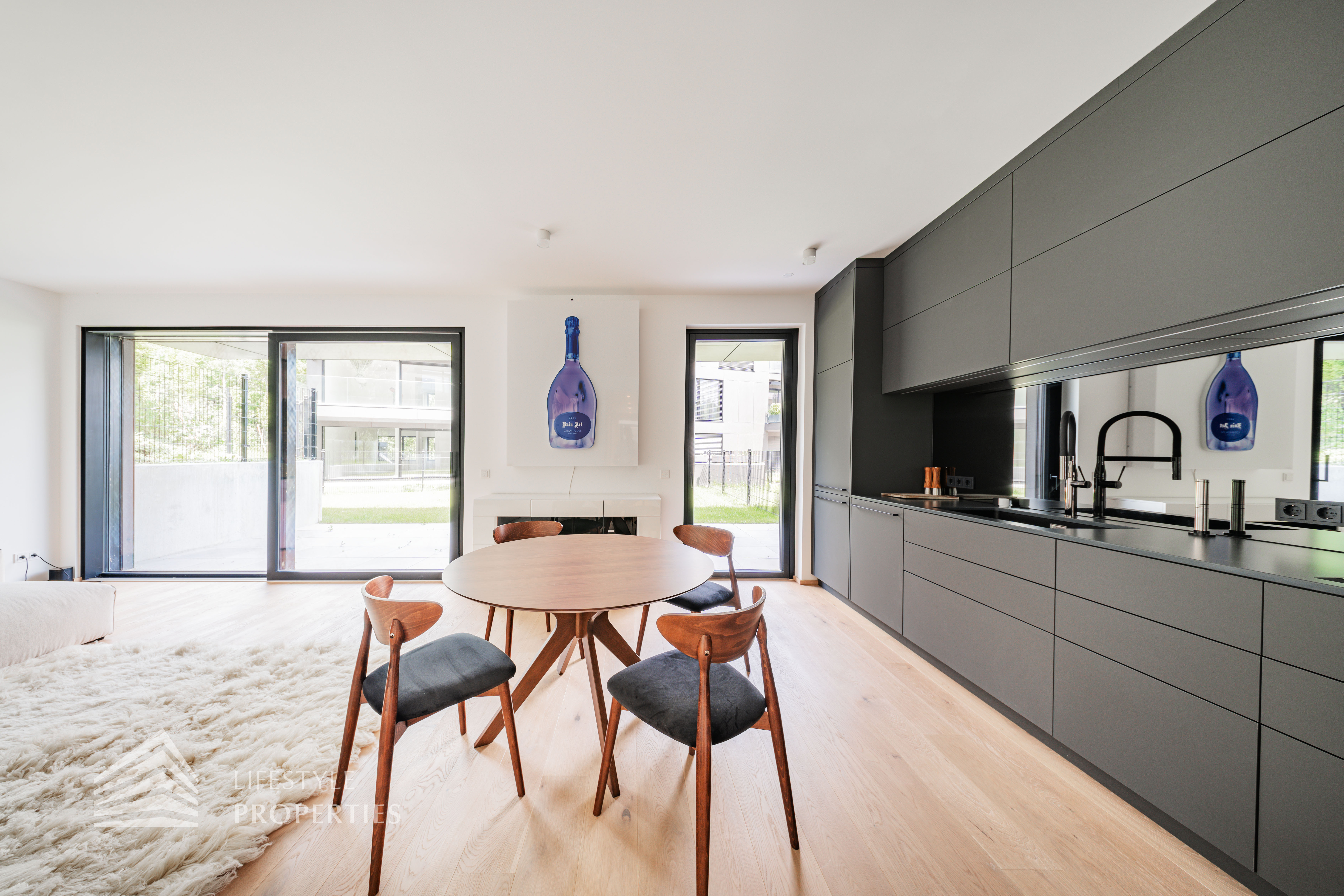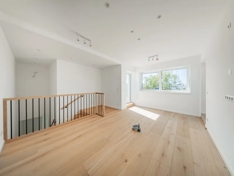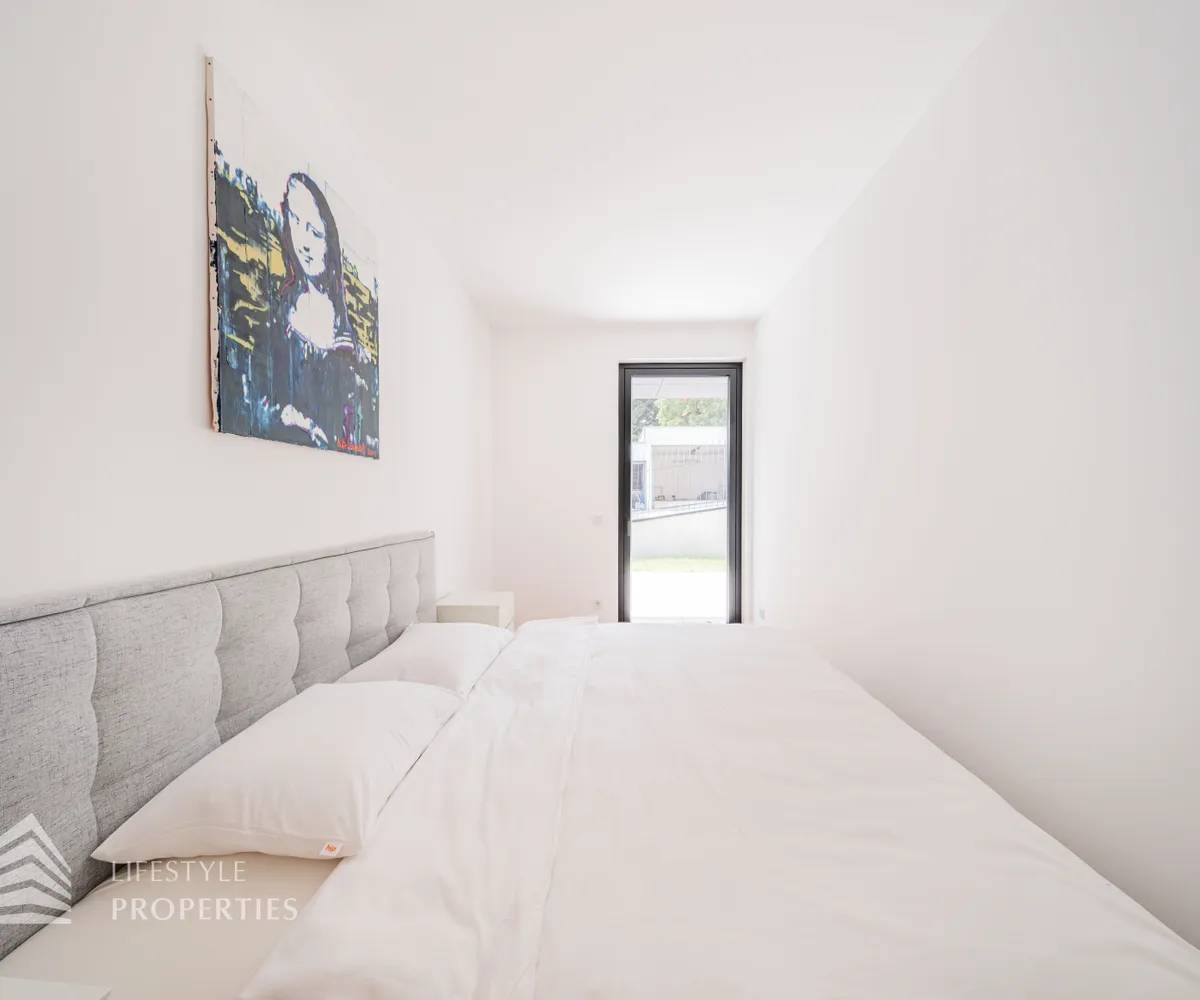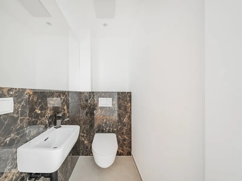Die Immobilie liegt im Erdgeschoss eines neu erbauten Wohnhauses und erstreckt sich über eine Wohnfläche von ca. 107 m 2 . Sie teilt sich auf in einen offenen Wohnbereich, drei Zimmer, ein Bad mit Dusche, ein Bad mit Wanne, zwei separate WCs und einen Abstellraum. Außerdem sind zwei große Terrassen mit traumhaftem Blick und ein knapp 204 m 2 großer Garten Teil des Eigentums. Die Haupträume der Wohnung sind mit hochwertigem Eichenparkett ausgestattet und die Nassräume mit Grantitoker-Fliesen ausgekleidet. Die Immobilie verfügt über eine Fußbodenheizung, sowie 3-fach verglaste Holz-Alu-Fenster und -Türen, mit außenliegendem Sonnenschutz. Die Eingangstüren und die Terrassentüren sind einbruchsgesichert. Ebenso besteht die Option einer Alarmanlage. Zusätzlich sind Inneneinrichtung/ Möbel inkludiert.