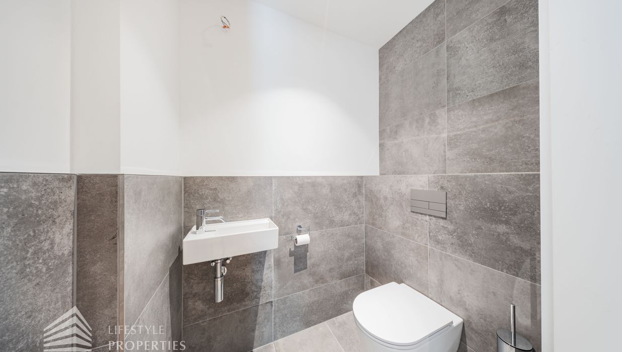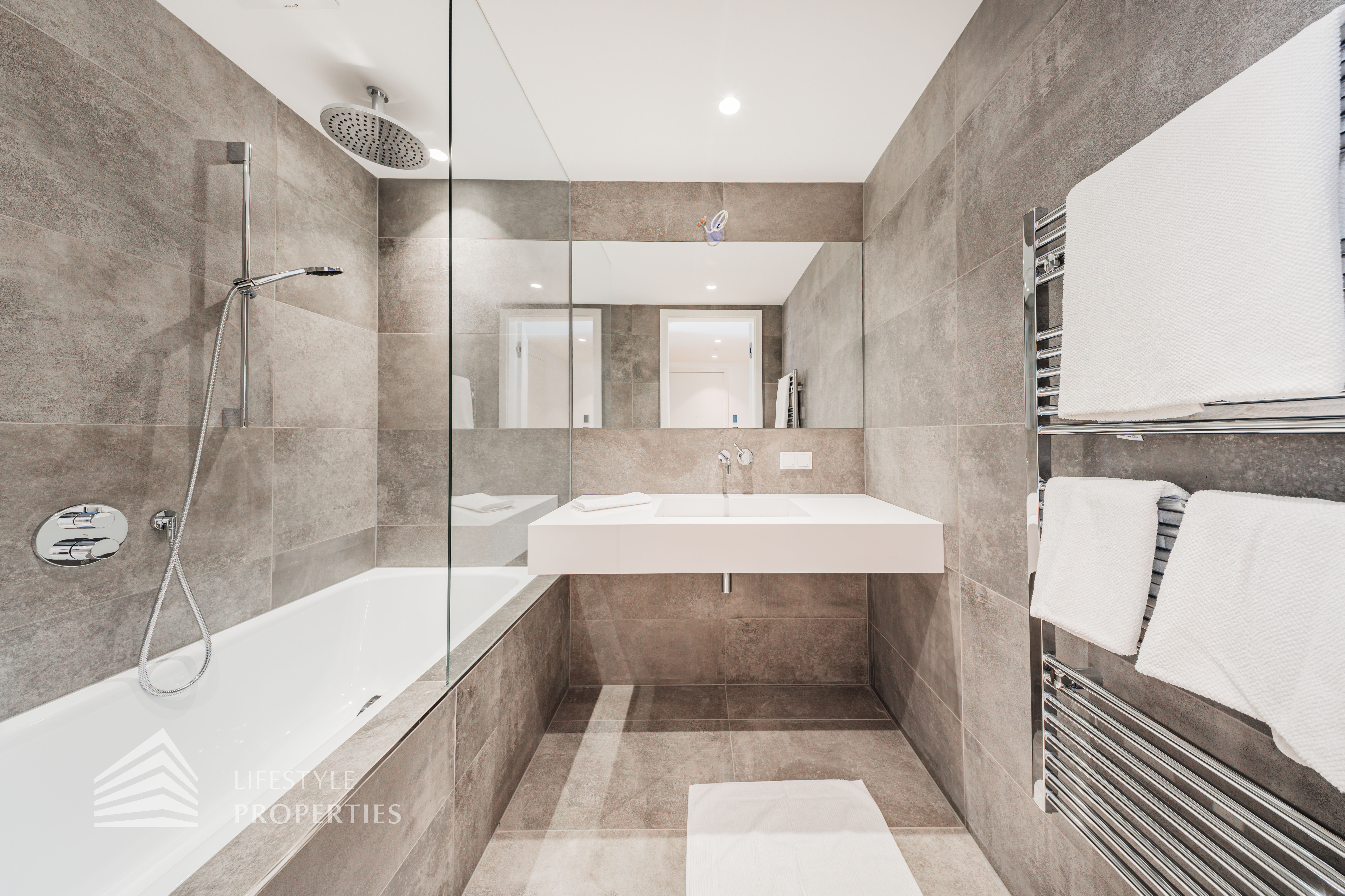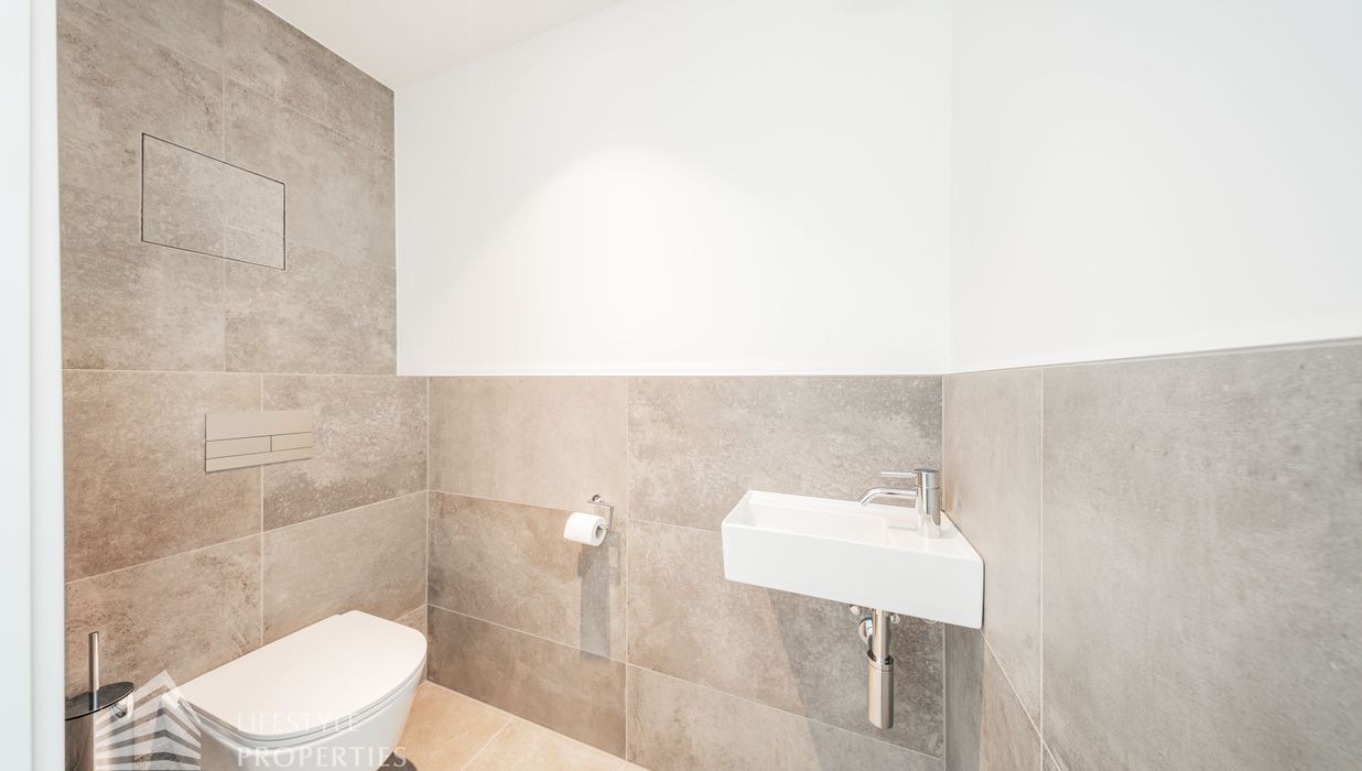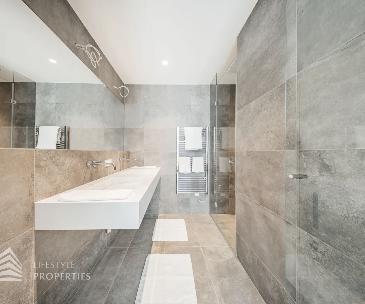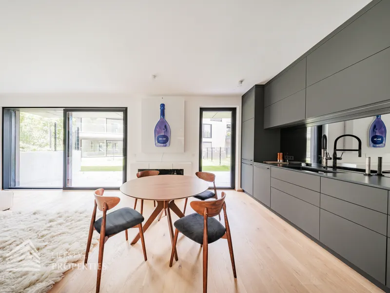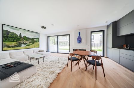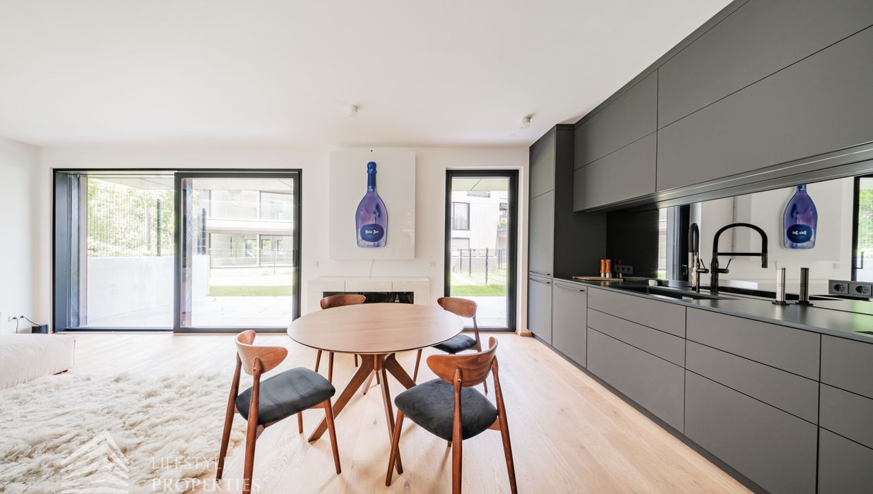 Die Immobilie liegt im Erdgeschoss eines neu erbauten Wohnhauses und erstreckt sich über eine Wohnfläche von ca. 107 m 2 . Sie teilt sich auf in einen offenen Wohnbereich, drei Zimmer, ein Bad mit Dusche, ein Bad mit Wanne, zwei separate WCs und einen Abstellraum. Außerdem sind zwei große Terrassen mit traumhaftem Blick und ein knapp 204 m 2 großer Garten Teil des Eigentums. Die Haupträume der Wohnung sind mit hochwertigem Eichenparkett ausgestattet und die Nassräume mit Grantitoker-Fliesen ausgekleidet. Die Immobilie verfügt über eine Fußbodenheizung, sowie 3-fach verglaste Holz-Alu-Fenster und -Türen, mit außenliegendem Sonnenschutz. Die Eingangstüren und die Terrassentüren sind einbruchsgesichert. Ebenso besteht die Option einer Alarmanlage. Zusätzlich sind Inneneinrichtung/ Möbel inkludiert.