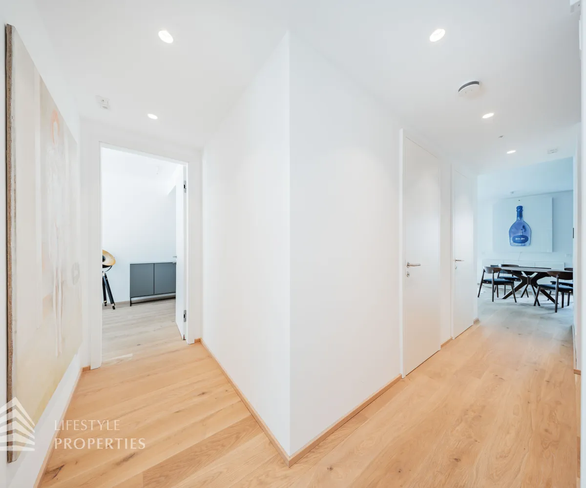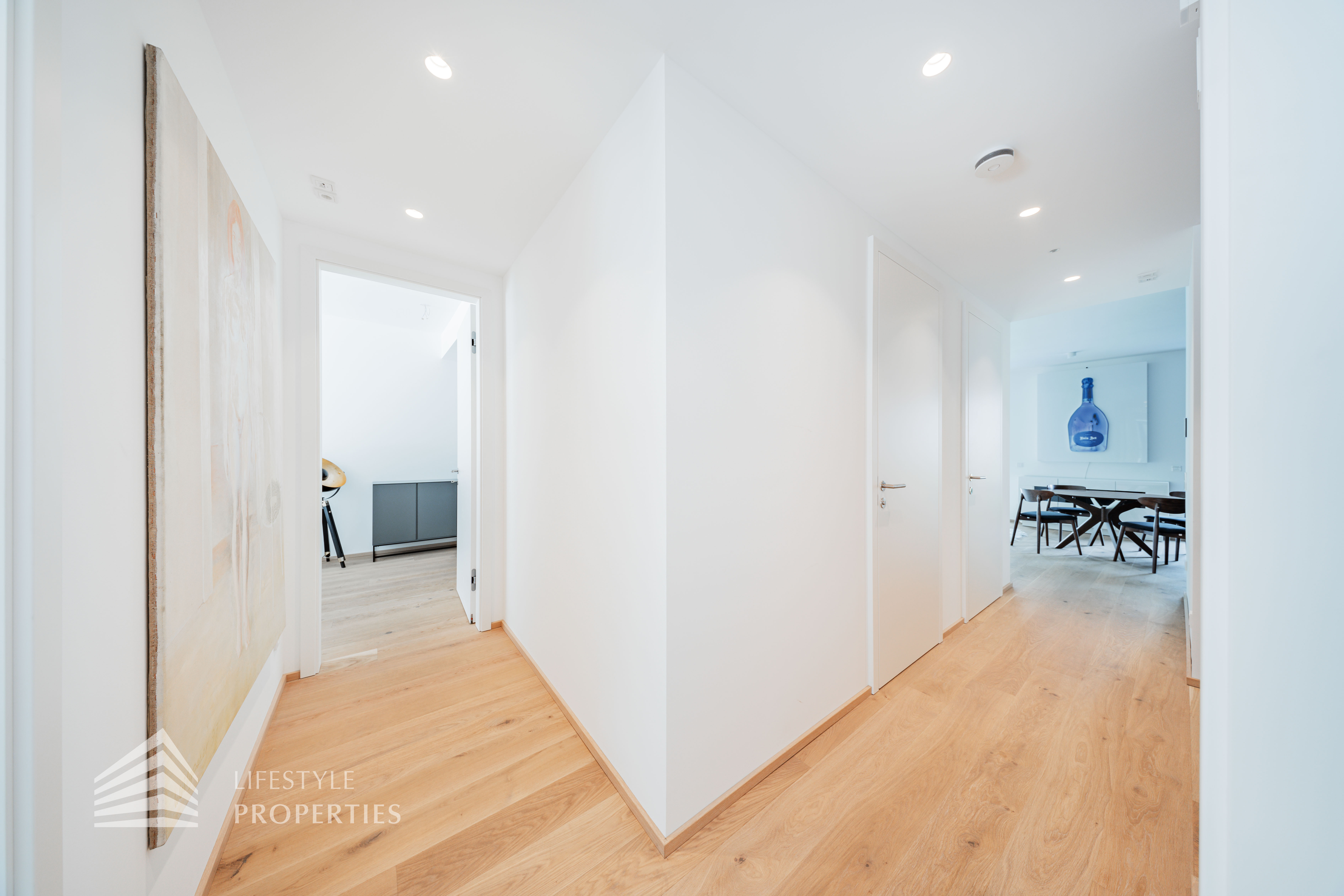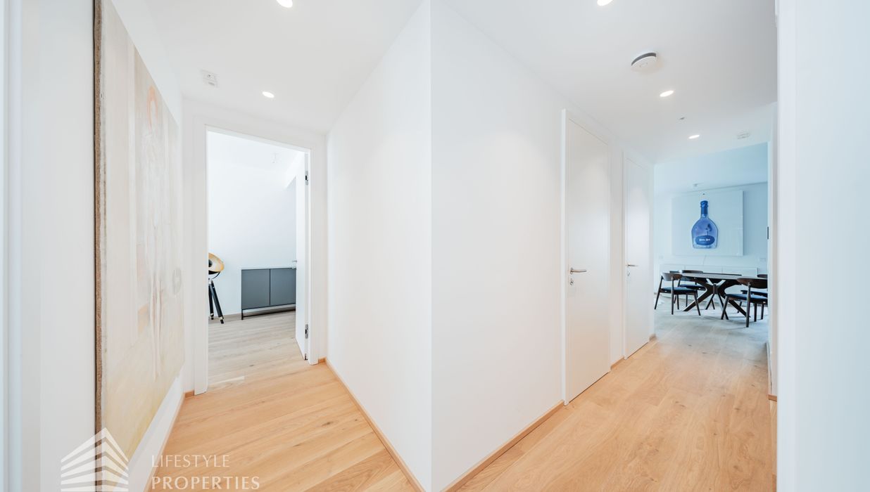 Sie betreten die Wohnung und gelangen in einen einladenden Eingangsbereich. Dieser bietet dank einer praktischen Nische genügend Platz für eine Garderobe. Rechterhand gelangen Sie in den offenen Wohn- und Essbereich, welcher Dank der großen Fenster und Terrassentüren hell und einladend ist. Von hier aus betreten Sie in den knapp 160 m