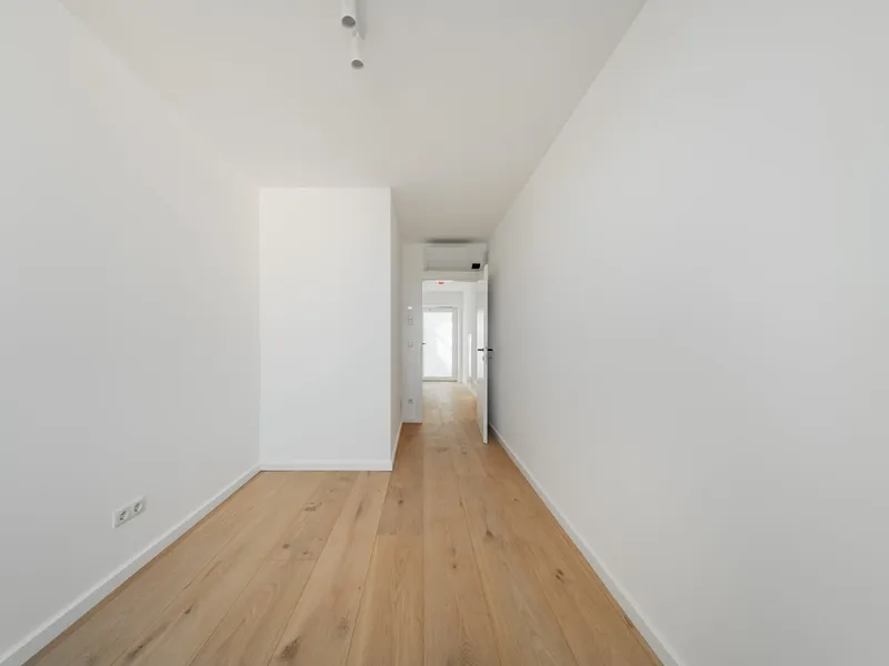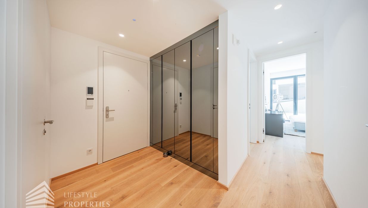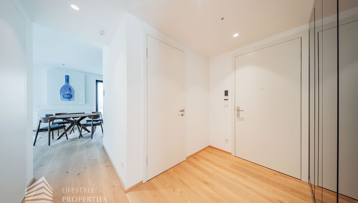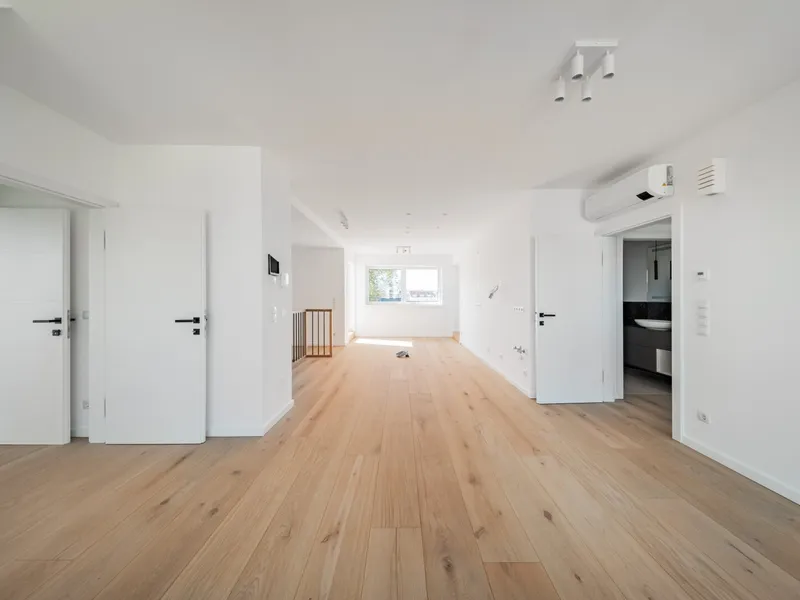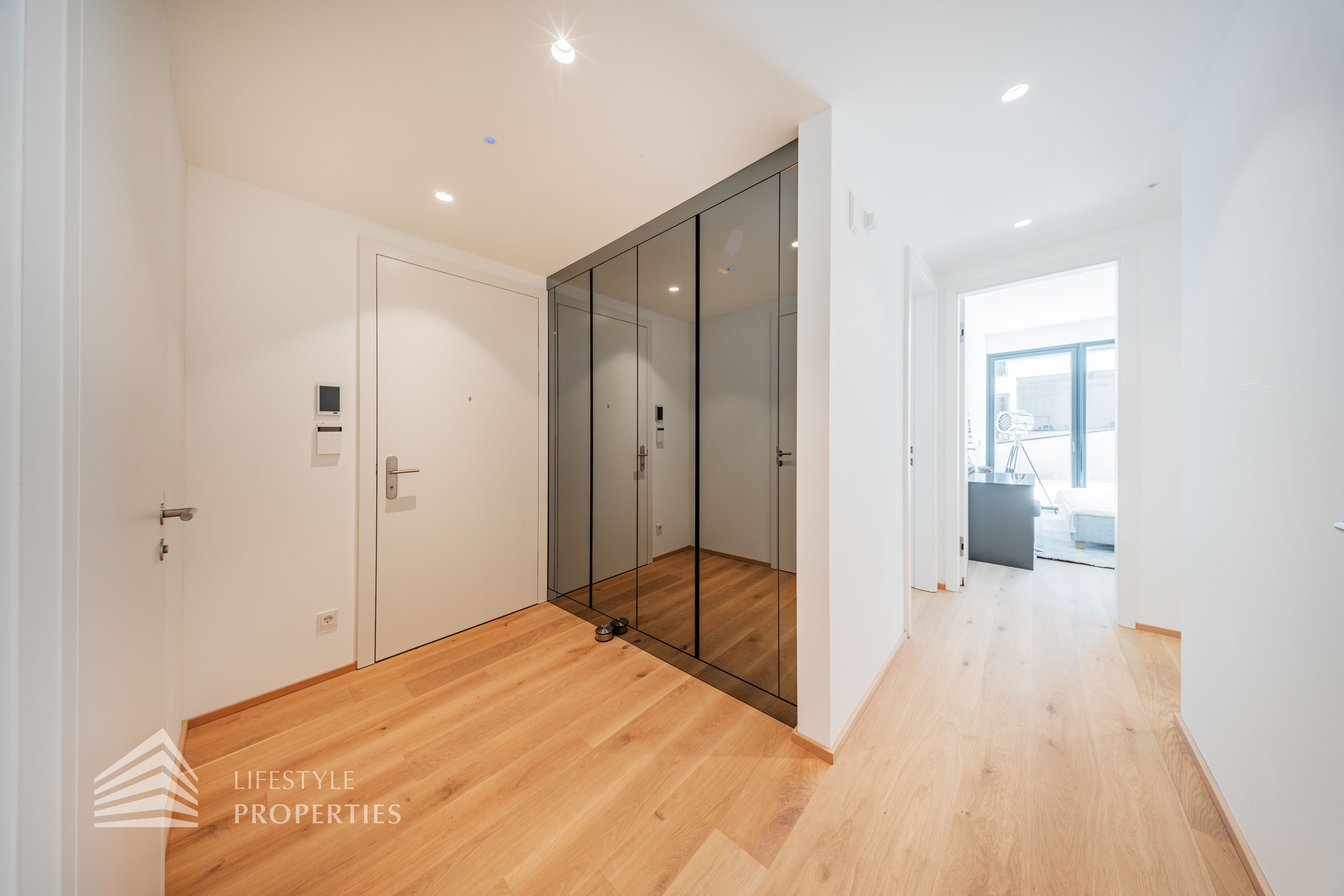 Sie betreten die Wohnung und gelangen in einen einladenden Eingangsbereich. Dieser bietet dank einer praktischen Nische genügend Platz für eine Garderobe. Rechterhand gelangen Sie in den offenen Wohn- und Essbereich, welcher Dank der großen Fenster und Terrassentüren hell und einladend ist. Von hier aus betreten Sie in den knapp 160 m