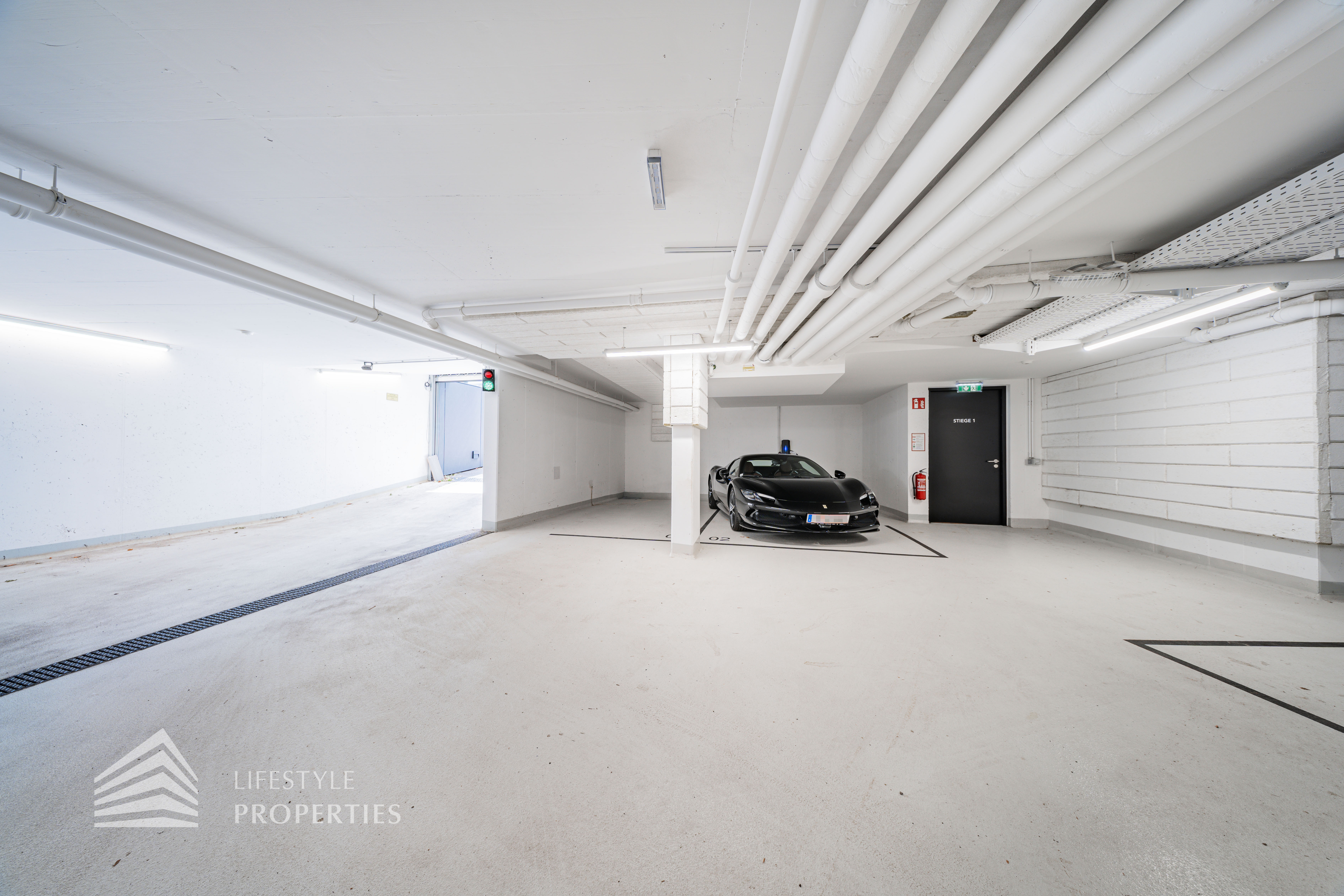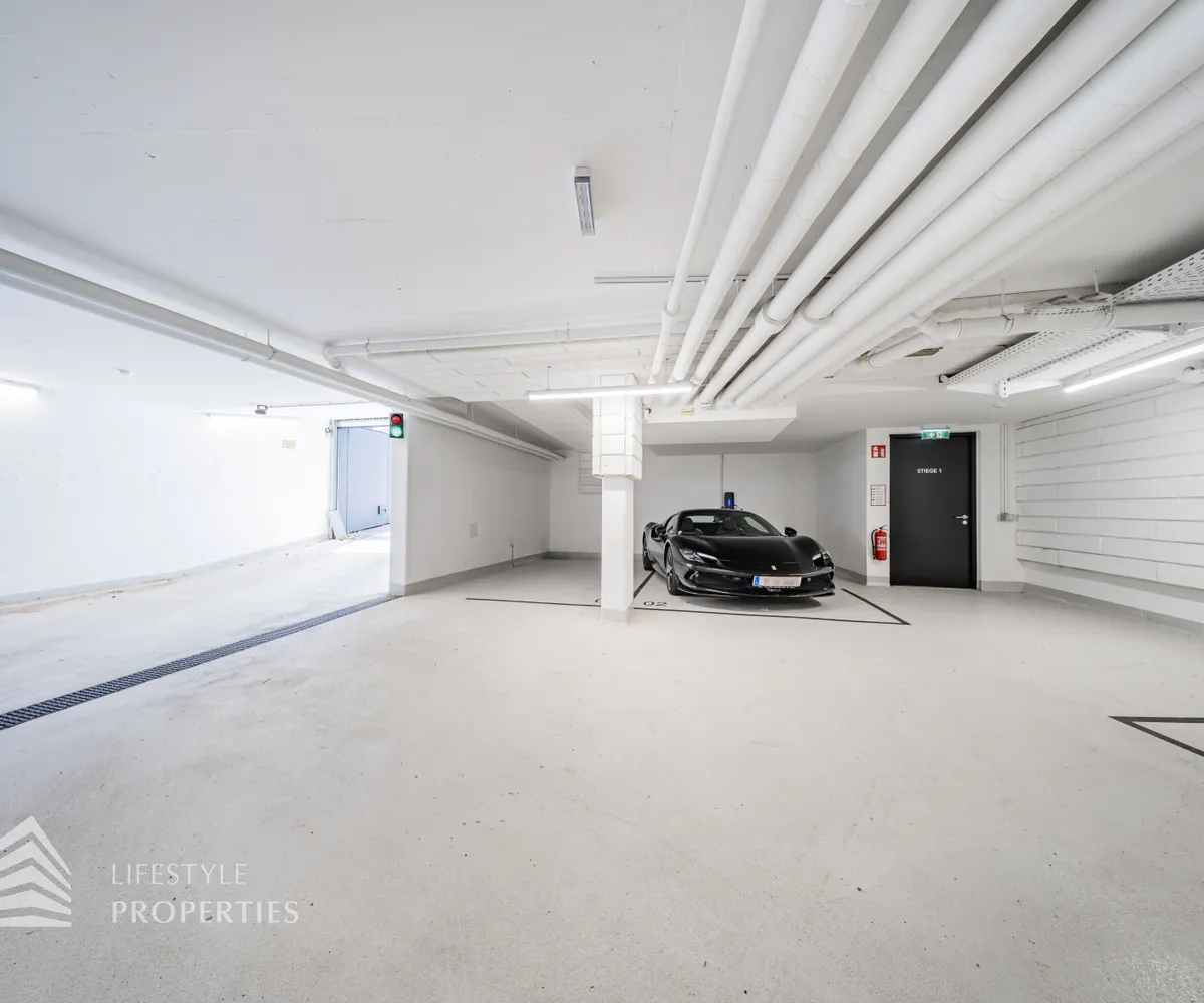 Die Tiefgarage ist über den Lift barrierefrei zu erreichen. Im Untergeschoss befindet sich außerdem der Keller und Fahrradraum.