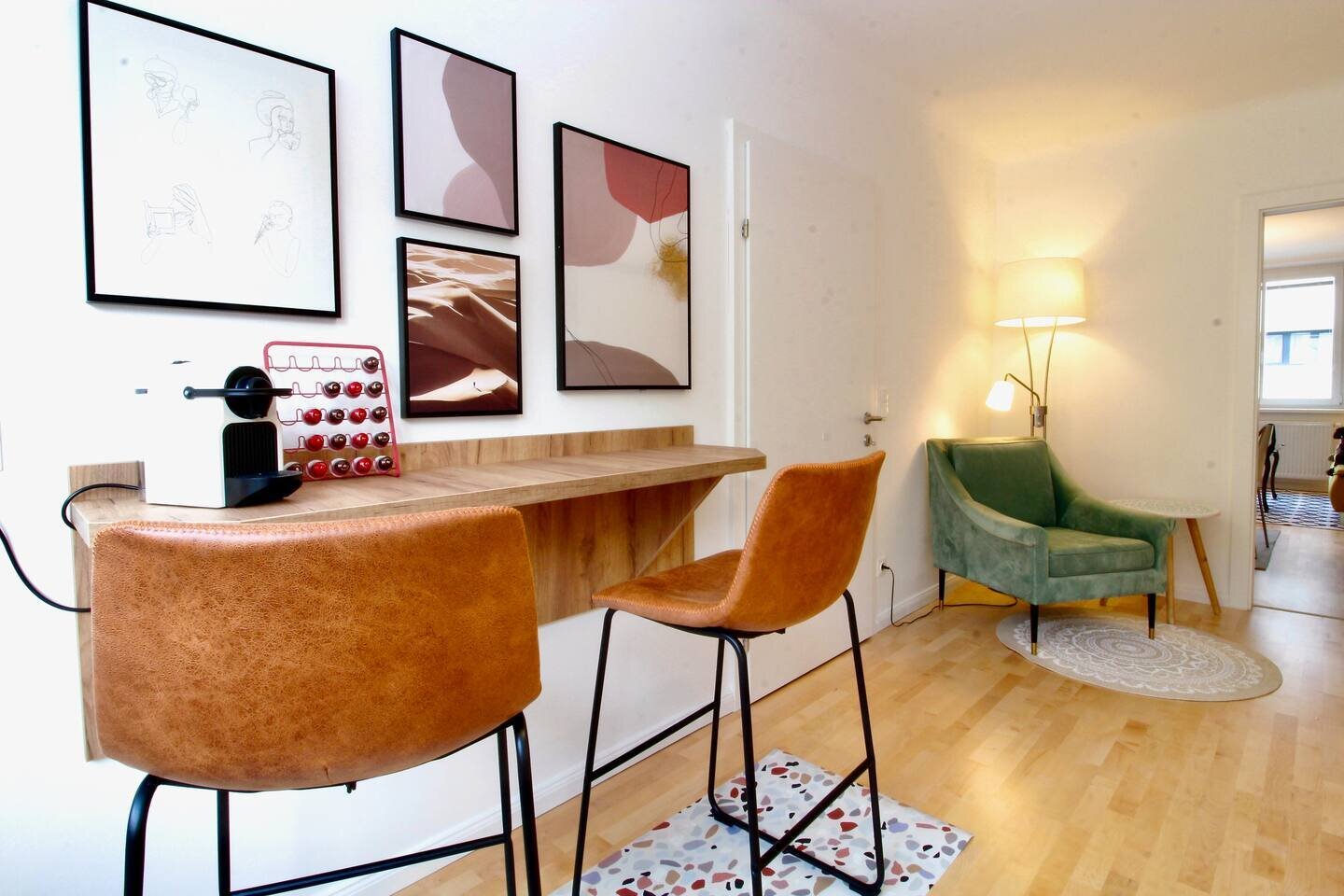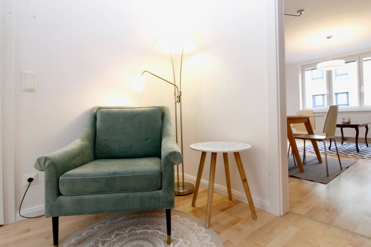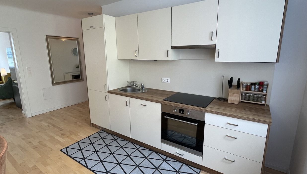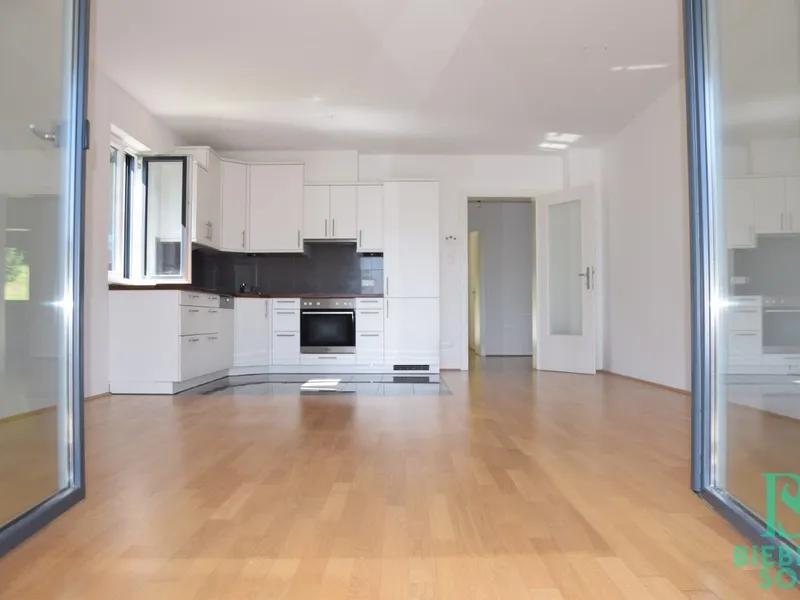 Die Wohnung besticht durch ihre moderne und hochwertige Ausstattung . Sie betreten die Wohnung über den Personenaufzug und gelangen direkt in den großzügigen Wohnbereich . Hier erwartet Sie eine offene und voll ausgestattete Wohnküche , die zum gemeinsamen Kochen und gemütlichen Beisammensein einlädt. Der hochwertige Parkettboden verleiht dem Raum eine warme und einladende Atmosphäre.