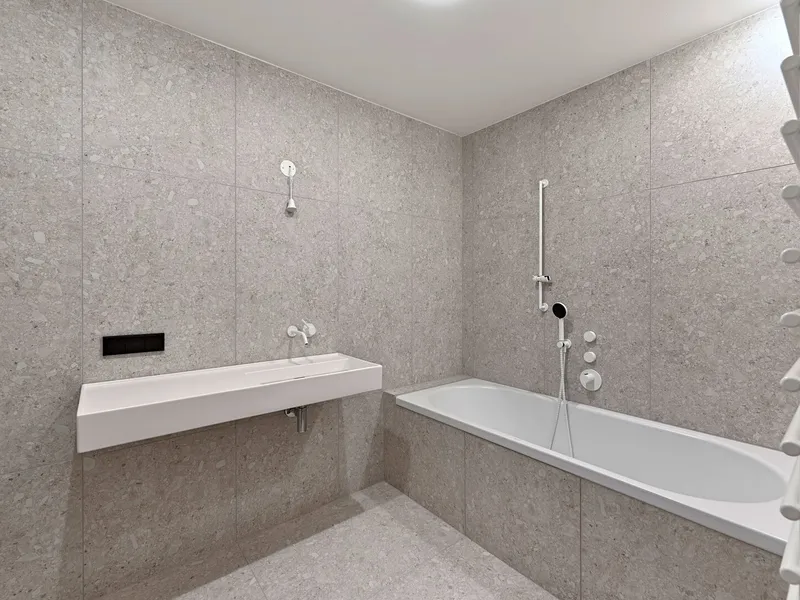 Nicht nur die Räume selbst, sondern auch die Details machen diese Wohnung besonders: Großformatige Fliesen und Sanitäreinrichtungen von Villeroy & Boch verleihen dem Badezimmer luxuriöse Akzente. Originale Elemente fügen sich harmonisch in das Gesamtkonzept ein, während gleichzeitig eine nachhaltige und moderne Wohnqualität gewährleistet wird.