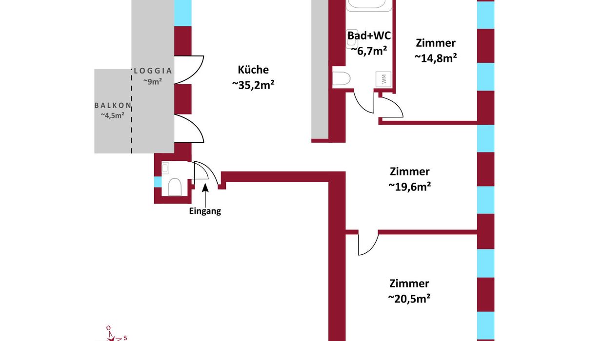 Die 3 Zi. Wohnung mit ca. 98 m² Wohnfläche und ca. 13,51 m² Außenfläche teilt sich wie folgt auf: