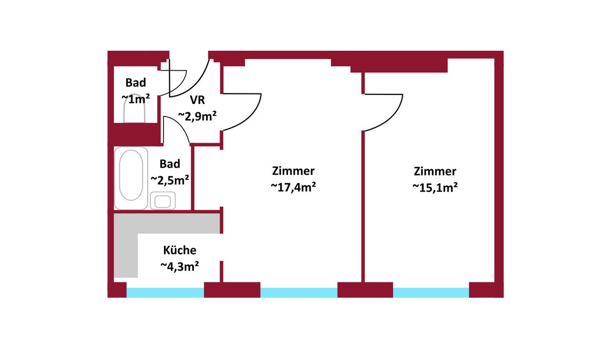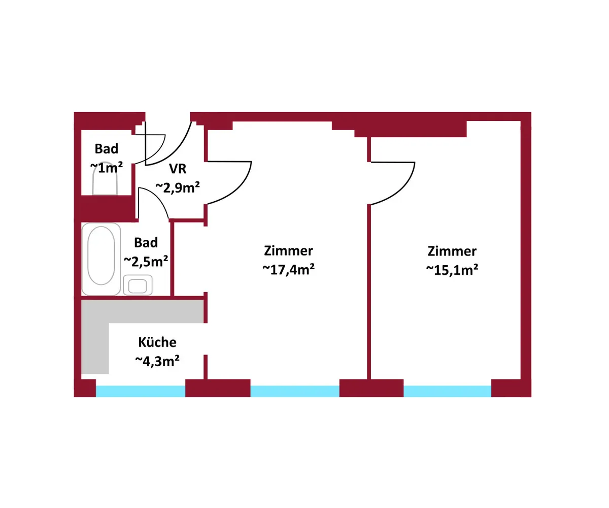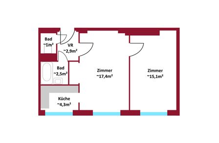 Die Wohnung bietet mit ca. 42 m², zwei Zimmern, Küchennische, Bad mit Wanne und praktischen Schranknischen viel Potenzial .