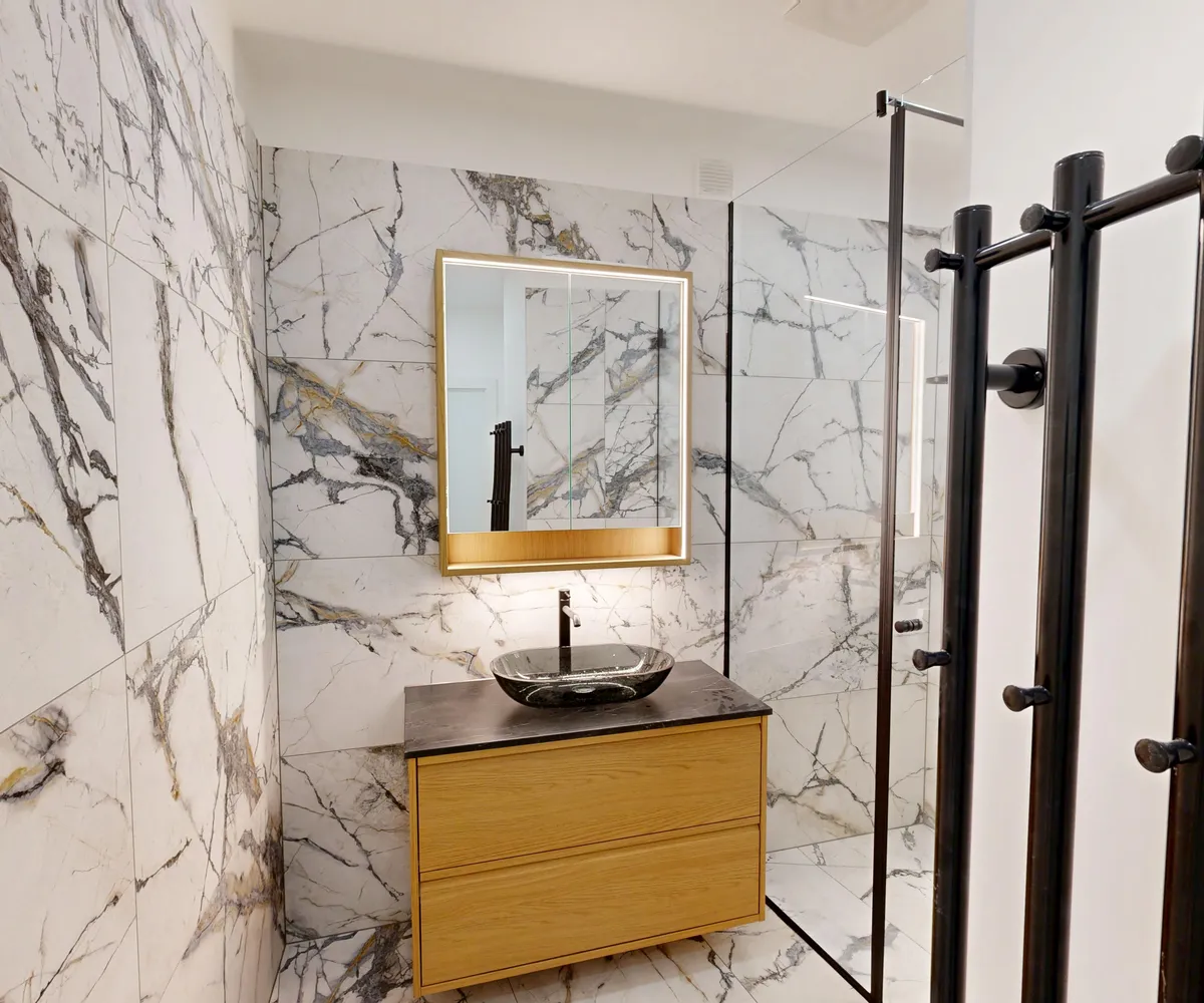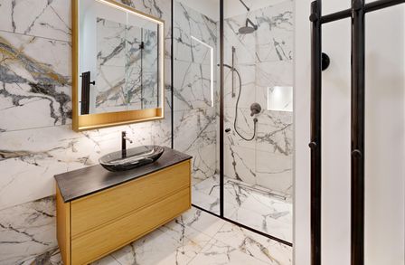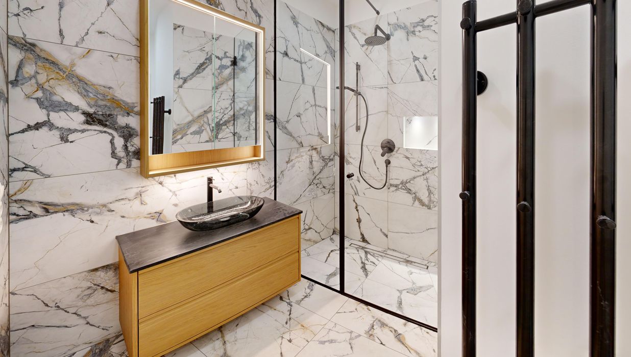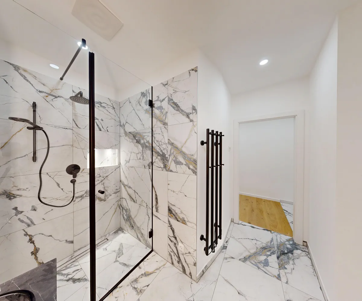 Schon beim Betreten fällt sofort die edle Materialwahl und die hochwertige Ausstattung auf. Das Badezimmer begeistert mit Regendusche, Unterputzarmaturen und schwarzen Design Elementen und vermittelt das Gefühl eines Boutique Hotels, das exklusive Momente schafft.