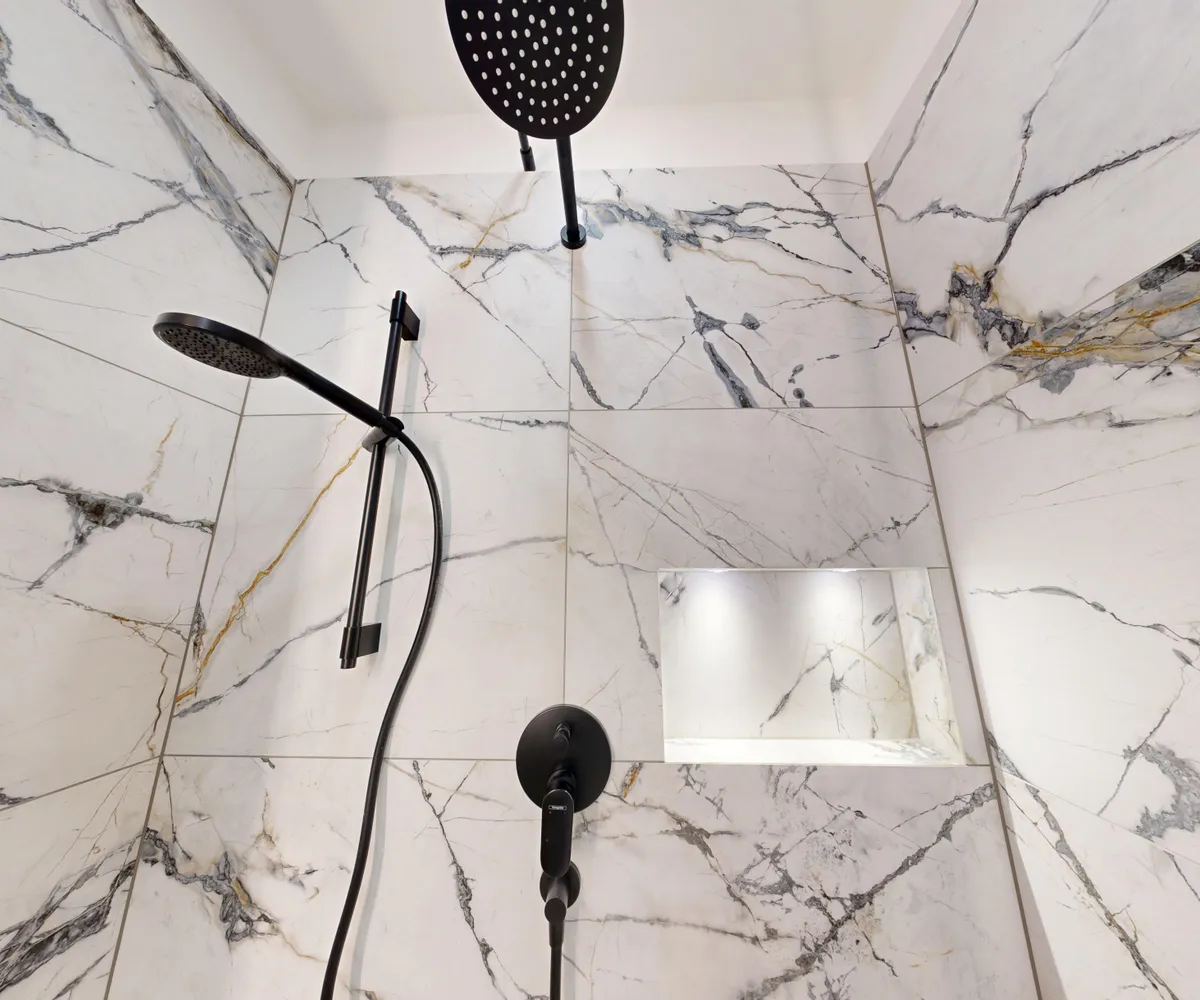 Schwarze Armaturen, Regendusche mit Unterputzarmaturen