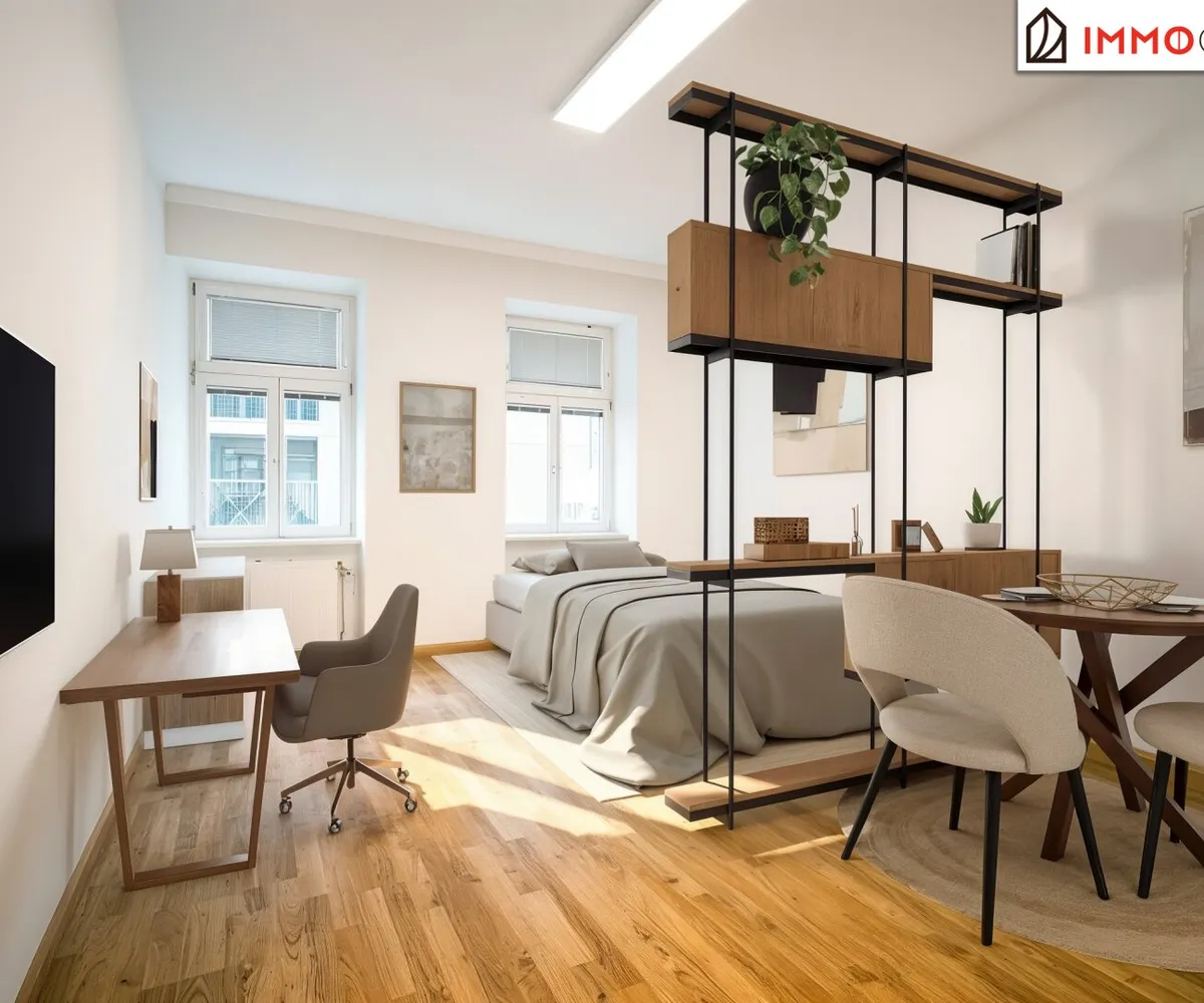Schon beim Eintreten fällt die klare, funktionale Struktur der Wohnung ins Auge: Ein zentral gelegener Vorraum führt in den hellen Wohn- und Schlafbereich, dessen westseitig ausgerichtetes Fenster die Abendsonne einfängt.