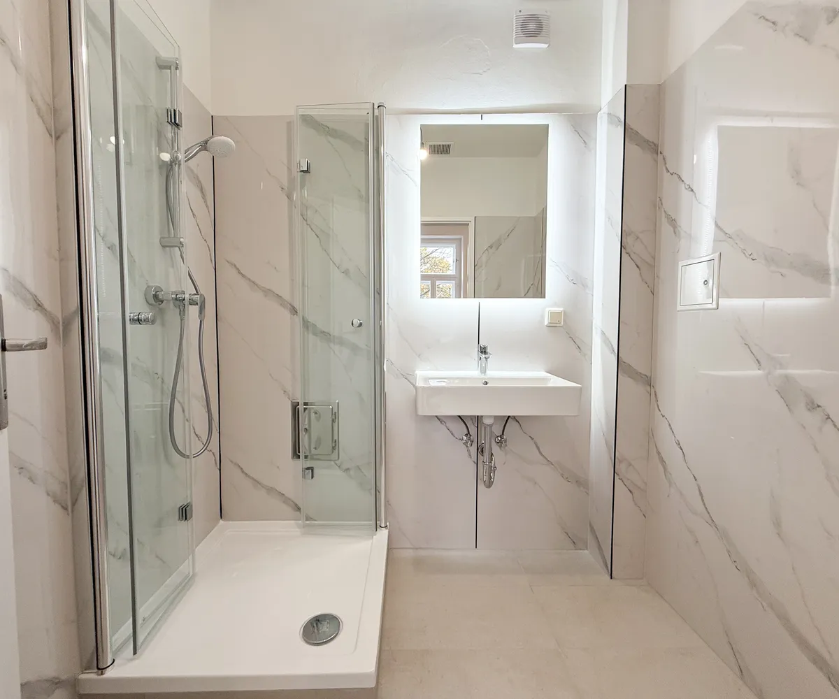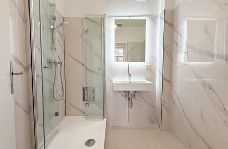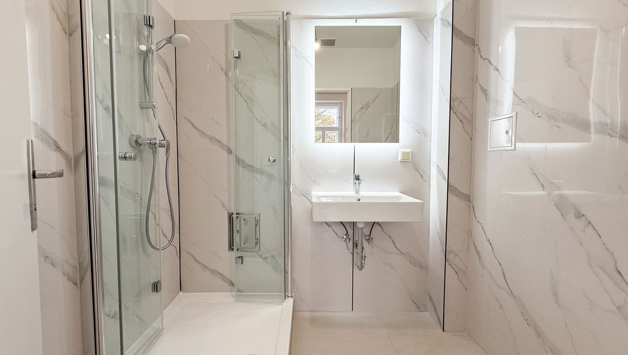Badezimmer mit Dusche, Waschbecken und Waschmaschinenanschluss