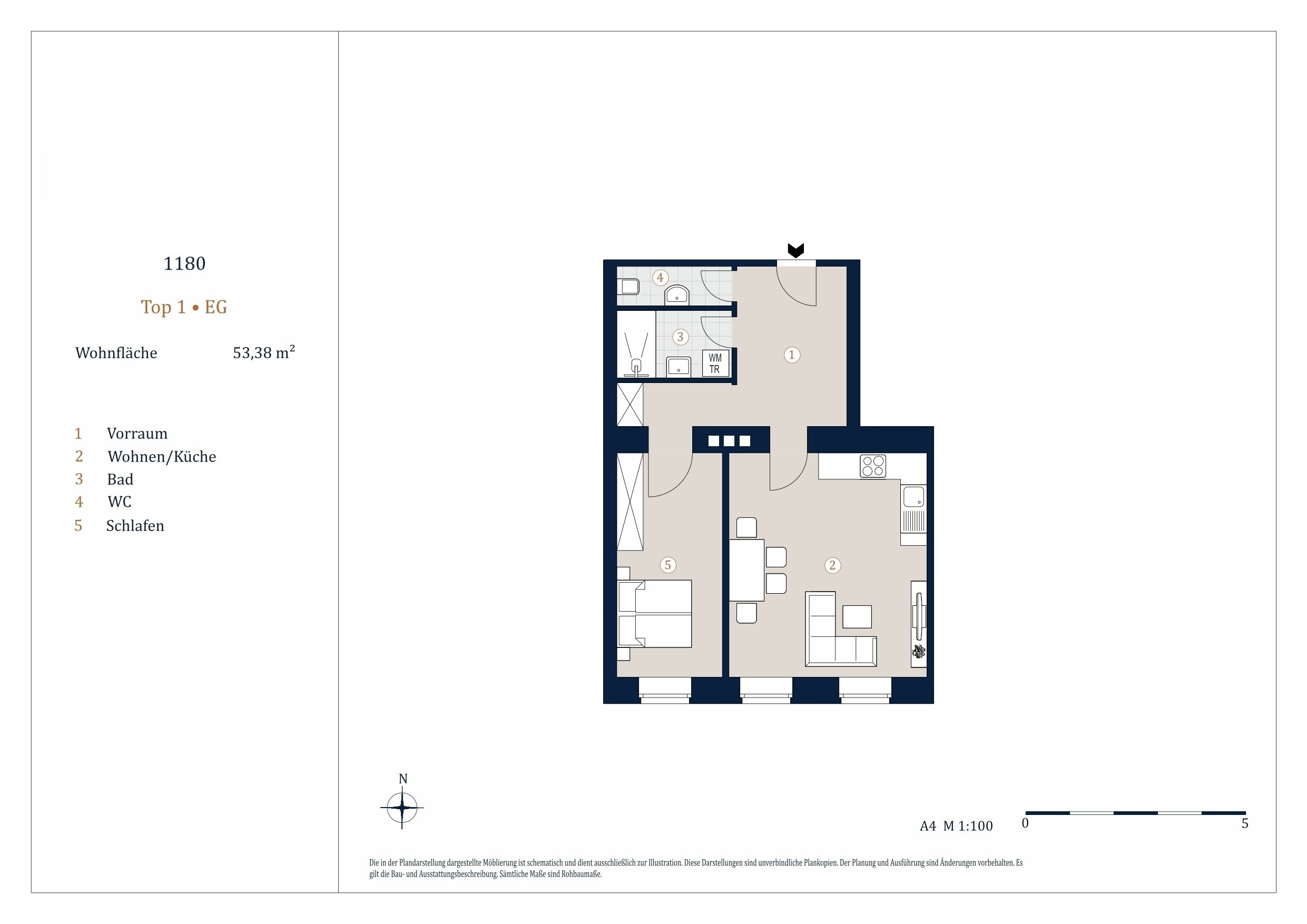 Sie betreten die Wohnung und befinden sich im Vorraum, welcher alle Räumlichkeiten zentral miteinander verbindet. Gerade durch gelangen Sie in die Wohnküche, daneben befindet sich das Schlafzimmer. Sie sind getrennt begehbar. Das Bad ist mit einer Dusche, einem Waschbecken und einem Handtuchtrockner ausgestattet. Das separate WC ist vom Vorraum aus zu erreichen.
