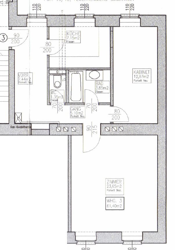 Die Wohnung befindet sich im 1. Stock eines in der Jahrhundertwende erbauten Altbaus und verfügt über eine Größe von ca. 61 m². Diese gliedert sich in einen Vorraum, eine Küche, zwei Zimmer, ein Bad und ein separates WC. Die Wohnräume sind mit schönem Parkett ausgestattet, die Nassräume sind verfliest.