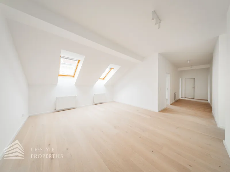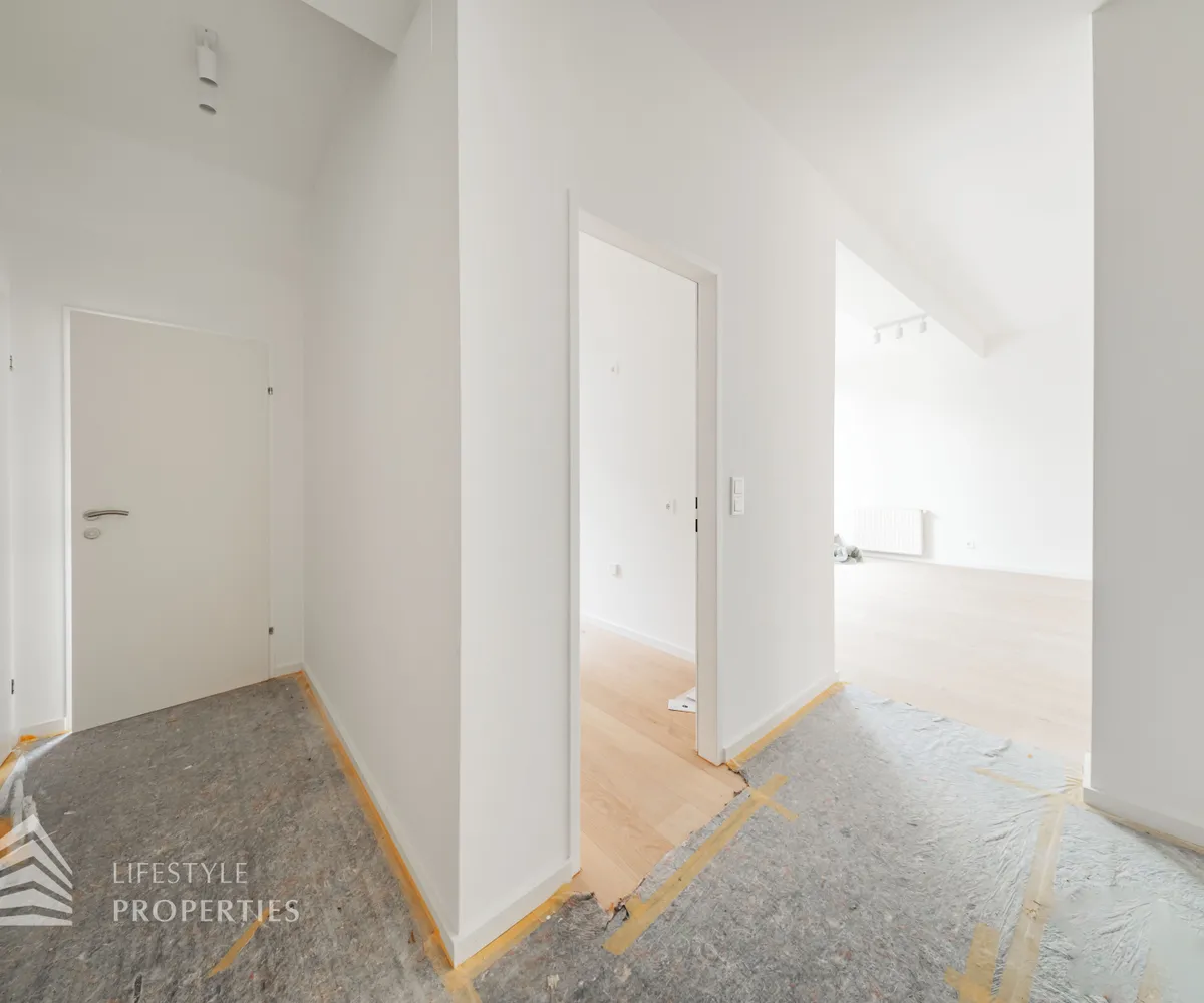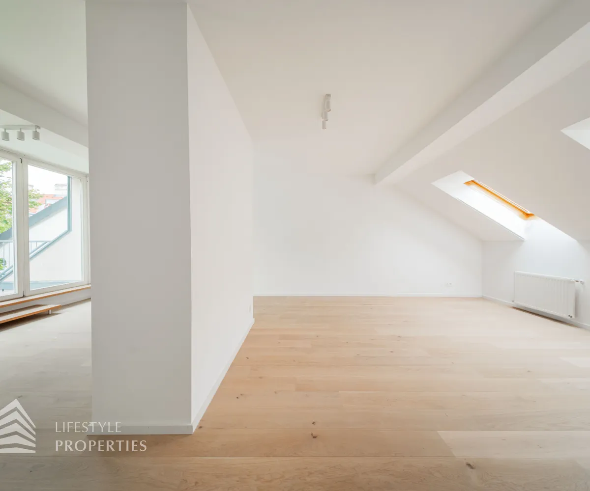 Bei Betreten der Wohnung gelangen Sie in den großzügigen Vorraum, an der Küche vorbei, gelangen Sie nahtlos in das offen gestaltete ca. 39 m² große Wohnzimmer mit Zugang zur Terrasse. Eine Mauer im Wohnraum schafft eine gedankliche Raumtrennung zwischen Ess- und Wohnbereich. Die schrägen Dachfenster sorgen für viel natürliches Tageslicht, den ganzen Tag über. Vom Wohnraum aus gelangen Sie über einen Gang zu den zwei ca. 13 m² großen Schlafzimmern. Am Ende des Ganges befindet sich das Badezimmer. Das separate WC befindet sich direkt beim Eingang.
