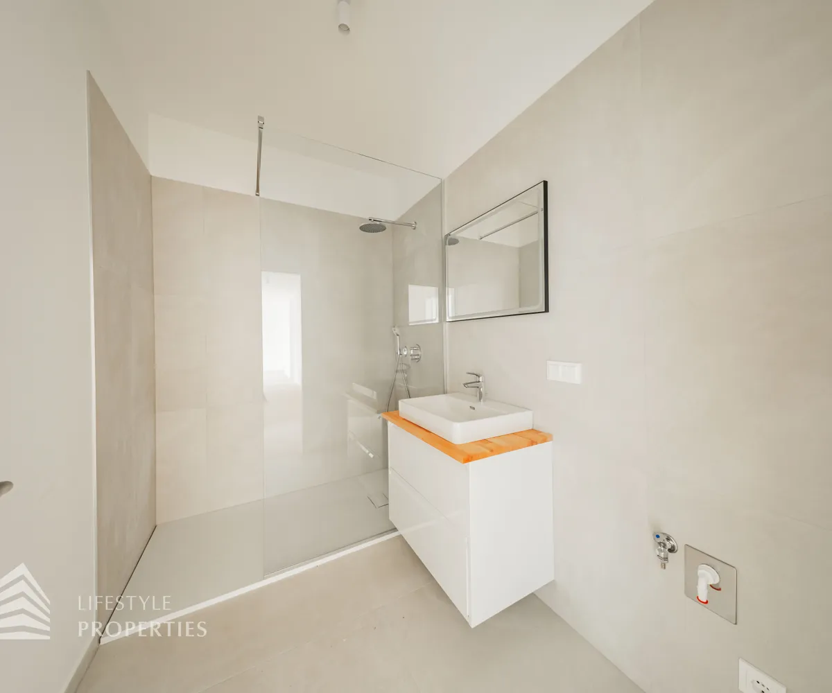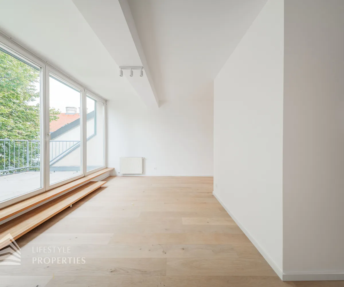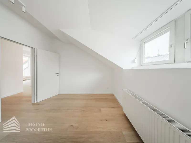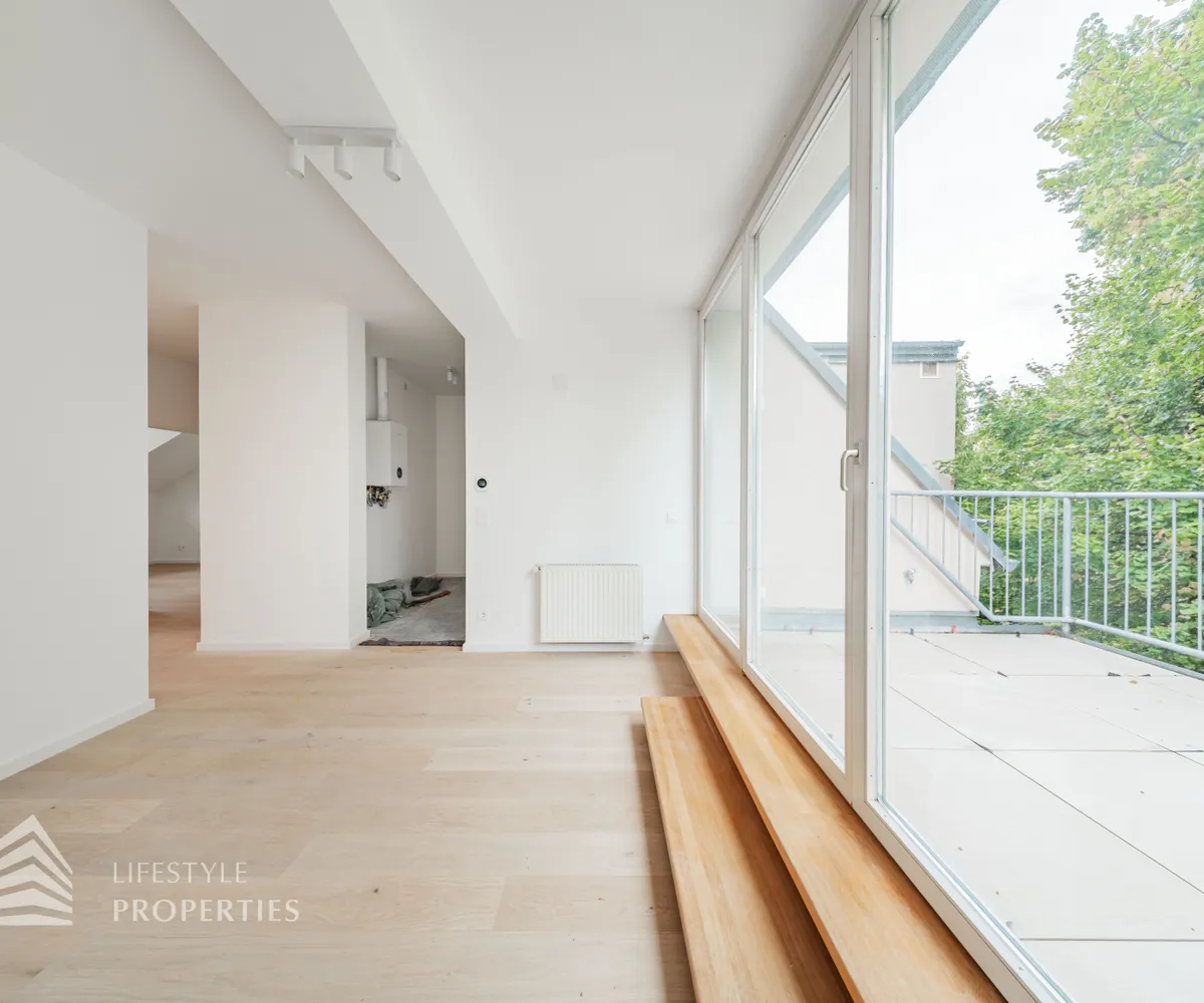 Bei Betreten der Wohnung gelangen Sie in den großzügigen Vorraum, an der Küche vorbei, gelangen Sie nahtlos in das offen gestaltete ca. 39 m² große Wohnzimmer mit Zugang zur Terrasse. Eine Mauer im Wohnraum schafft eine gedankliche Raumtrennung zwischen Ess- und Wohnbereich. Die schrägen Dachfenster sorgen für viel natürliches Tageslicht, den ganzen Tag über. Vom Wohnraum aus gelangen Sie über einen Gang zu den zwei ca. 13 m² großen Schlafzimmern. Am Ende des Ganges befindet sich das Badezimmer. Das separate WC befindet sich direkt beim Eingang.