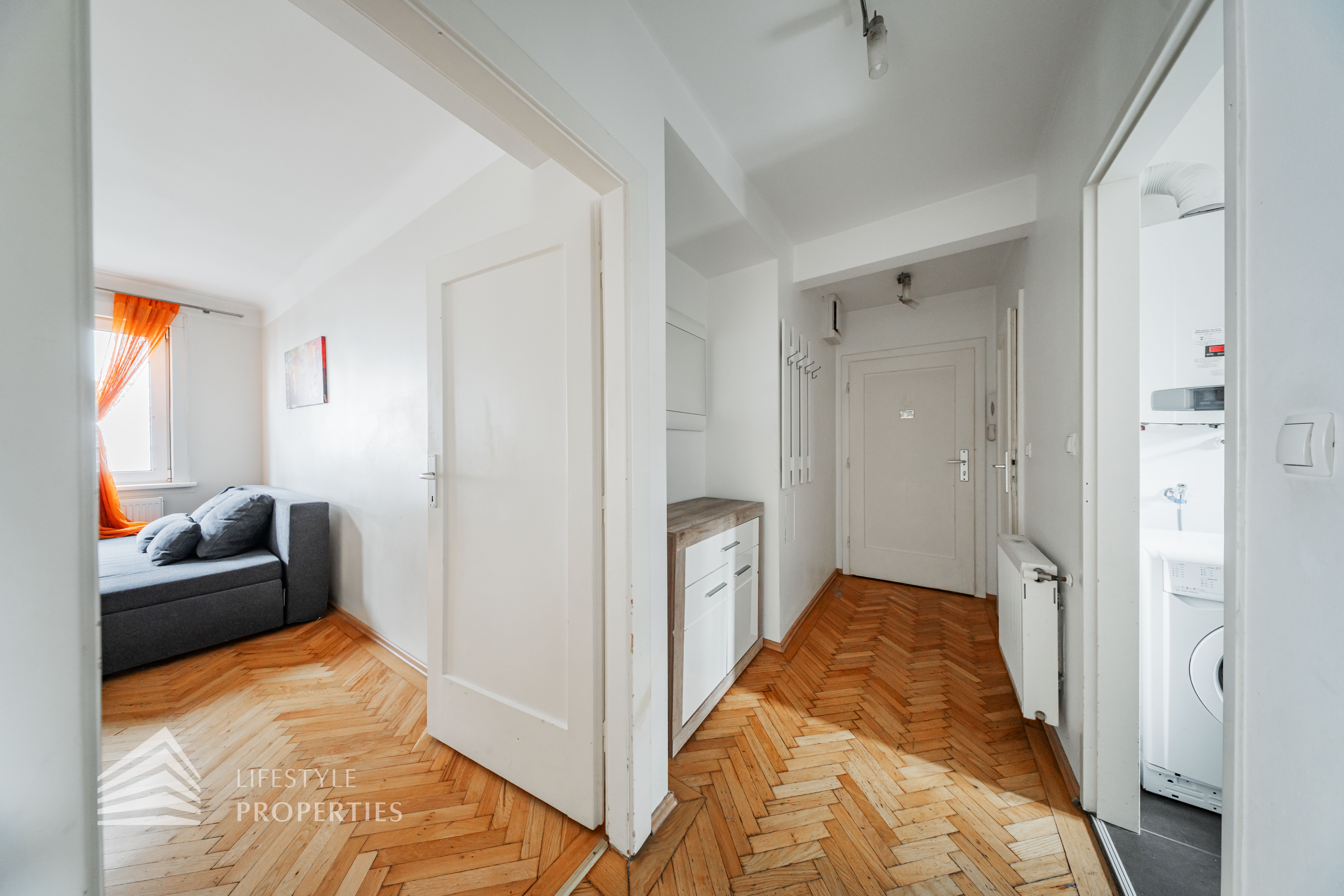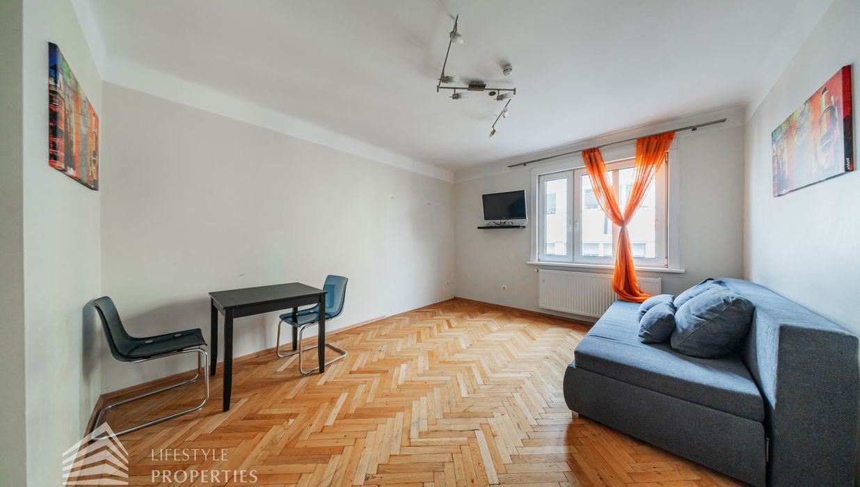 Sie betreten die Wohnung und befinden sich im Vorraum. Gerade durch gelangen Sie in das Schlafzimmer. Rechterhand befindet sich das Wohnzimmer. Die Küche ist voll ausgestattet und bietet Platz für einen Tisch. Das Bad ist mit einer Dusche und einem Waschbecken ausgestattet. Das separate WC ist auch vom Vorraum erreichbar.
