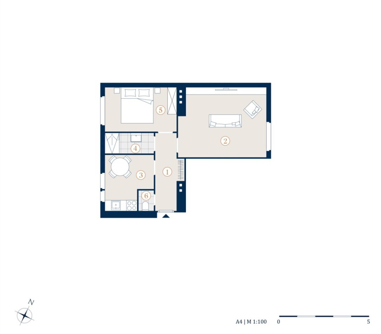 Die Wohnung gliedert sich in einen Vorraum, einen Wohnraum, ein Schlafzimmer, eine Küche, ein Badezimmer und ein separates WC.