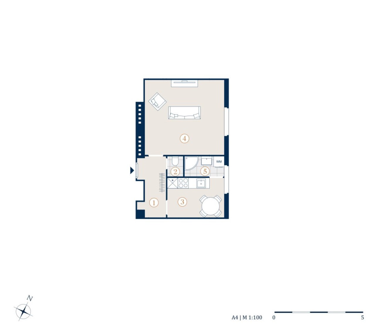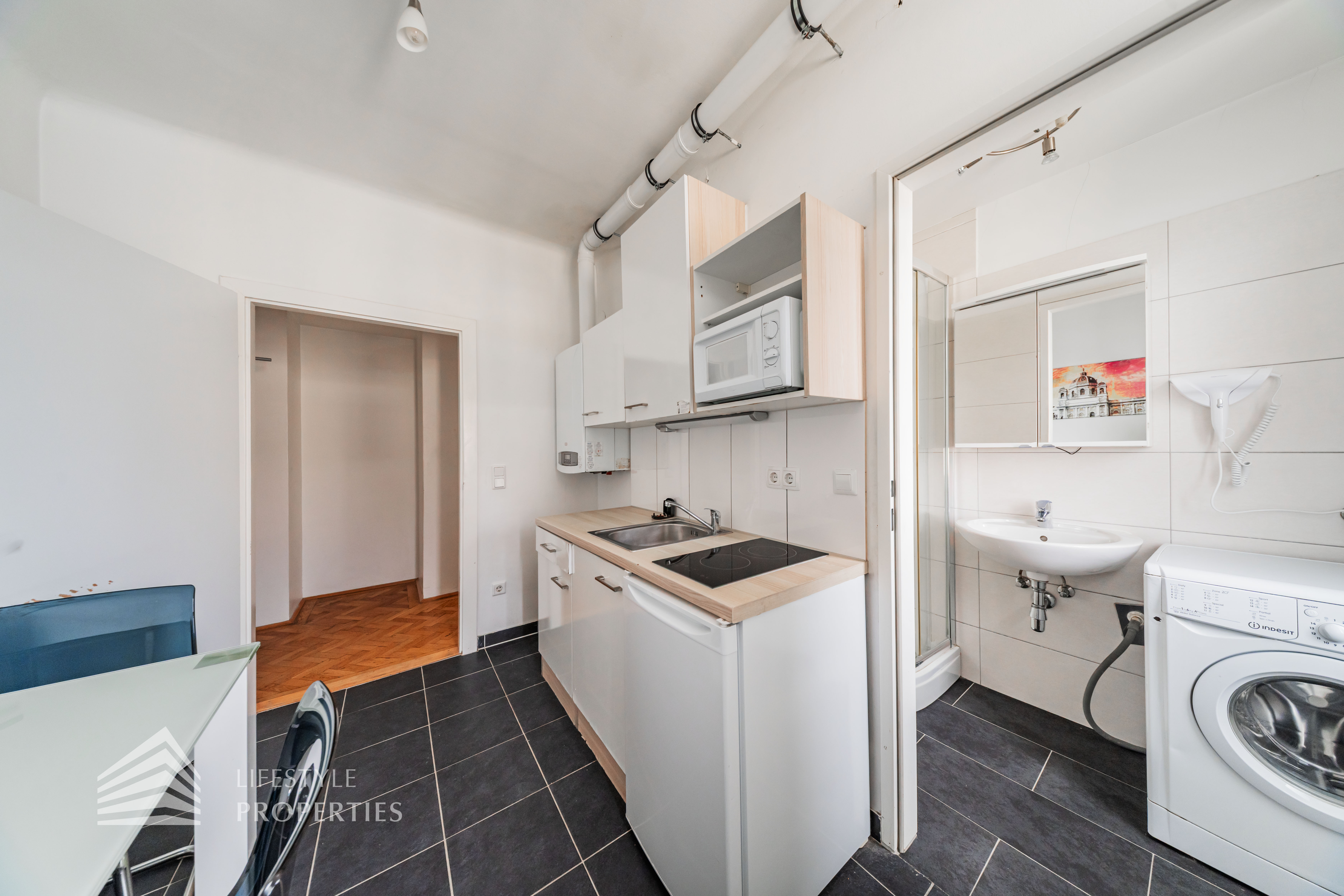 Die Wohnung gliedert sich in einen Vorraum, einen Wohn- Schlafraum, eine Küche, ein Badezimmer und ein separates WC.