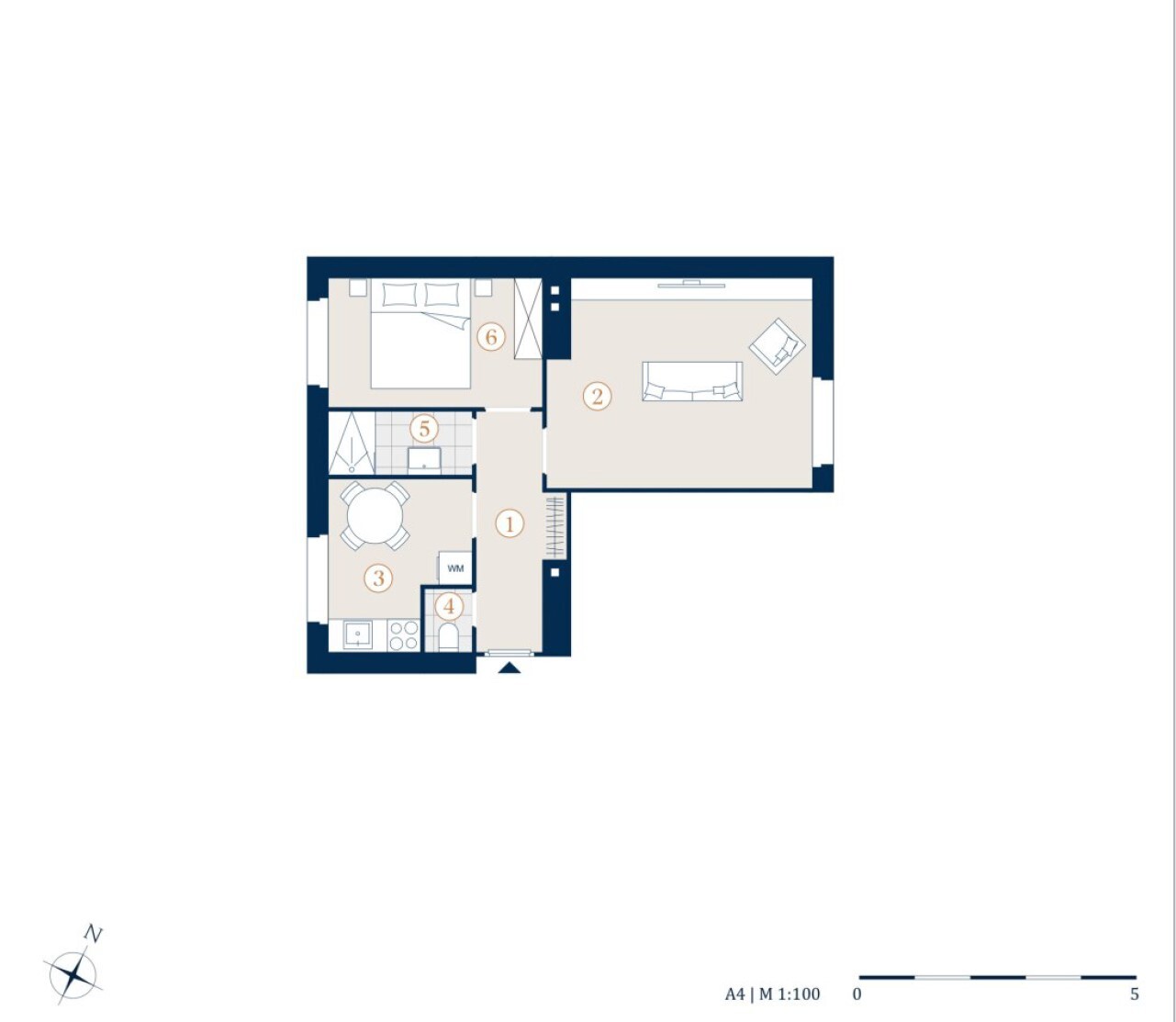 Die Wohnung gliedert sich in einen Vorraum, einen Wohnraum, ein Schlafzimmer, eine Küche, ein Badezimmer und ein separates WC.