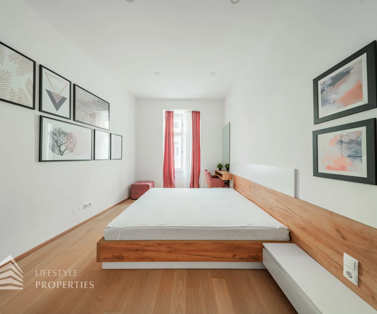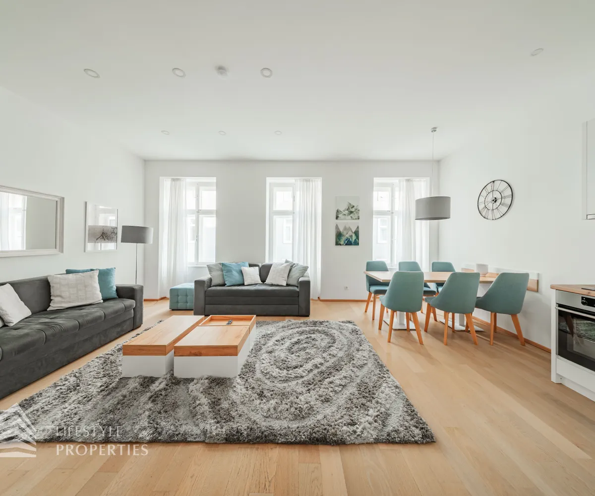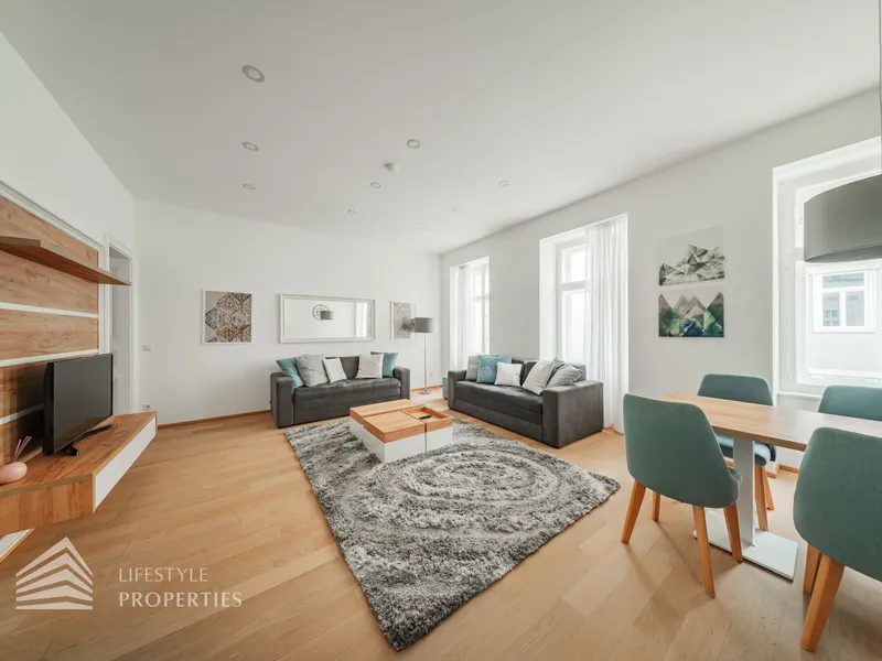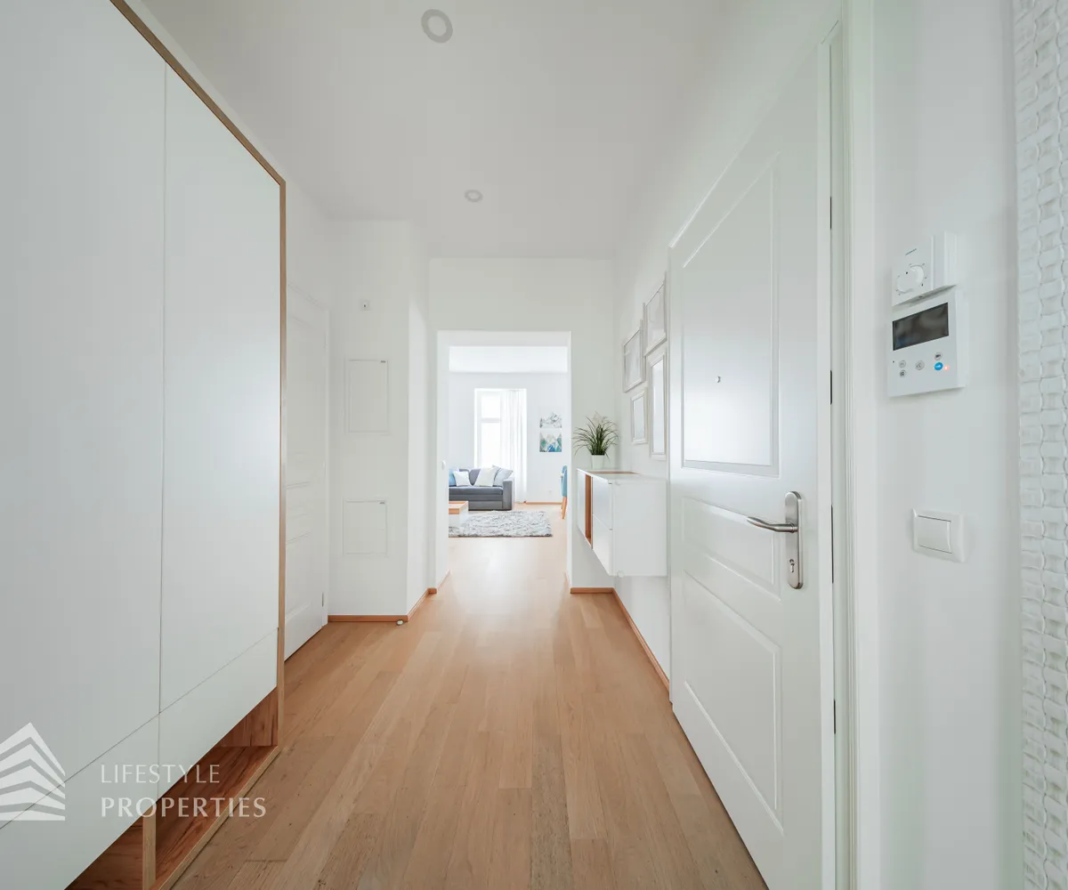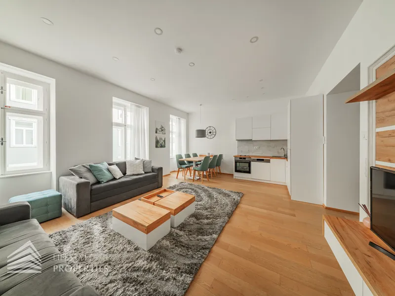 Diese hochwertige 3-Zimmer-Eigentumswohnung befindet sich im 2. Liftstock eines vor ungefähr 5 Jahren sanierten Hauses. Die Wohnung bietet auf ca. 75 m² Wohnfläche modernen Komfort, ergänzt durch einen Balkon von ca. 8 m² mit Wasseranschluss zum ruhigen Innenhof. In puncto Ausstattung überzeugt diese Wohnung mit hochwertigen Materialien und technischer Raffinesse: Ein eleganter Tarkett-Boden in allen Wohnräumen verleiht Wärme und Harmonie. Vollholztüren und dezente Designakzente schaffen eine warme Atmosphäre. Das Beleuchtungskonzept mit dimmbaren Zonen unterstreicht das moderne Raumgefühl, während deckenintegrierte Vorhangsysteme mit maßgeschneiderten Stoffen eine harmonische Einheit ergeben. Die Küche ist nach Maß gefertigt und ausgestattet mit Geräten namhafter Hersteller sowie hochwertigen Armaturen. Eine Split-Klimaanlage mit Außeneinheit sorgt für angenehme Temperaturen. Die Wohnung wurde kürzlich frisch ausgemalt und ist sofort bezugsfertig. Beheizt wird mittels Gas-Fußbodenheizung.