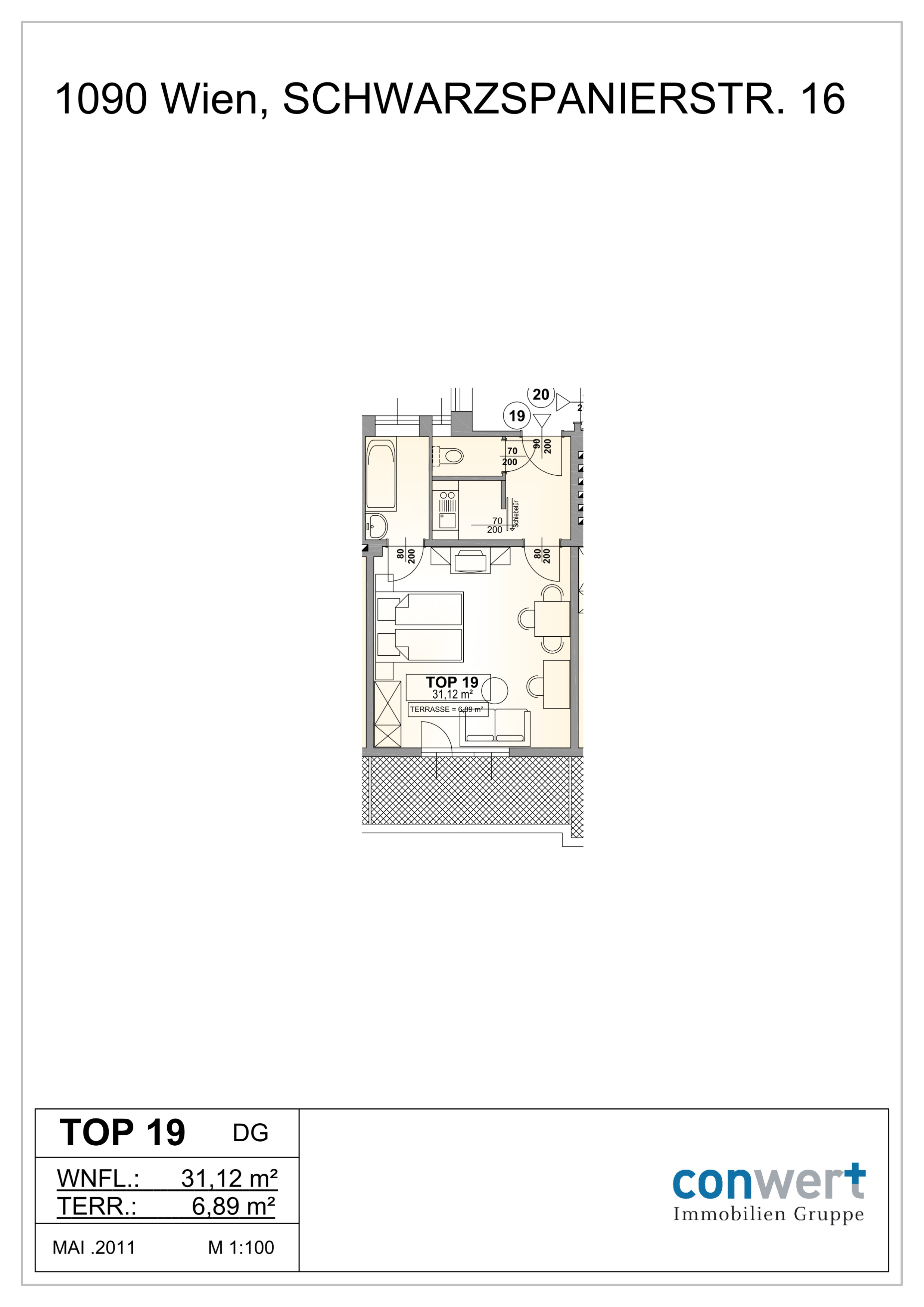 Die Wohnung befindet sich im Dachgeschoß und verfügt über einen Vorraum, ein Wohn-Schlafzimmer, eine Küche, ein Badezimmer und eine separate Toilette.