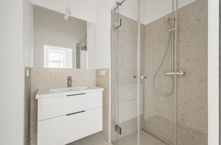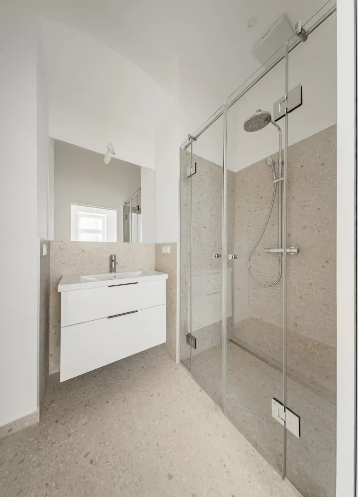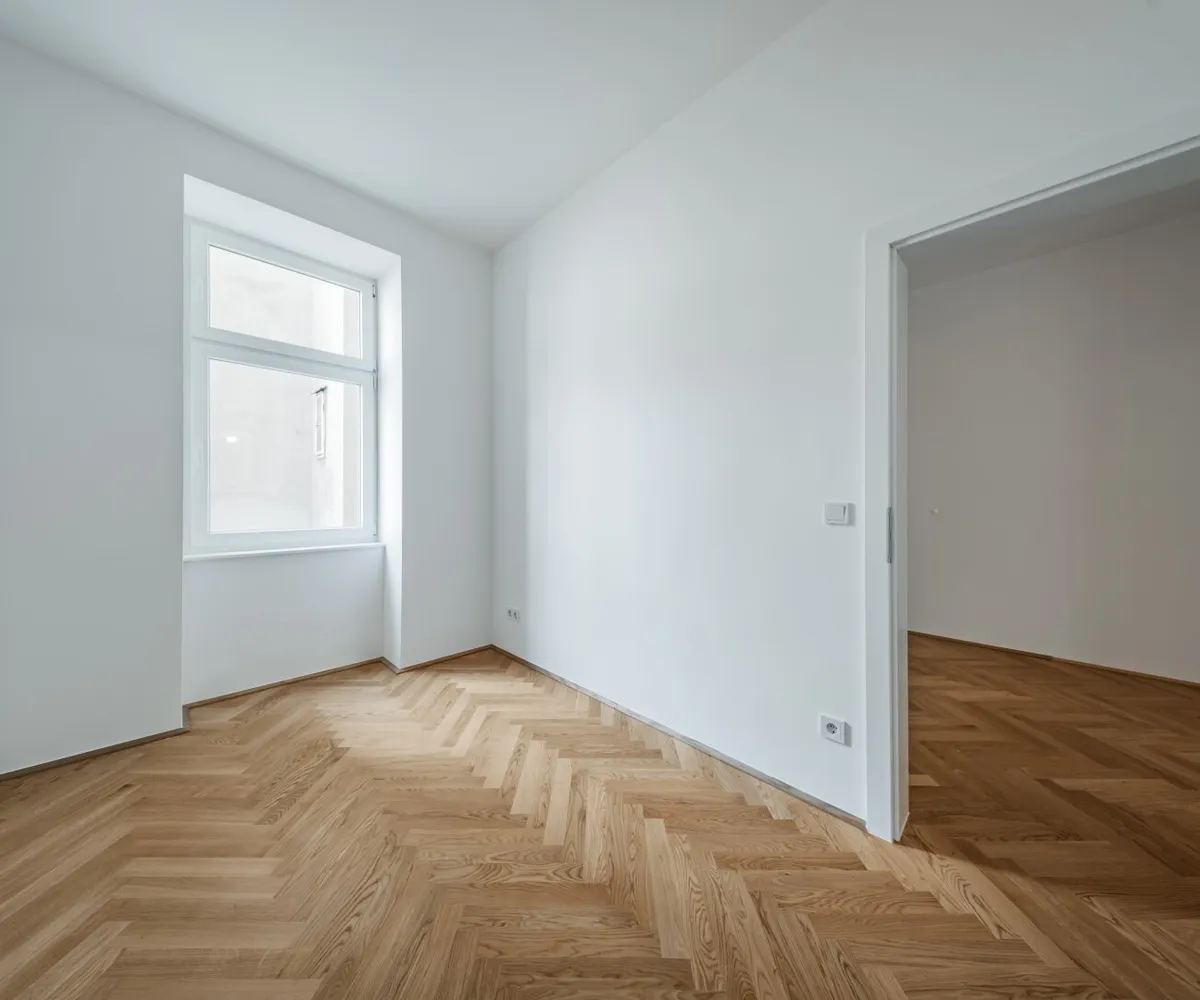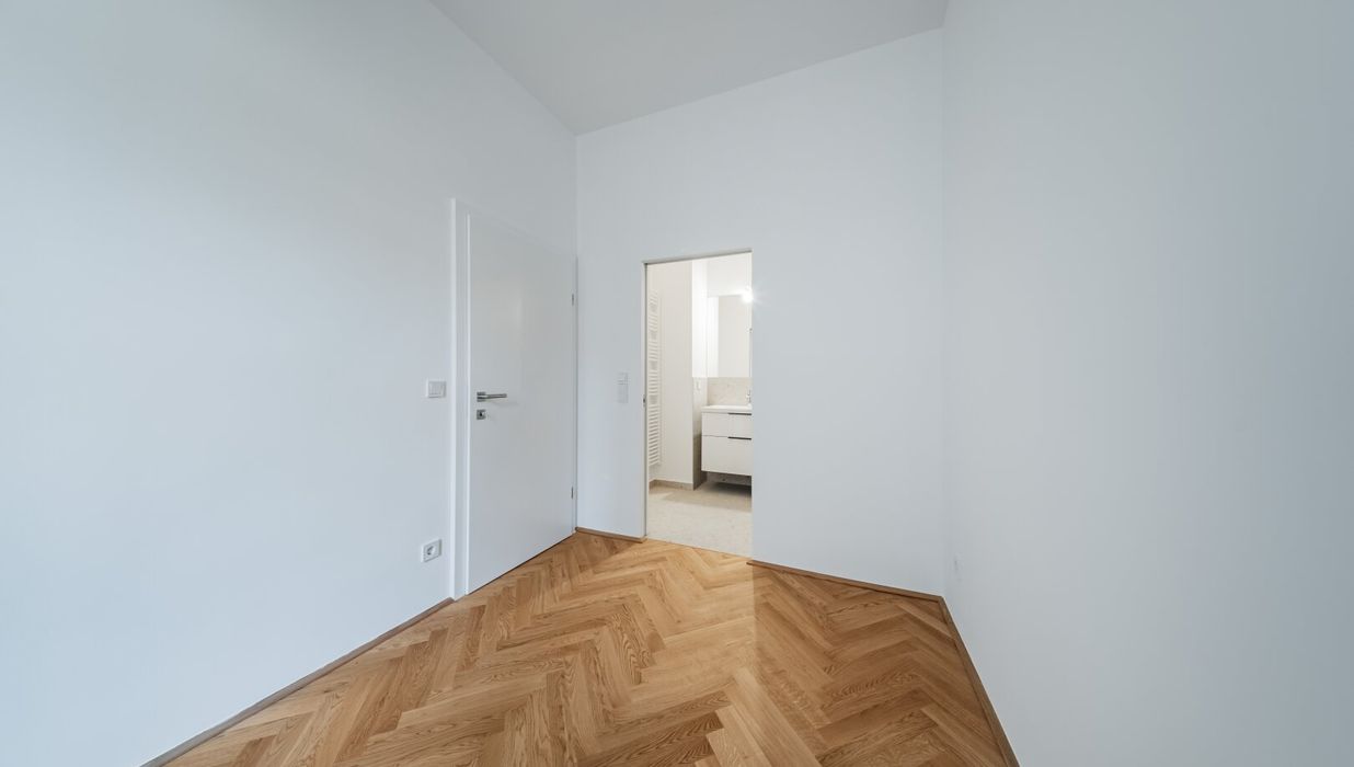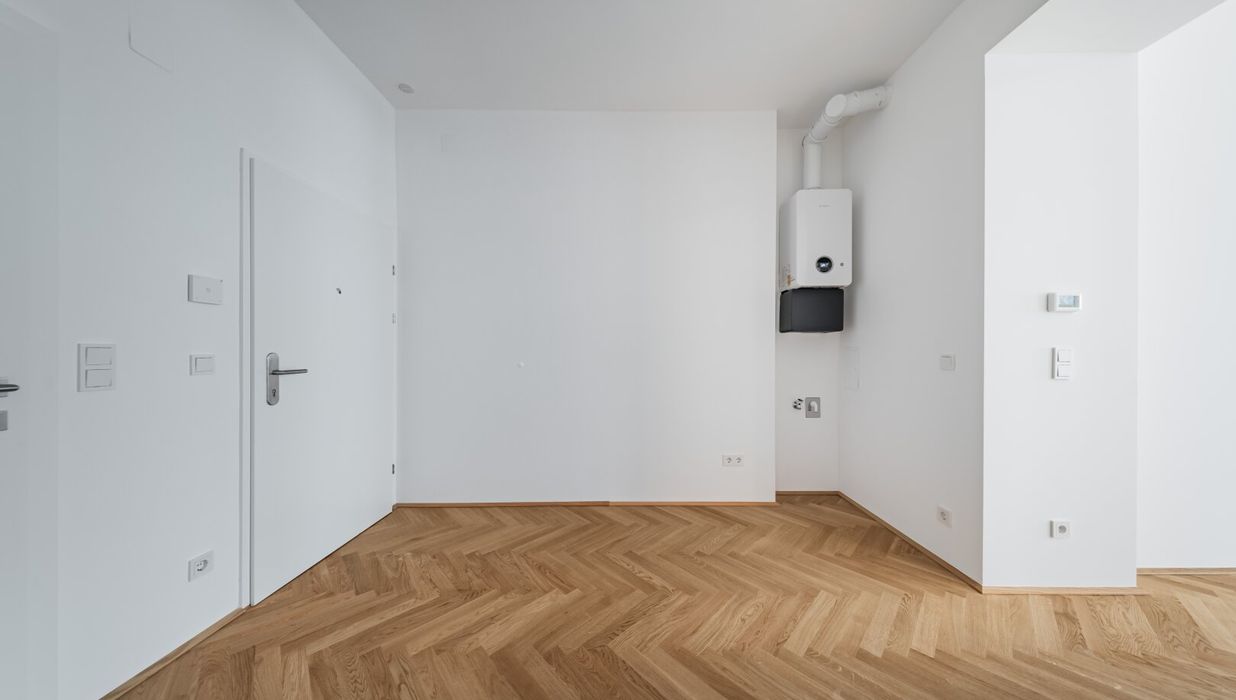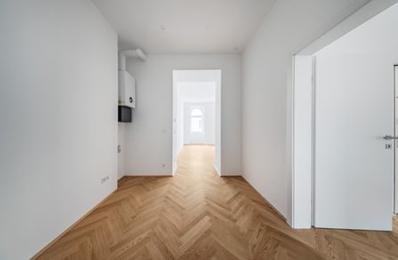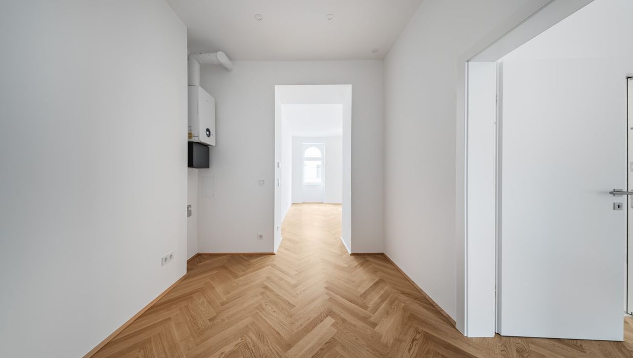 Über den Vorraum mit Waschmaschinenanschluss gelangt man in die straßenseitige Wohnküche, das hofseitige Schlafzimmer sowie in das Bad mit Walk-In-Dusche und das separate WC.