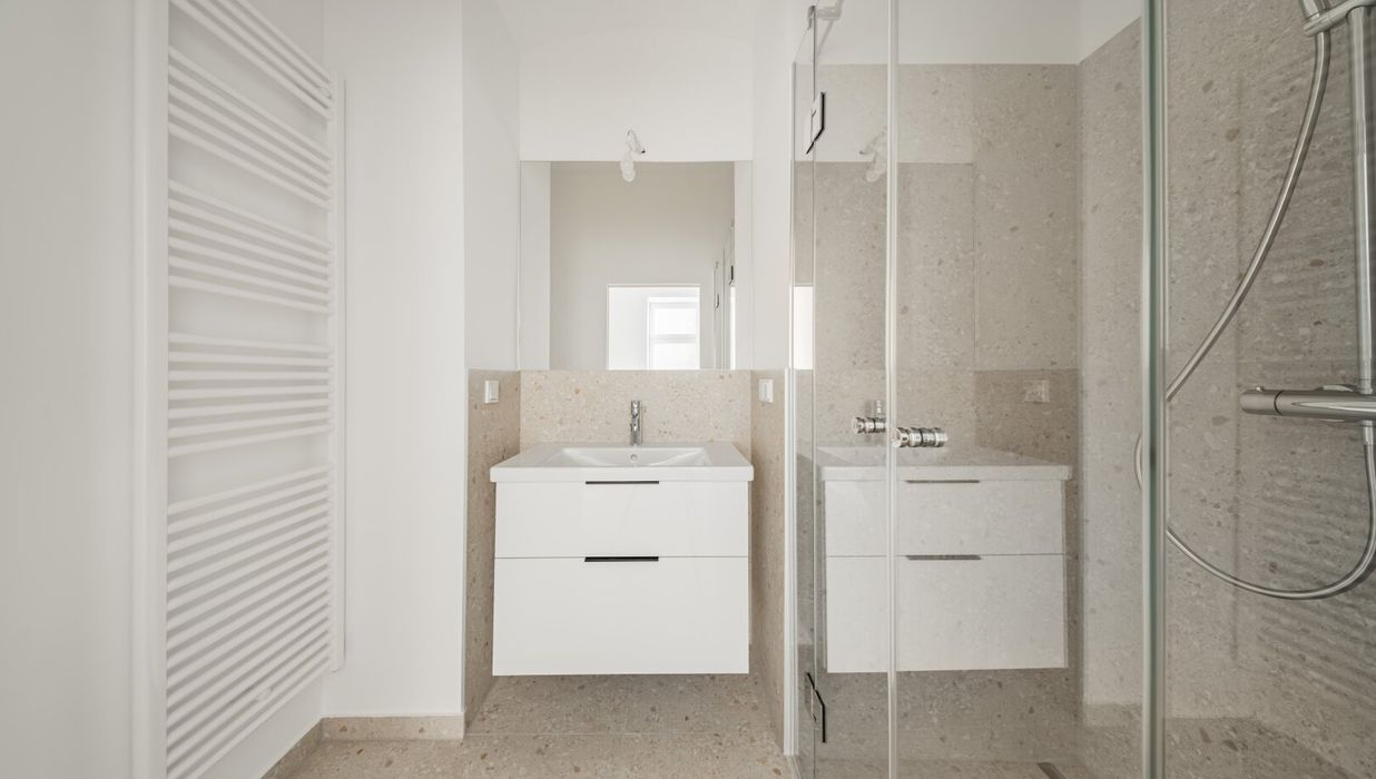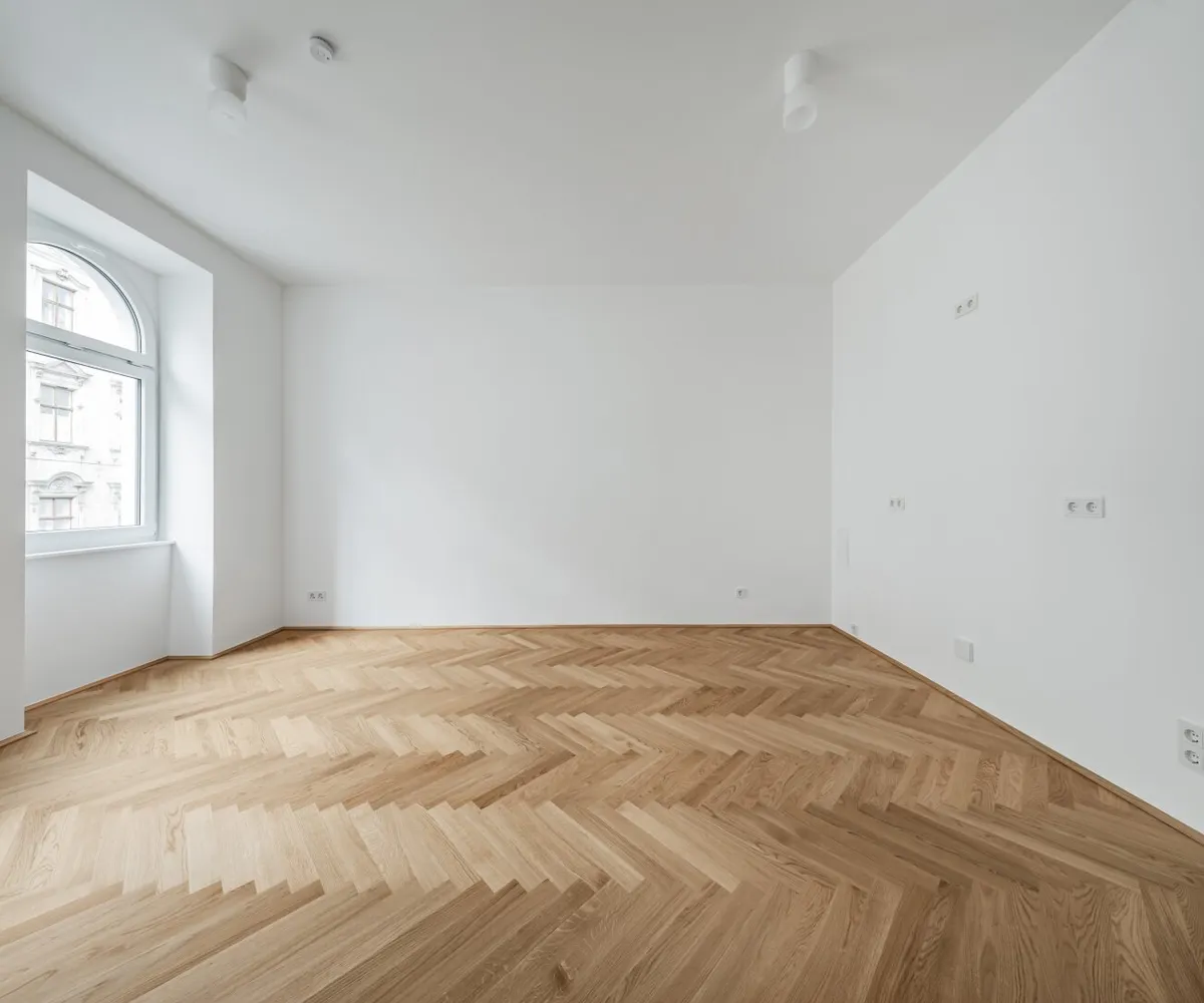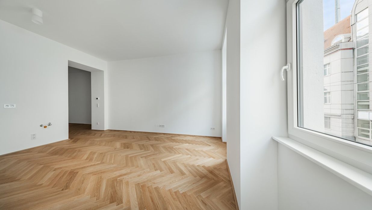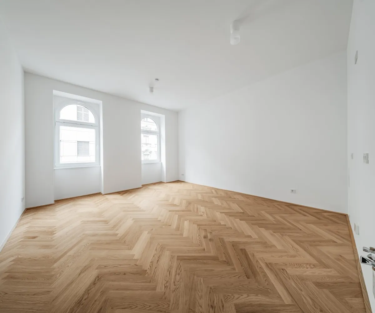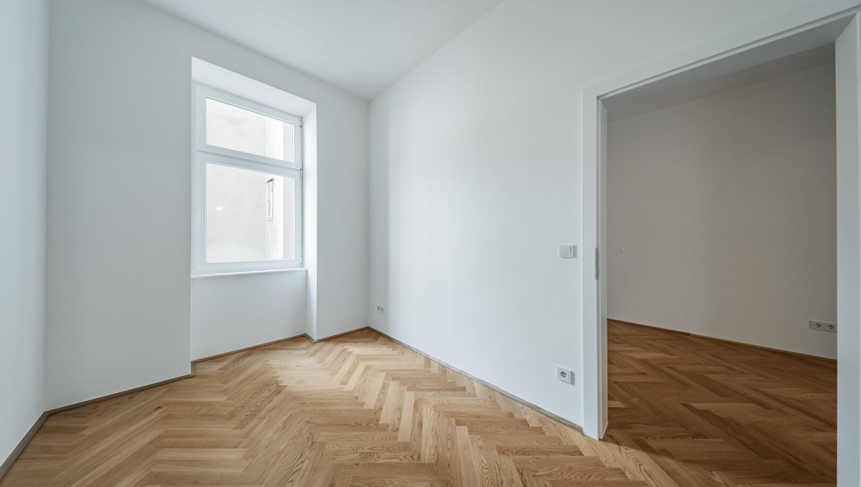 Über den Vorraum mit Waschmaschinenanschluss gelangt man in die straßenseitige Wohnküche, das hofseitige Schlafzimmer sowie in das Bad mit Walk-In-Dusche und das separate WC.